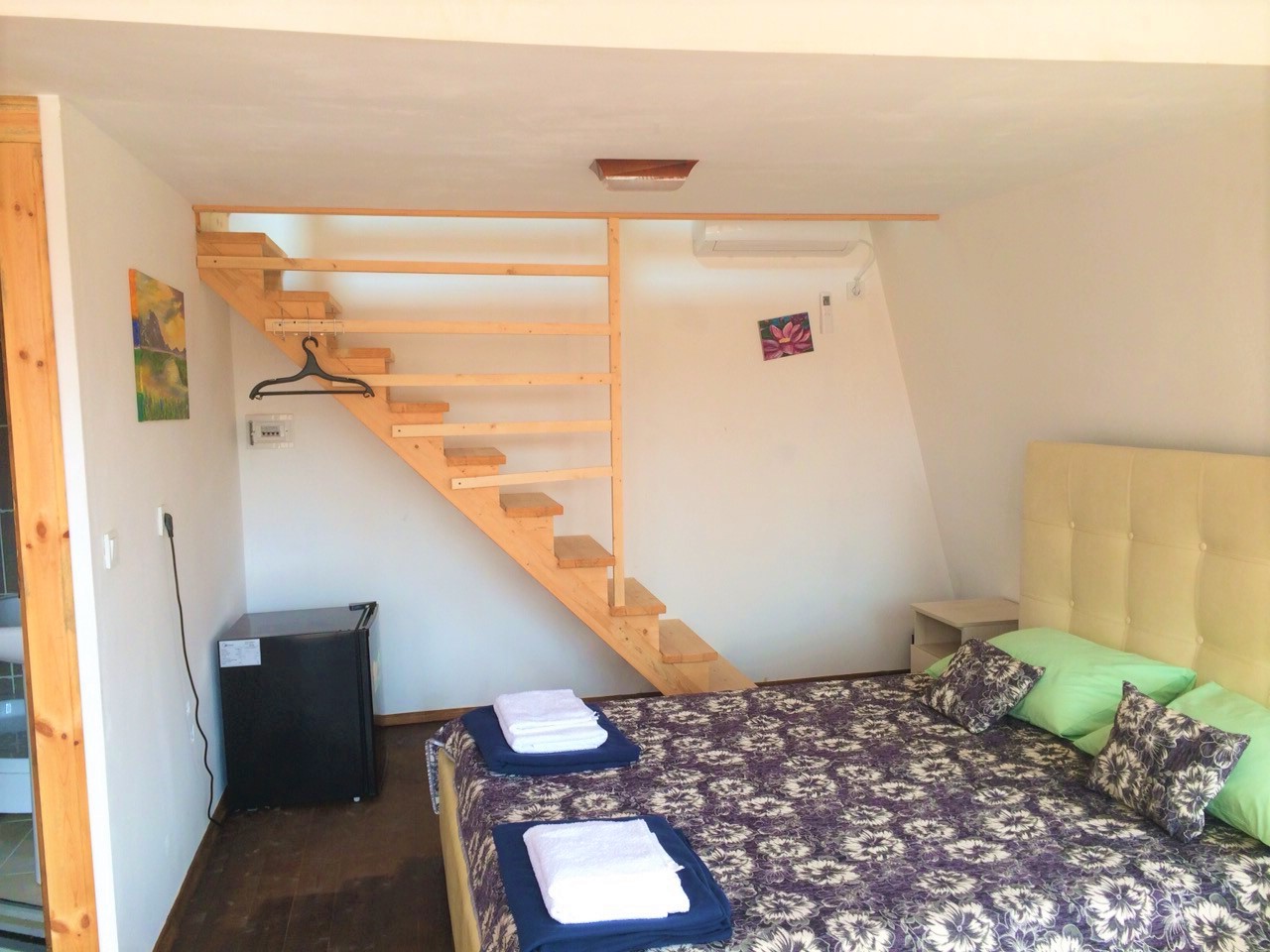 В номере: вешалка, зеркало, кровать двуспальная, прикроватные тумбочки, шкаф, кондиционер, мини-холодильник, сейф