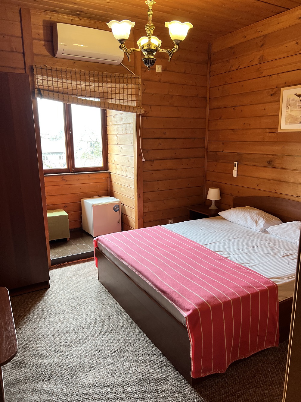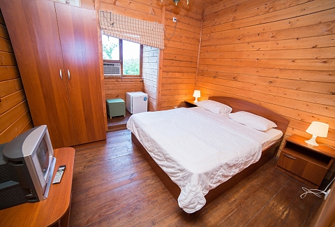 В номере: вешалка, зеркало, кровать двуспальная, прикроватные тумбочки, стол, стул, шкаф, кондиционер, телевизор, холодильник