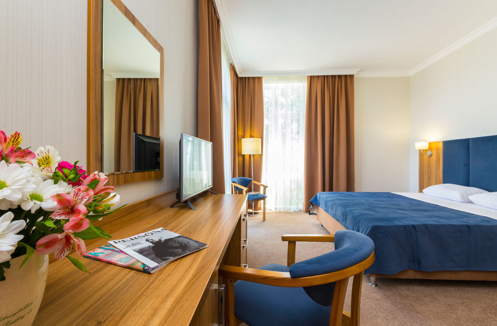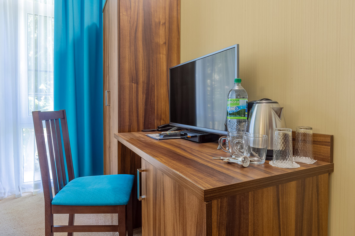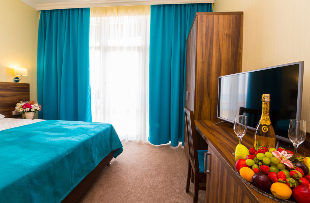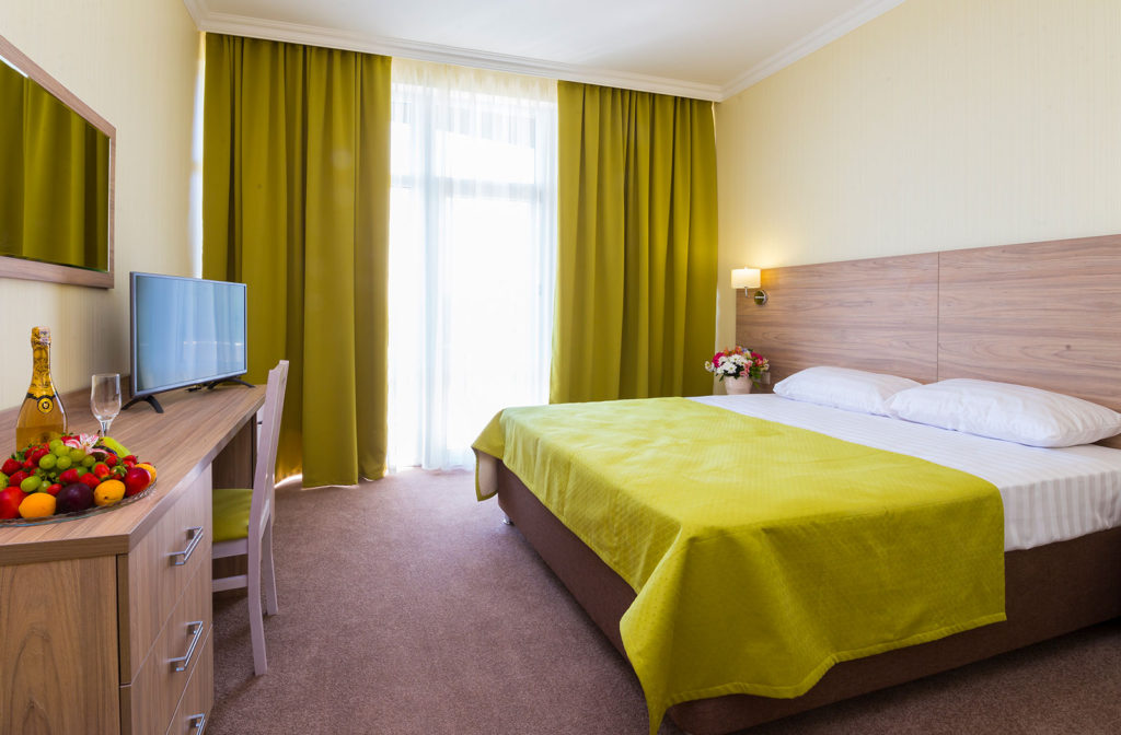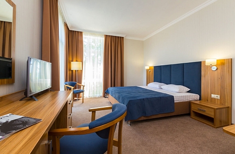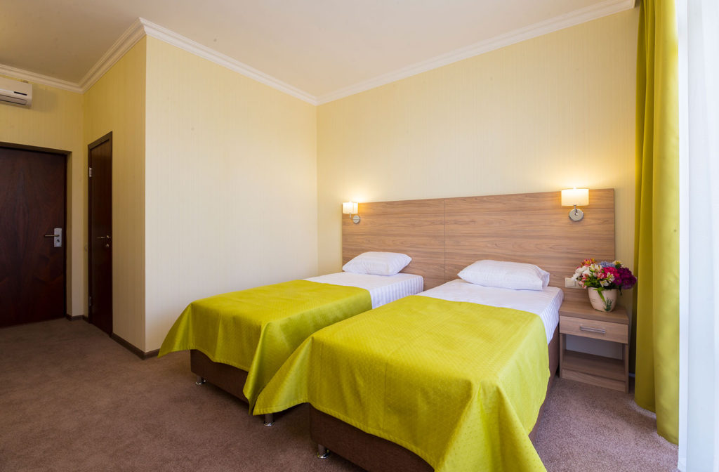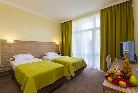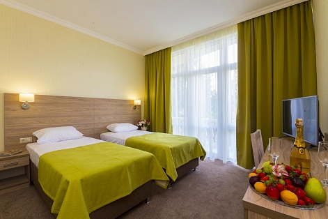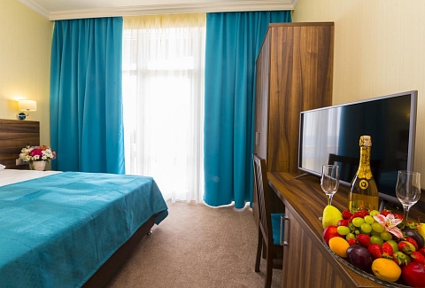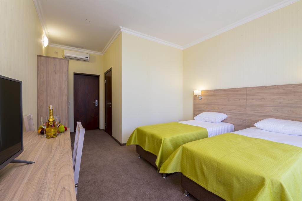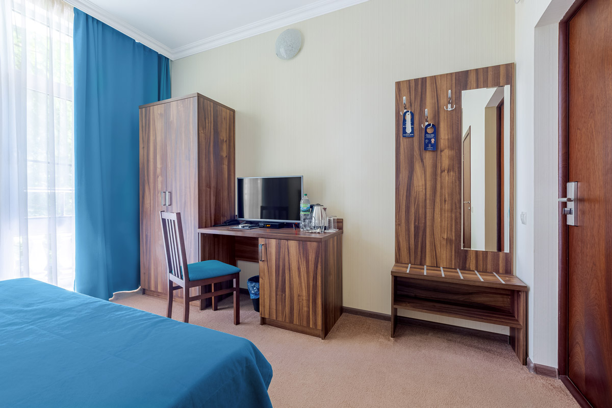 В номере: вешалка, зеркало, кровати односпальные /одна двуспальная кровать, прикроватные тумбочки, стол, стул, шкаф, кондиционер, мини-холодильник, сейф, телевизор ЖК, чайная станция
