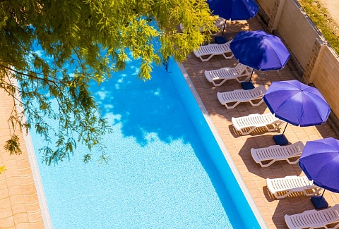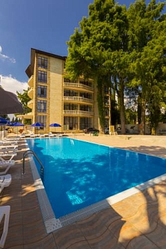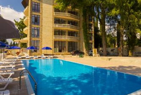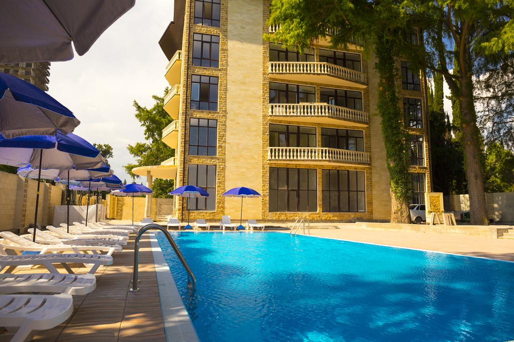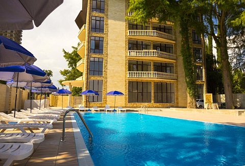 «Золотой якорь» - прекрасное место для молодежного и семейного отдыха с детьми.«Золотой якорь» имеет собственную охраняемую территорию с роскошными вековыми деревьями, уютными зонами отдыха и площадками. Пятиэтажное здание отеля с лифтом оформлено в классическом колониальном стиле с национальными элементами, так же как и его внутренний интерьер. В жилом гостиничном фонде – 47 номеров разных категорий, способных одновременно вместить более 90 человек. Все номера отеля оборудованы санузлами с ванной или душем и набором необходимой бытовой техники: кондиционером, холодильником, телефоном, сейфом, феном, телевизором, многими другими удобствами, зависящими от класса номера. Wi-Fi доступен на всей территории отеля.Питание гостей организовано в основном ресторане «Золотой якорь», специализирующемся на русской кухне. Ресторан дополняют бар у бассейна, караоке-бар и лобби-бар. Для гостей отеля работает открытый подогреваемый бассейн с удобной релакс-зоной. У детей есть возможность поиграть на игровой площадке под открытым небом или в детской комнате.В нескольких минутах ходьбы от отеля – городской пляж с песком, галькой и чистой морской водой.