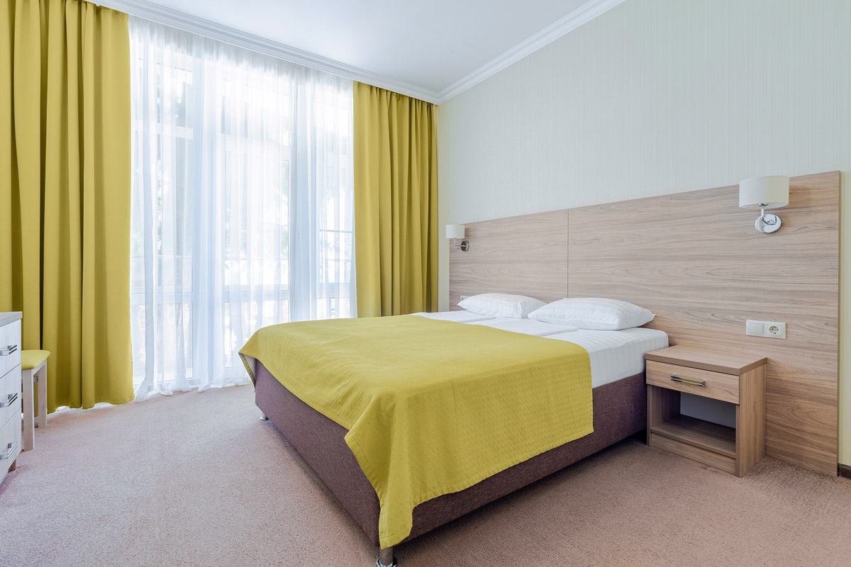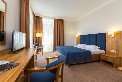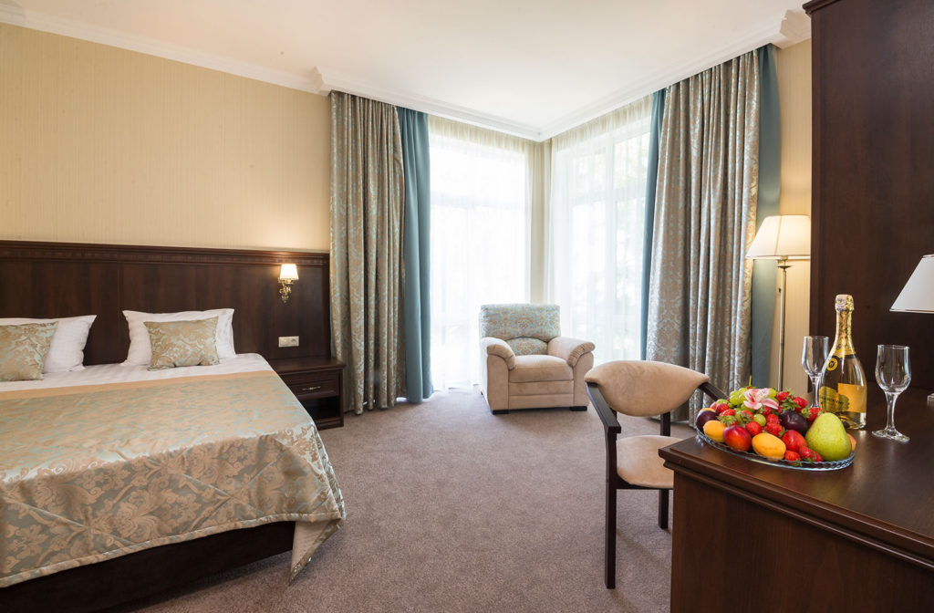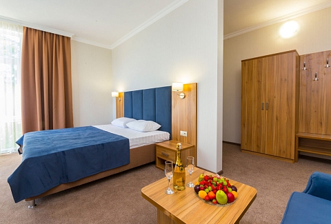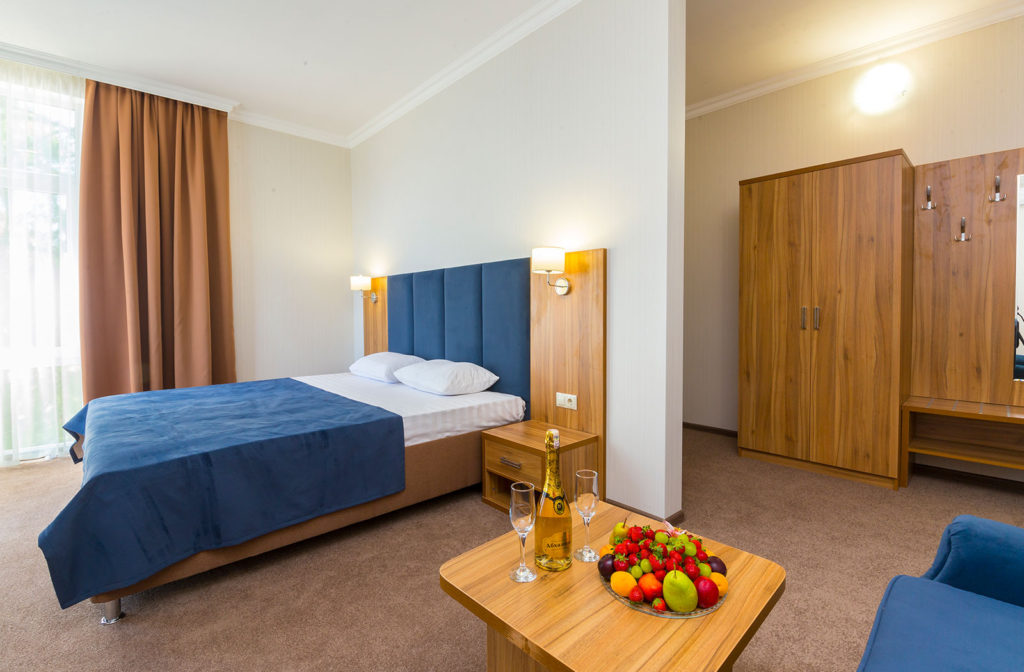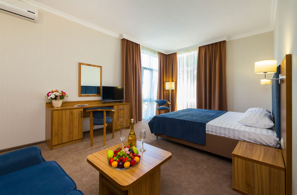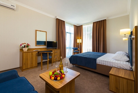 В номере: вешалка, диван, зеркало, кровать двуспальная, прикроватные тумбочки, стол, столик журнальный, стул, шкаф, кондиционер, мини-холодильник, сейф, телевизор ЖК, чайная станция