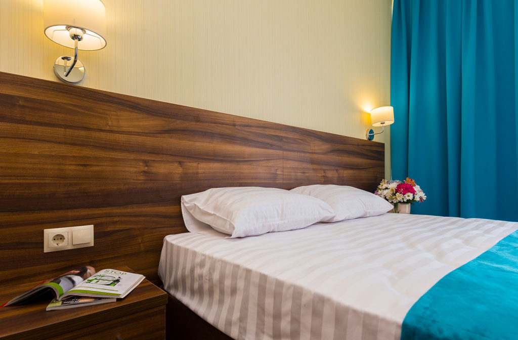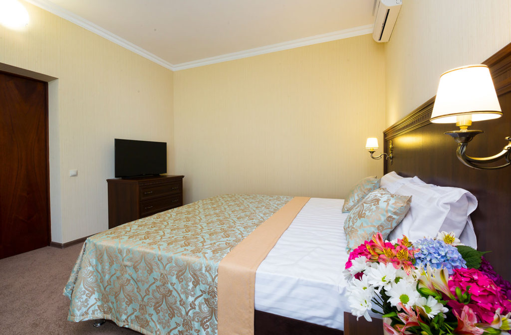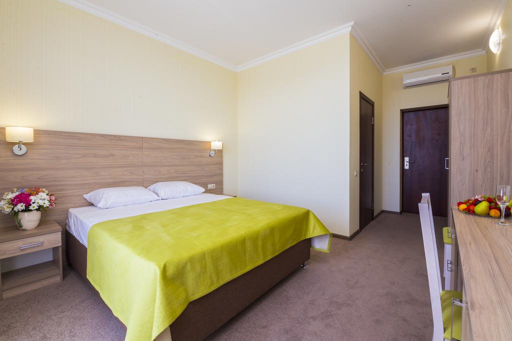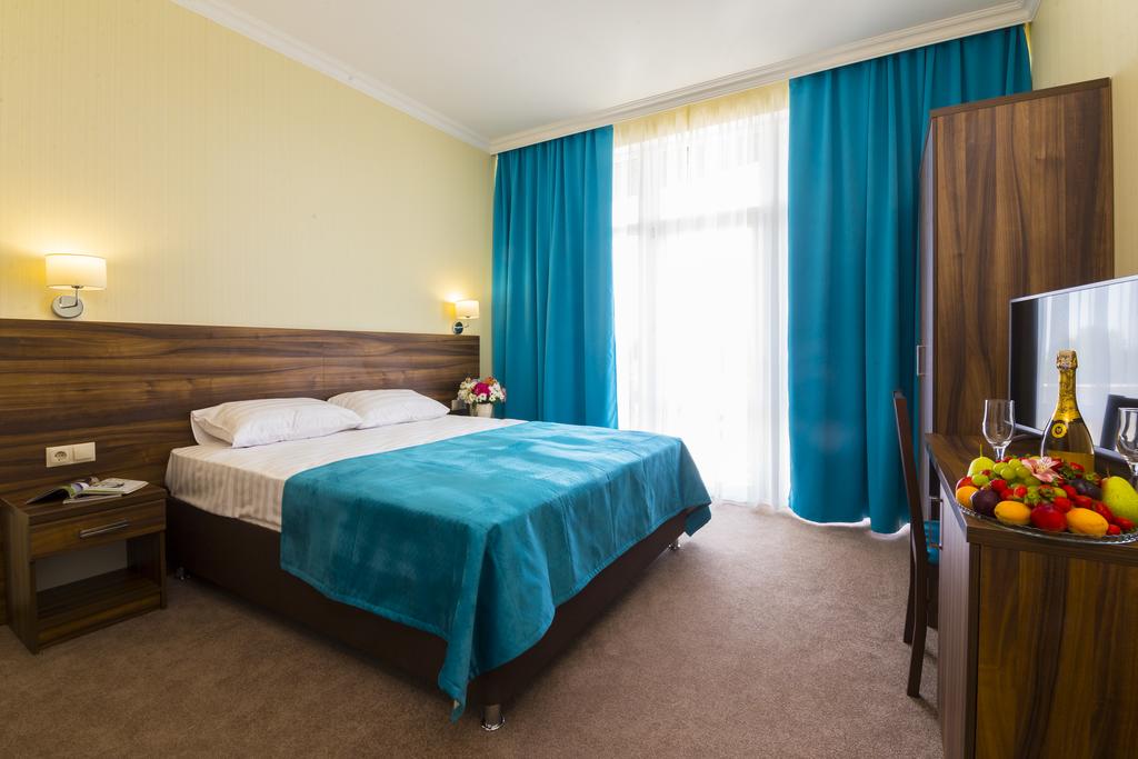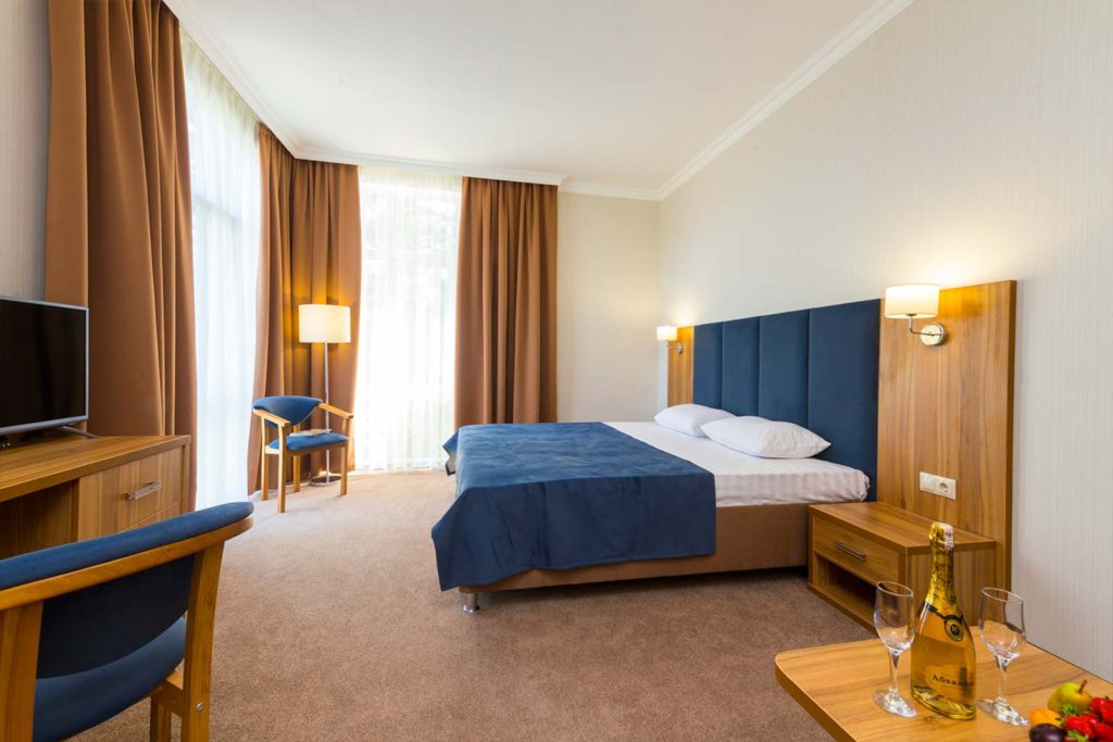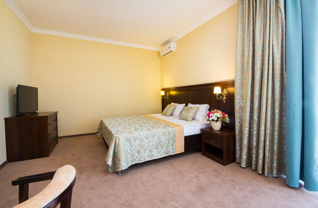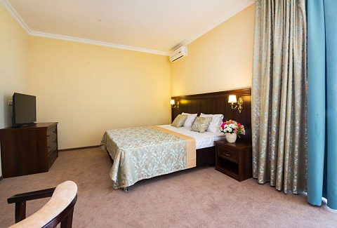 В номере: вешалка, зеркало, кровать двуспальная, прикроватные тумбочки, стол, стул, шкаф, кондиционер, мини-холодильник, сейф, телевизор ЖК, чайная станция