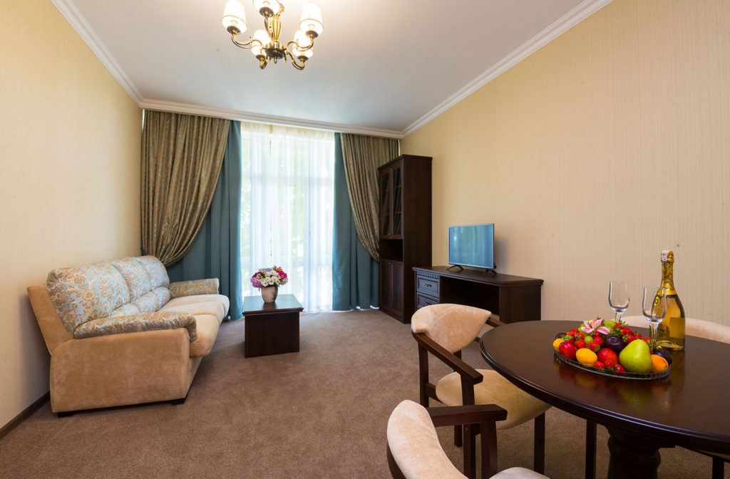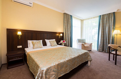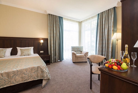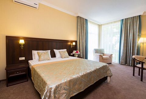 В номере: вешалка, диван, зеркало, кресло, кровать двуспальная, прикроватные тумбочки, стол, столик журнальный, стулья, шкаф, кондиционер, мини-холодильник, сейф, телевизор ЖК, чайная станция