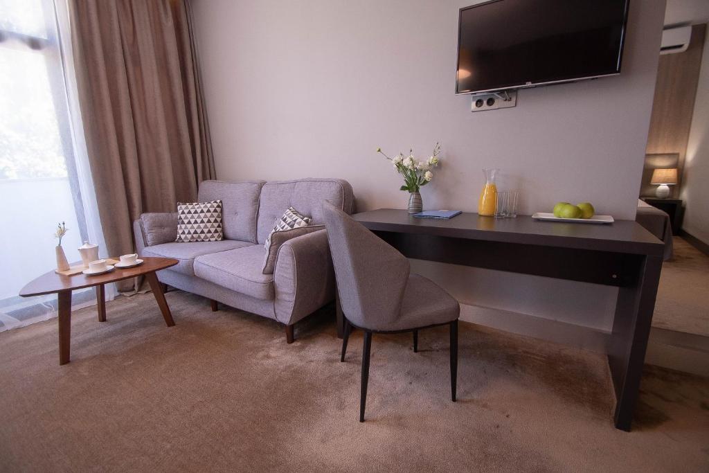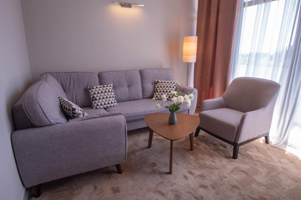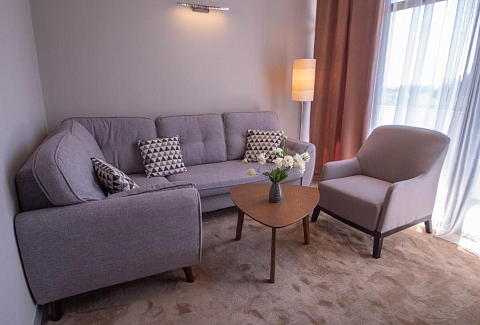 В номере: диван, зеркало, кресло, кровати односпальные /одна двуспальная кровать, прикроватные тумбочки, стол, столик журнальный, стул, шкаф, кондиционер, сейф, телевизор, холодильник