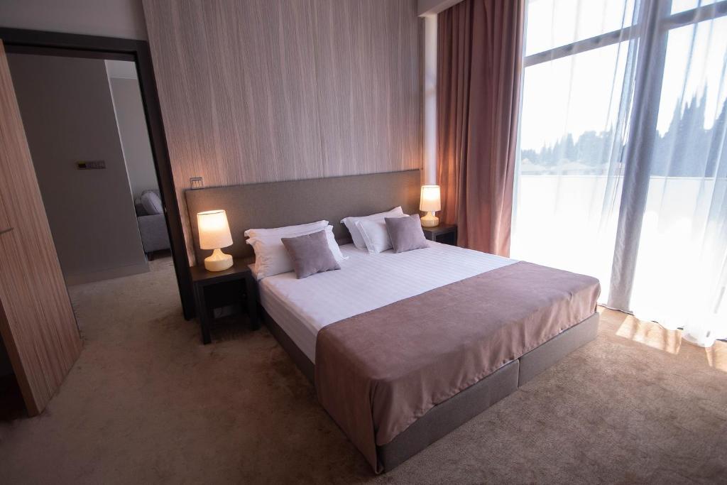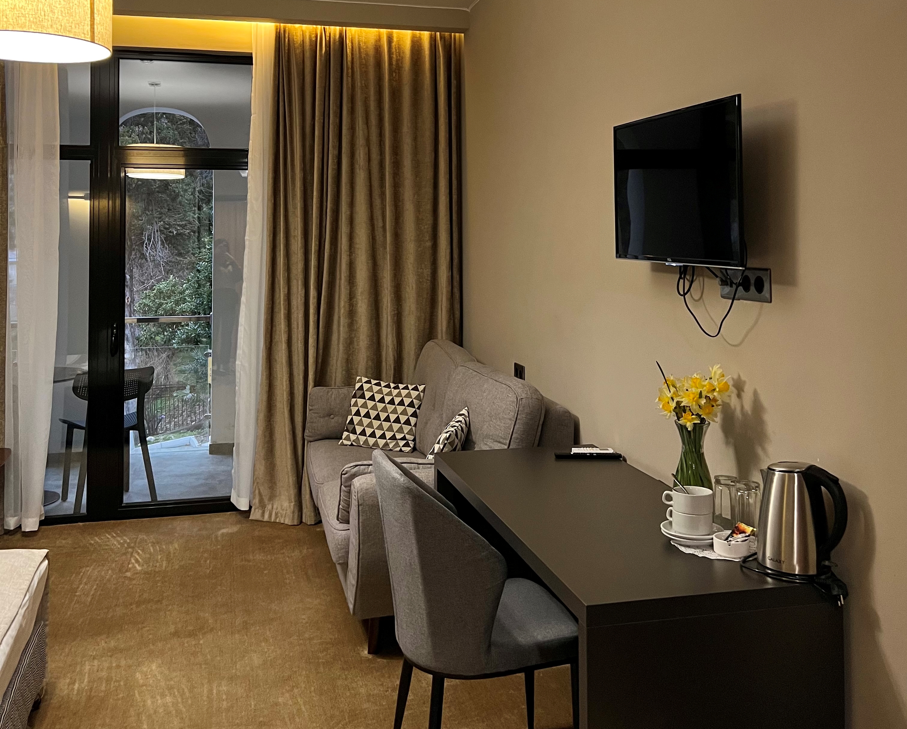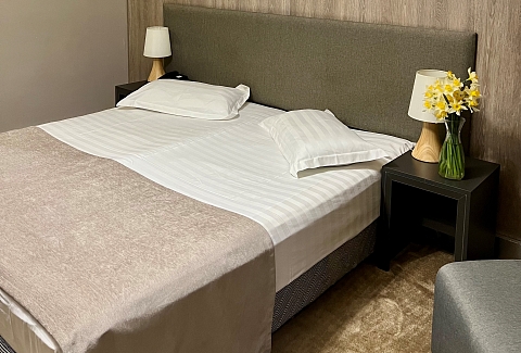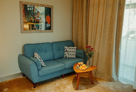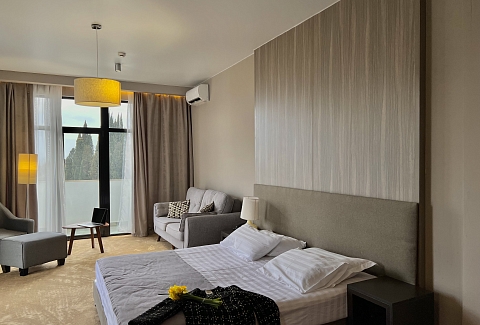 В номере: вешалка, диван раскладной, зеркало, кровати односпальные /одна двуспальная кровать, прикроватные тумбочки, столик журнальный, шкаф, кондиционер, сейф, телевизор, холодильник