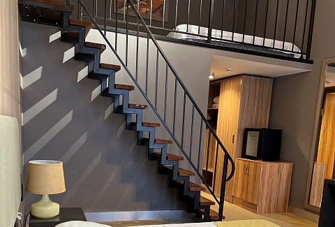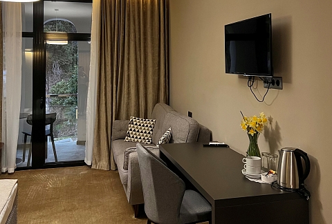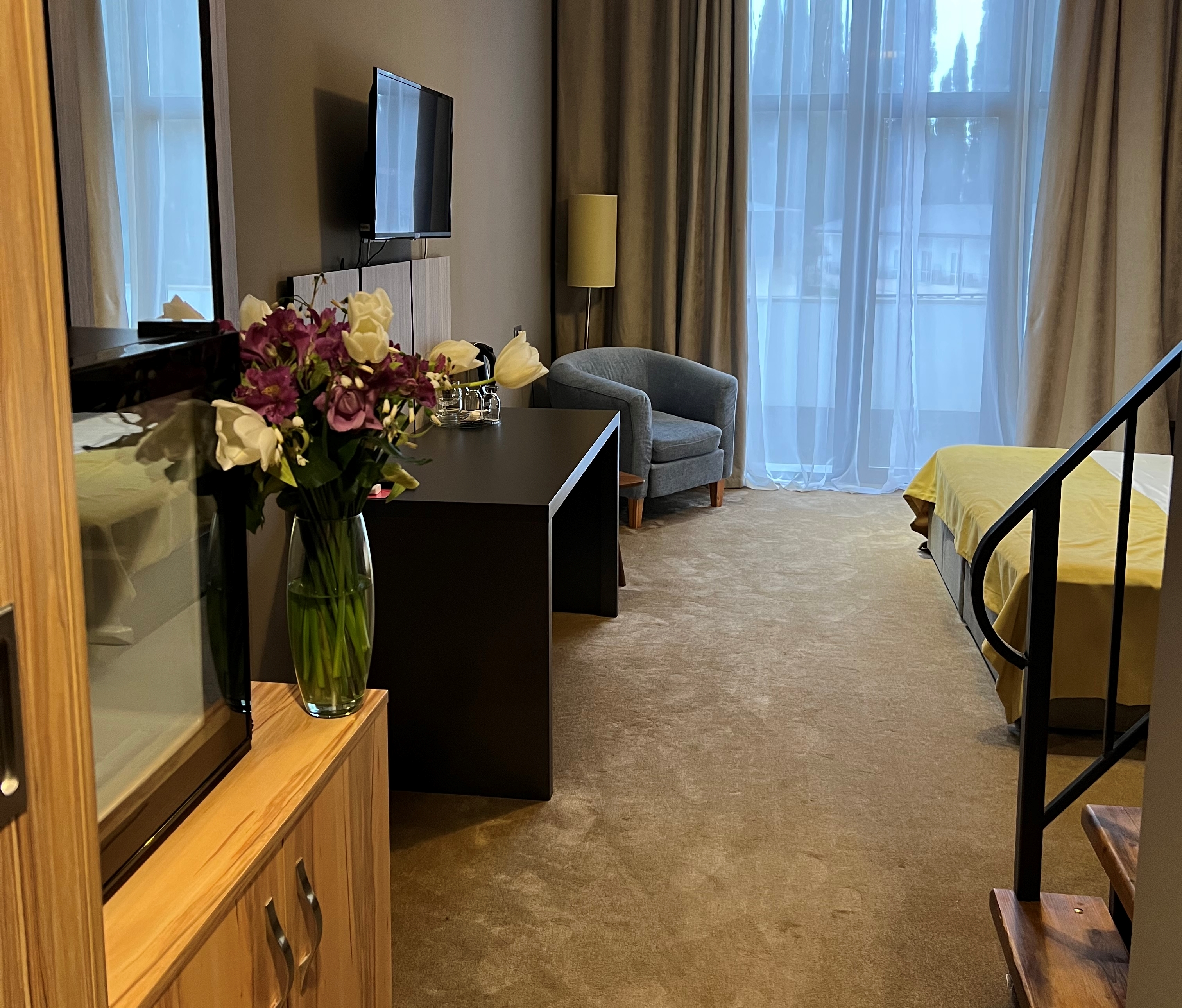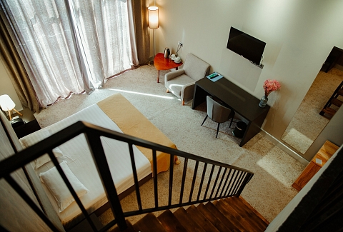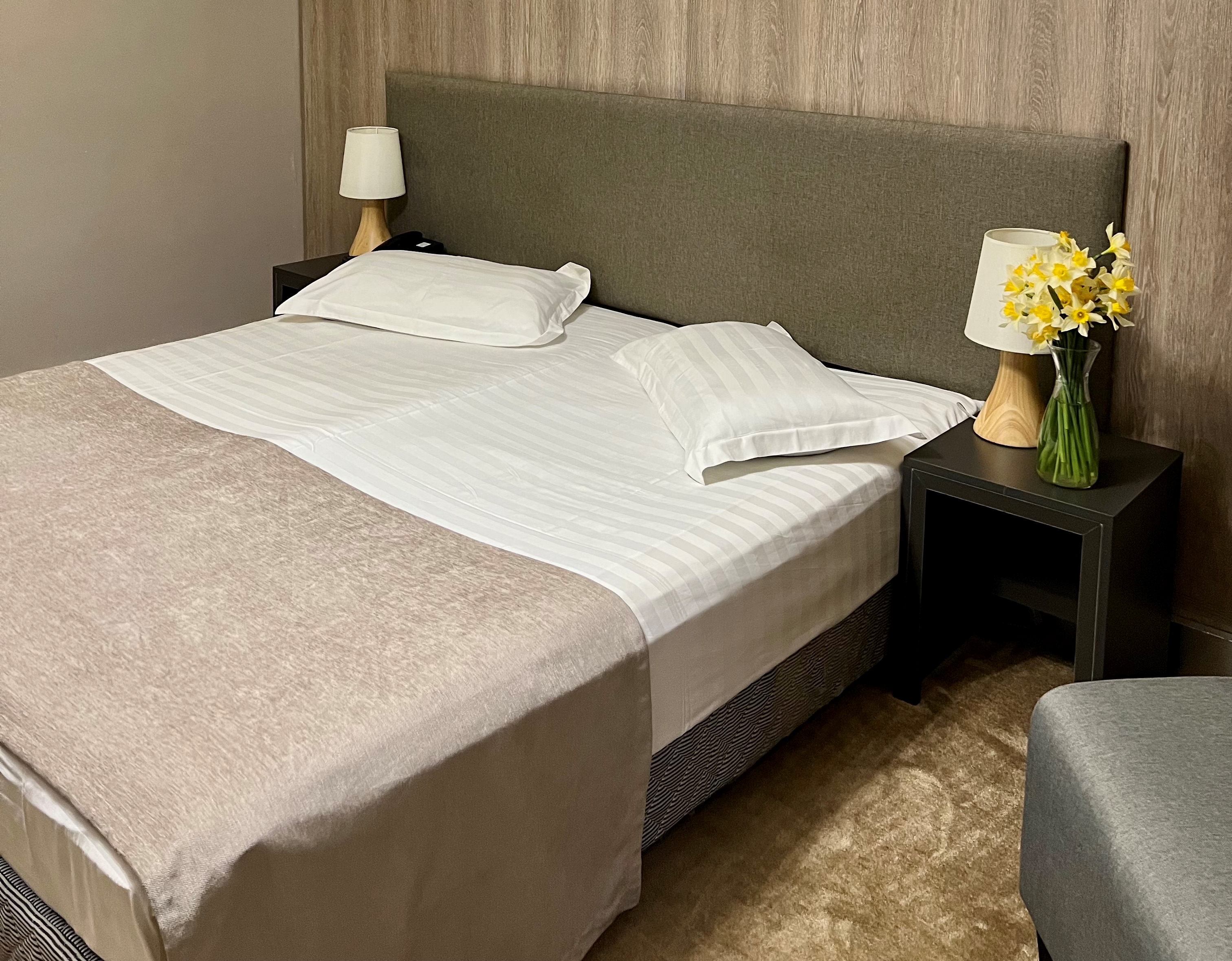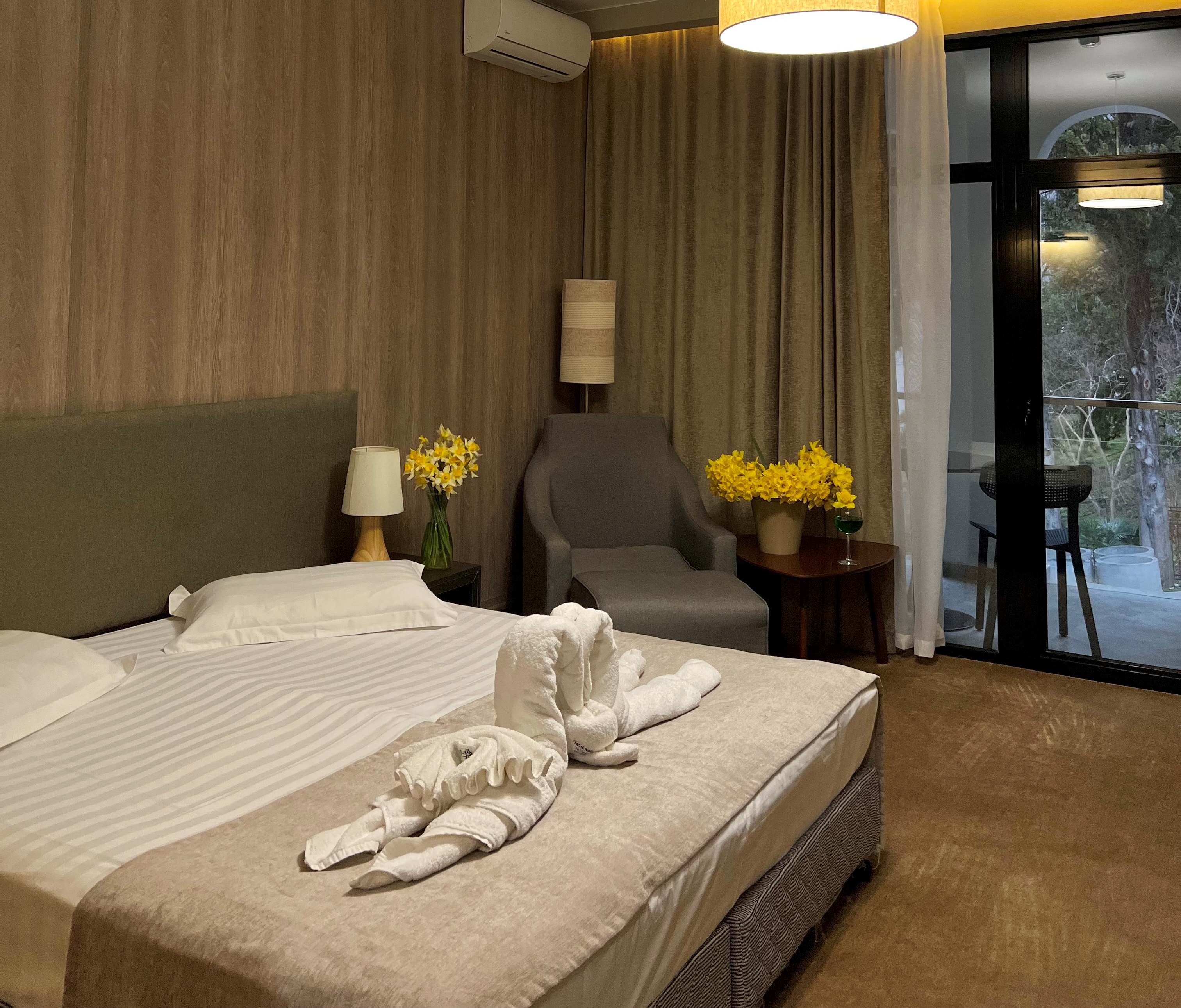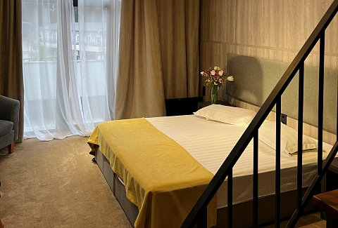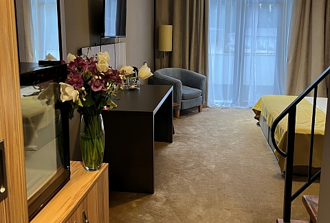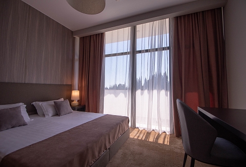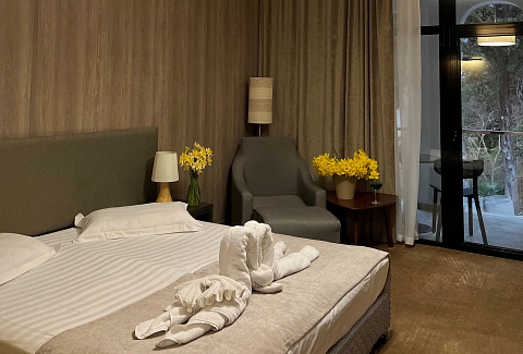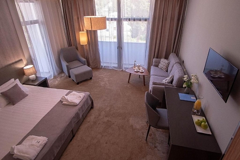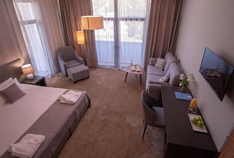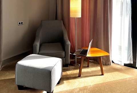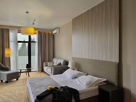 В номере: вешалка, зеркало, кресло, кровати односпальные /одна двуспальная кровать, прикроватные тумбочки, стол, столик журнальный, стулья, шкаф, кондиционер, сейф, телевизор, холодильник