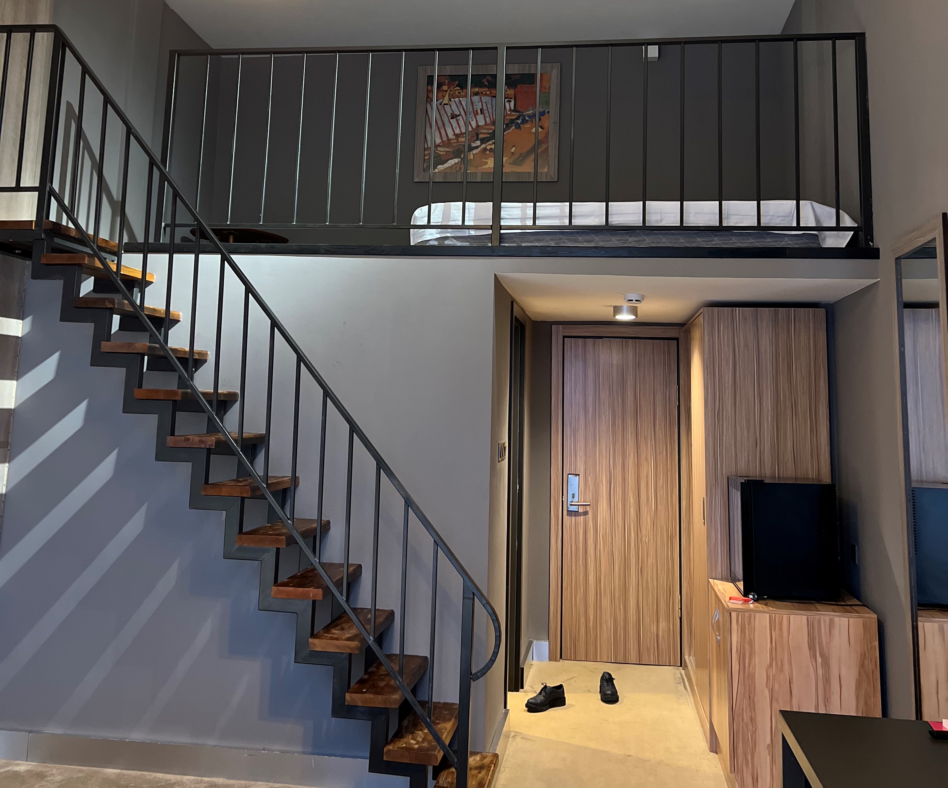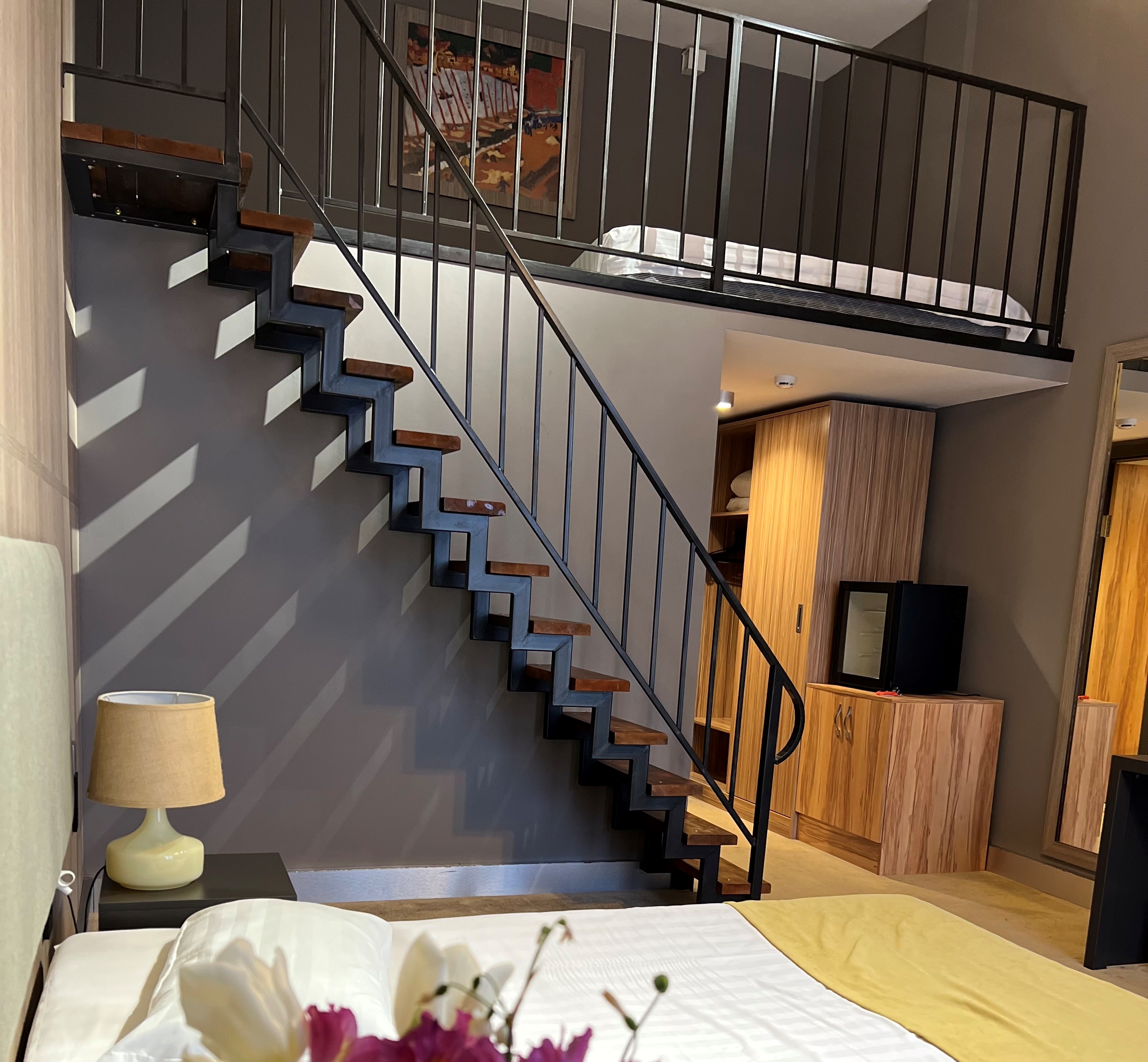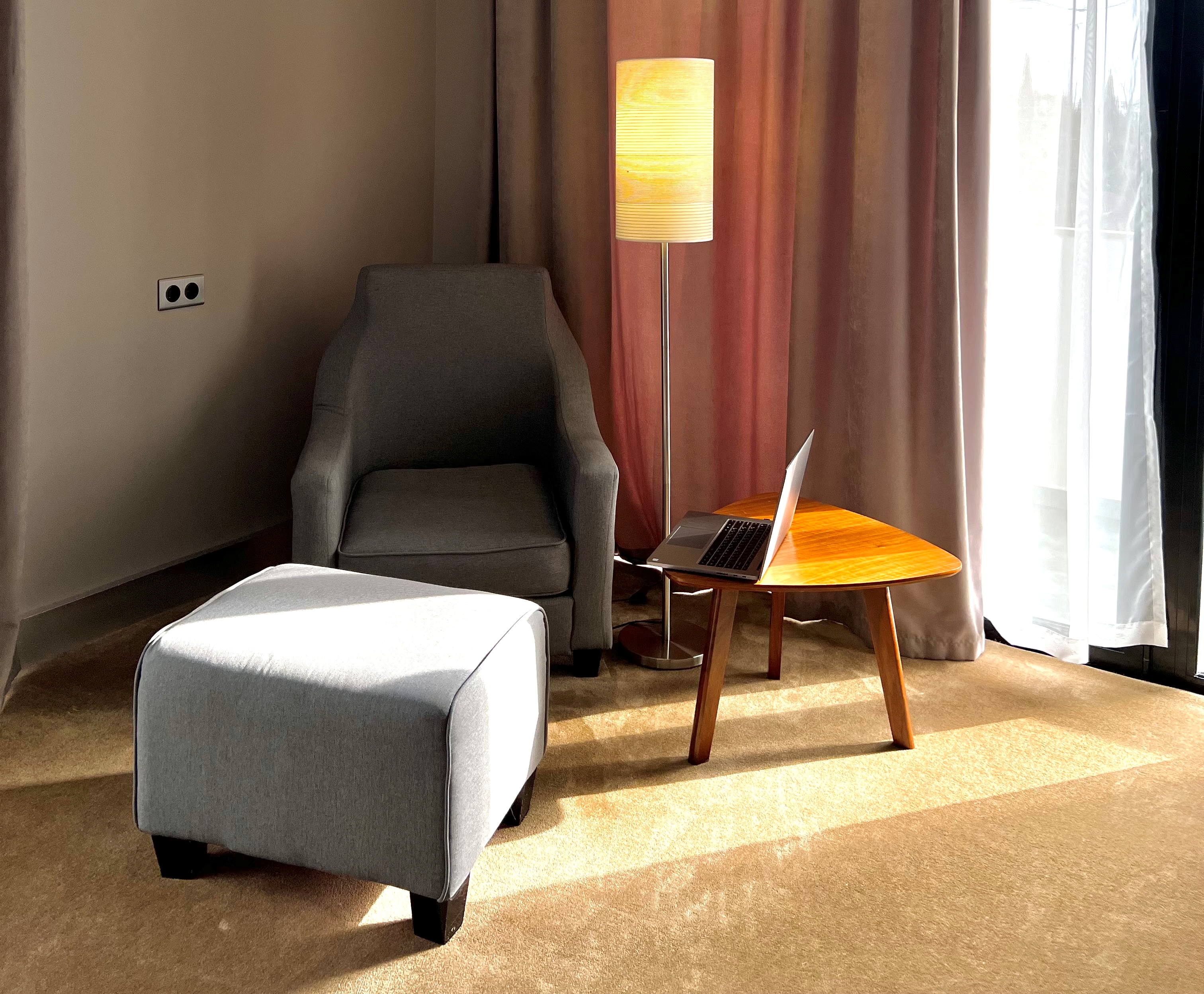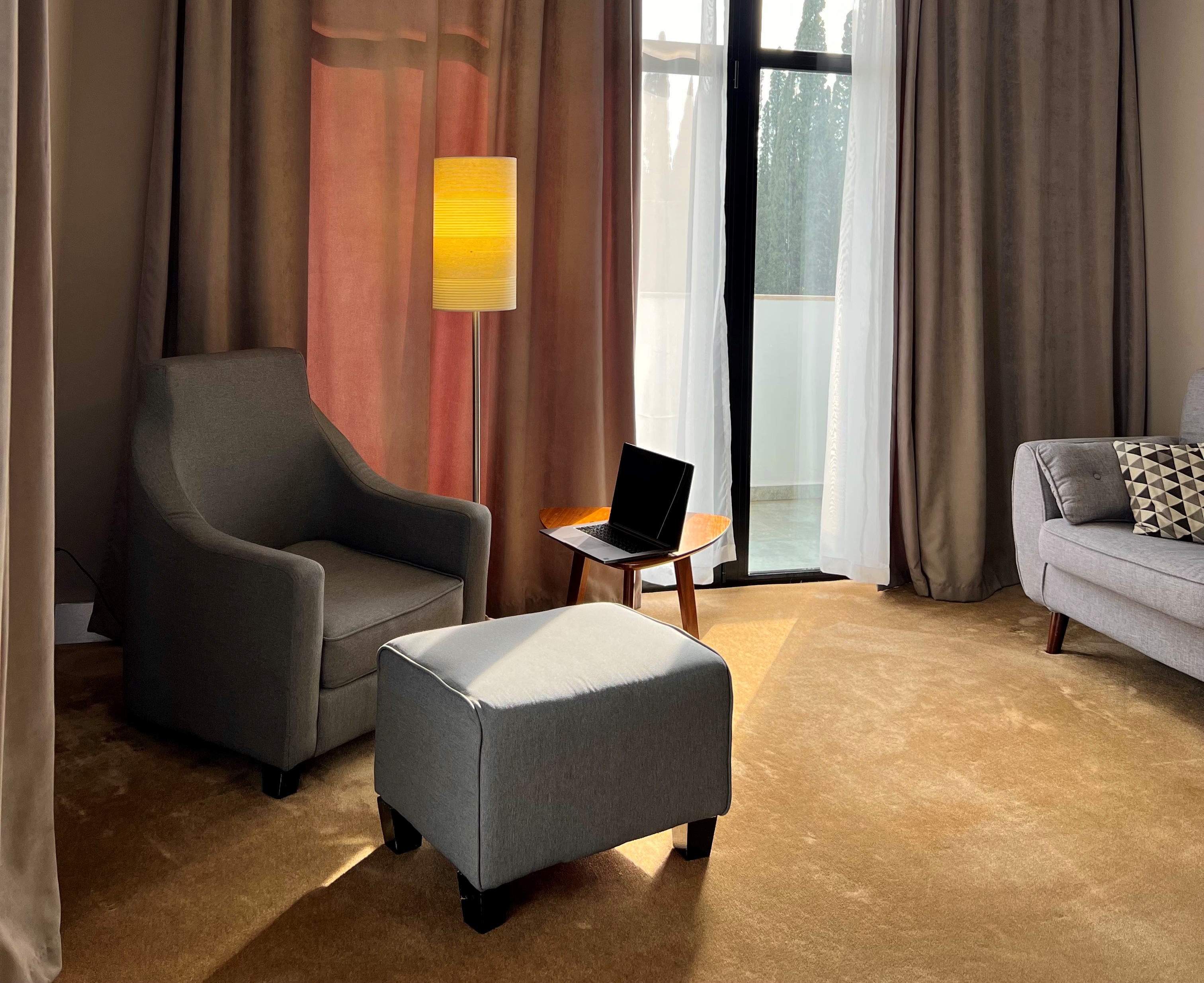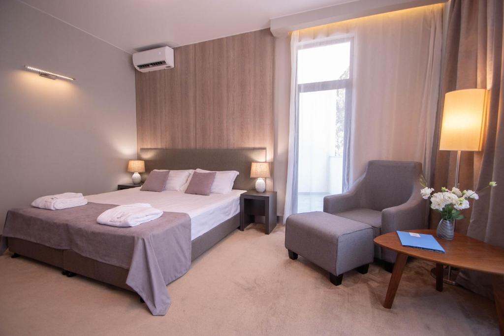 В номере: вешалка, зеркало, кресло, кровати односпальные /одна двуспальная кровать, прикроватные тумбочки, стол, столик журнальный, стулья, шкаф, кондиционер, сейф, телевизор, холодильник