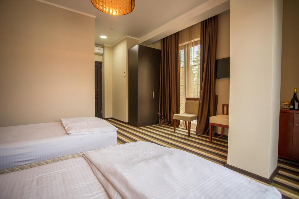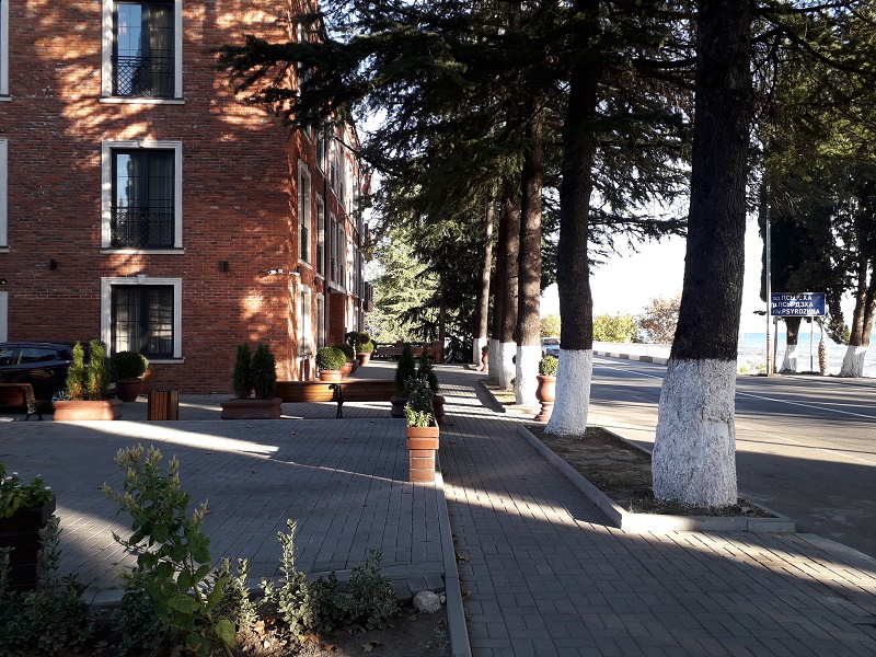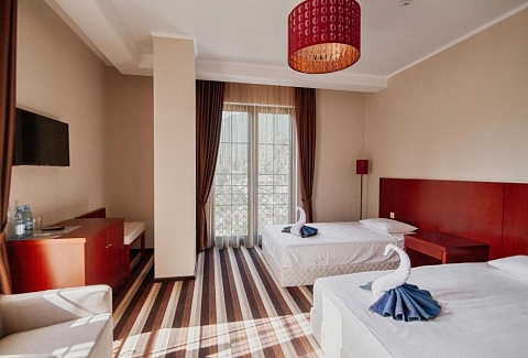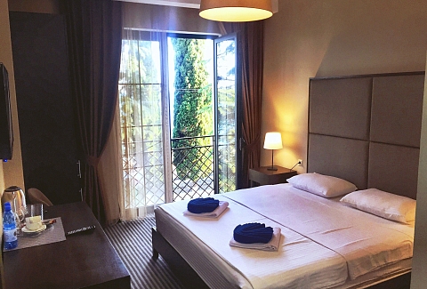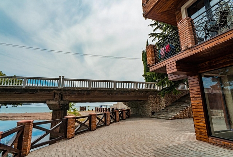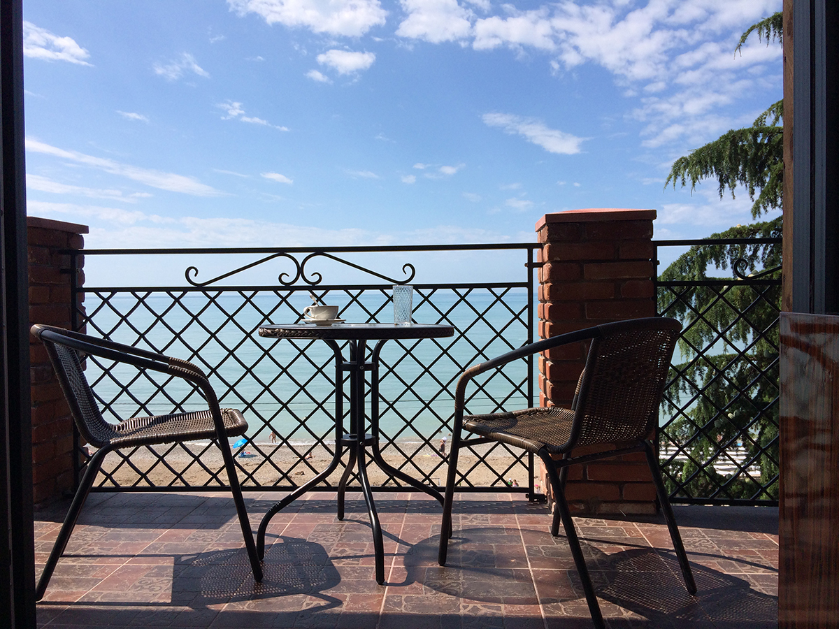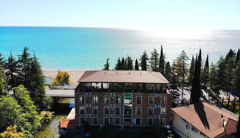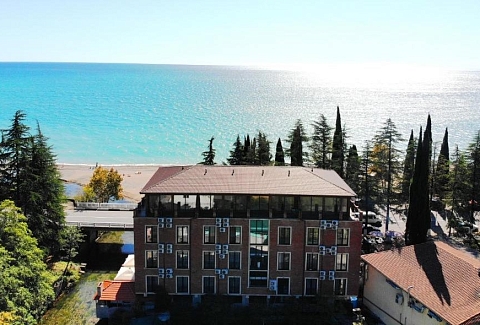 До аэропорта в Адлере чуть больше 80 километров, до российско-абхазской границы можно доехать за час-полтора. Четырехэтажный корпус отеля (без лифта) разместился всего в 30 метрах от морского побережья. Отдыхающих ожидают номера Стандарт, Улучшенной категории, а также двухкомнатные Семейные и трехместные номера Люкс. Везде имеются собственный санузел с душем, кондиционер, телевизор и необходимая мебель. В номерах повышенной категории комфорта есть открытая терраса с видом на море. В отеле предоставляется питание. Рядом с корпусом работают ресторан «Гуада» с итальянской кухней, летнее кафе и столовая. В номерах и на территории отеля доступен беспроводной интернет. У администратора отдыхающие могут заказать экскурсии на озеро Рицу, к сероводородным источникам и в другие туристические места республики. Малышам предоставляются кроватки-манежи. Песчано-галечный пляж расположен в 2-х минутах ходьбы от отеля. На пляже работает кафе, есть кабинки для переодевания.