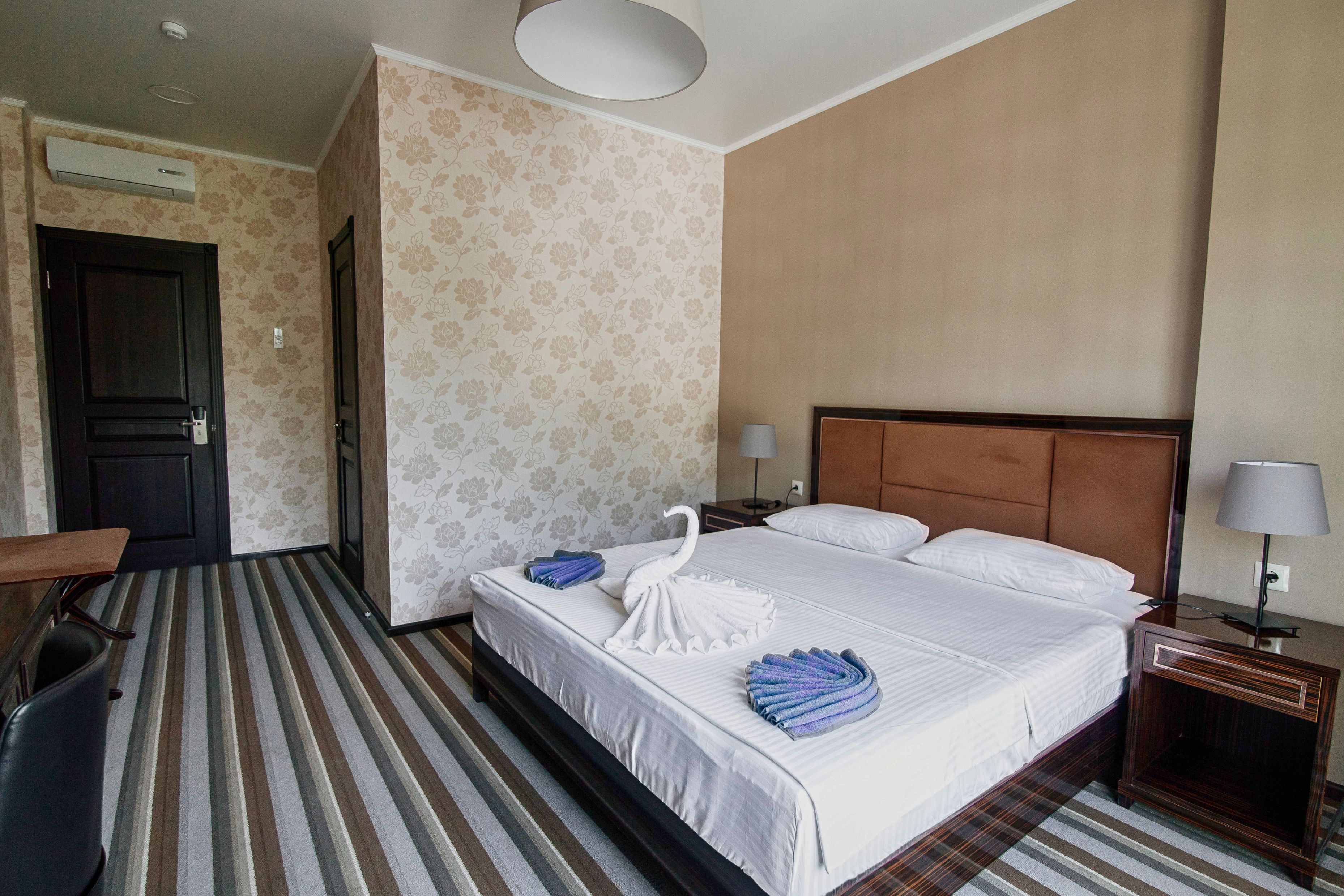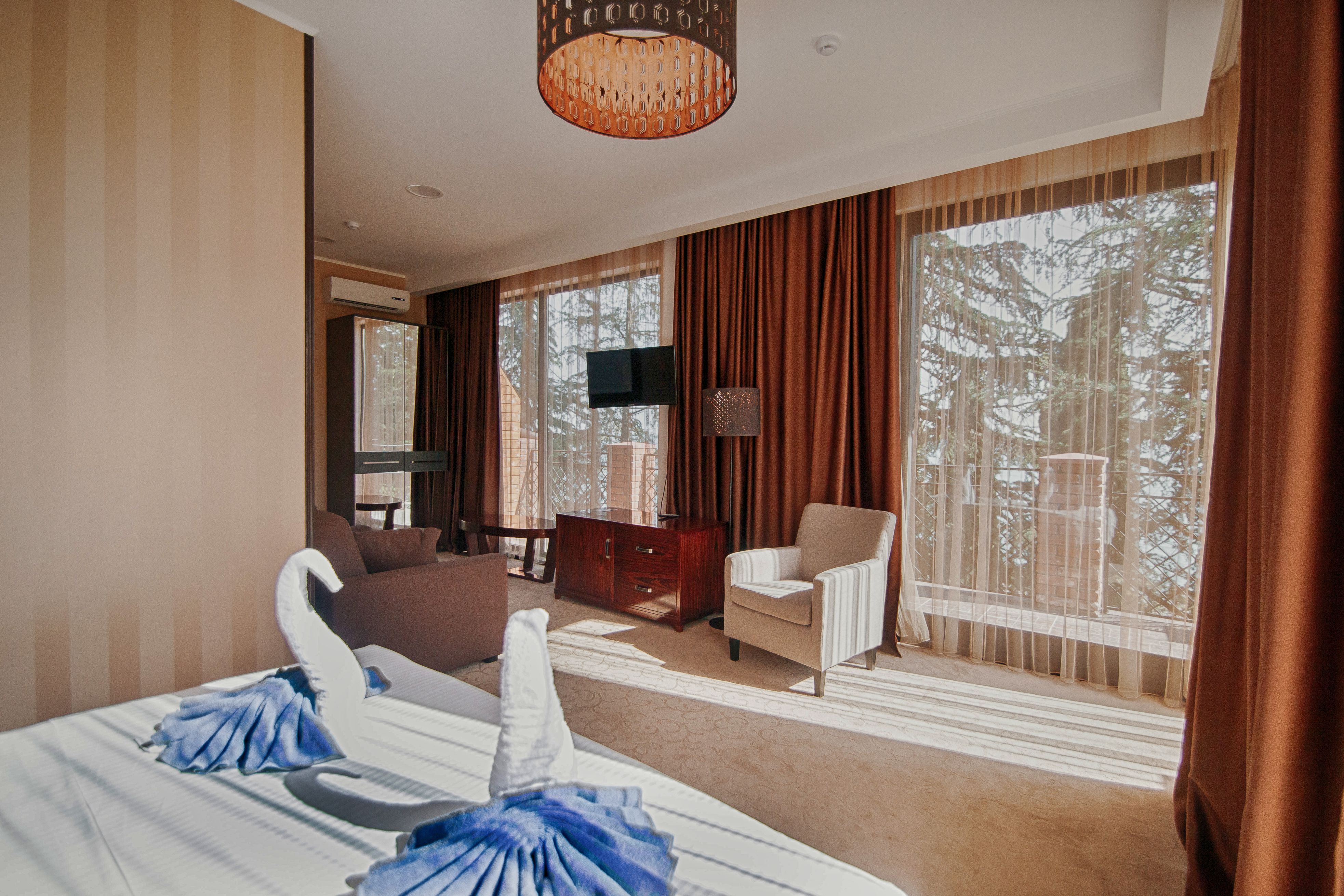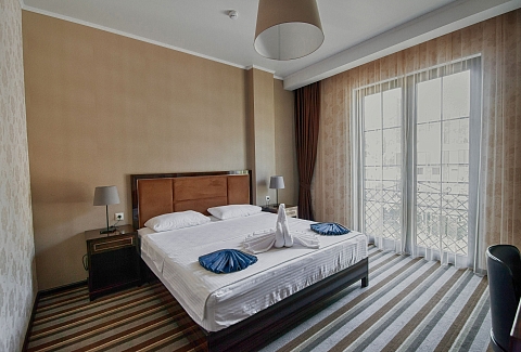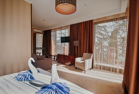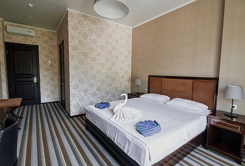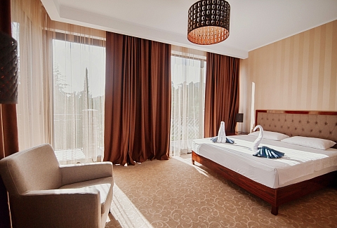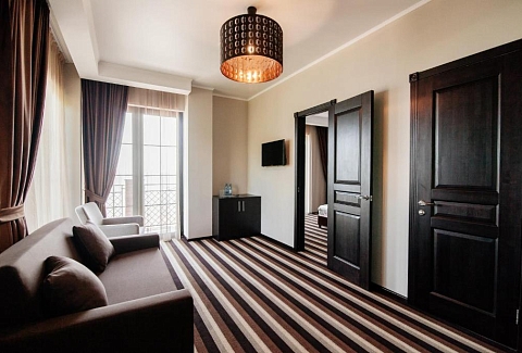 В номере: вешалка, диван раскладной, зеркало, кресло, кровать двуспальная, прикроватные тумбочки, столик журнальный, столик туалетный, шкаф, сейф, сплит-система, телевизор, холодильник
