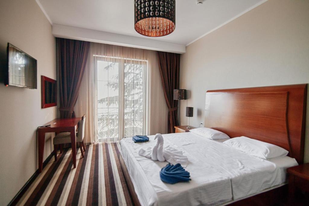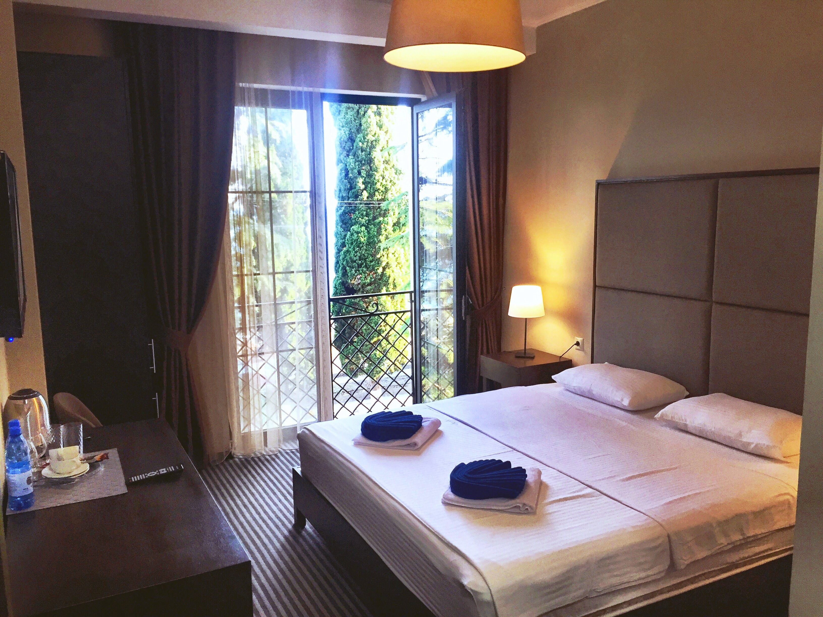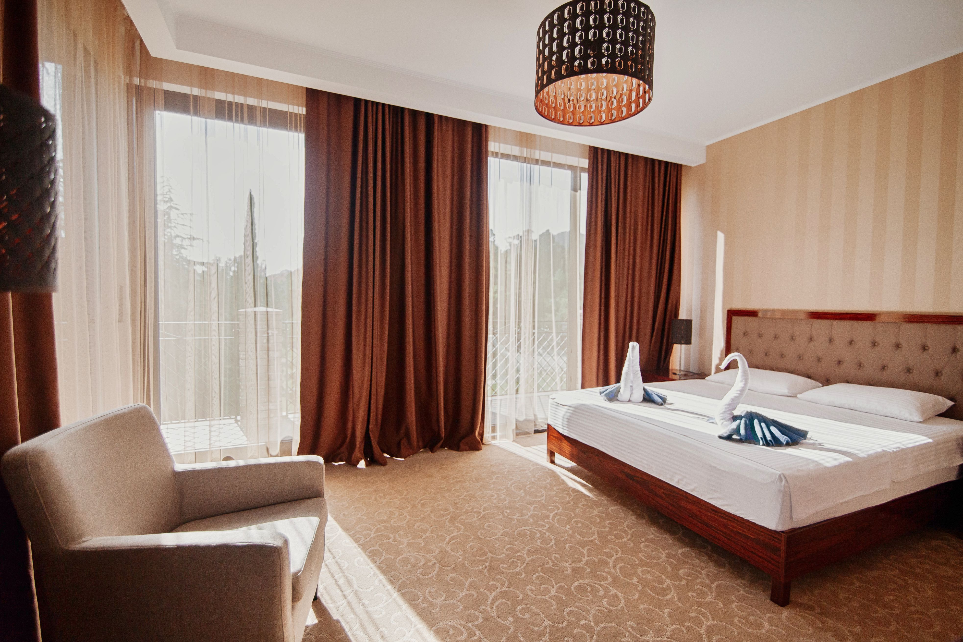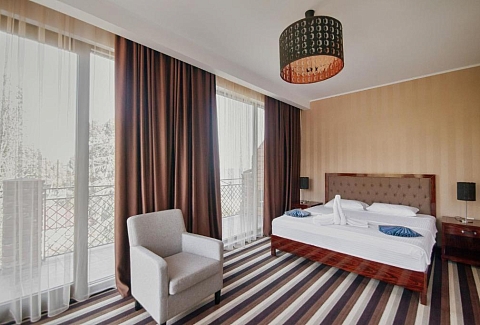 В номере: вешалка, диван раскладной, зеркало, кресло, кровать двуспальная, прикроватные тумбочки, столик журнальный, столик туалетный, шкаф, сейф, сплит-система, телевизор, холодильник