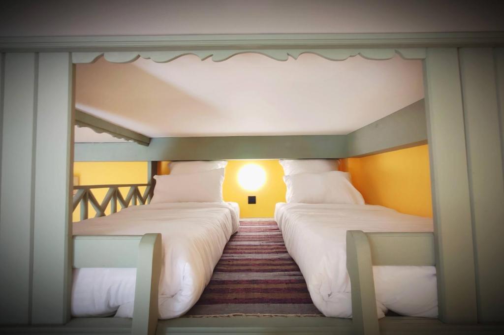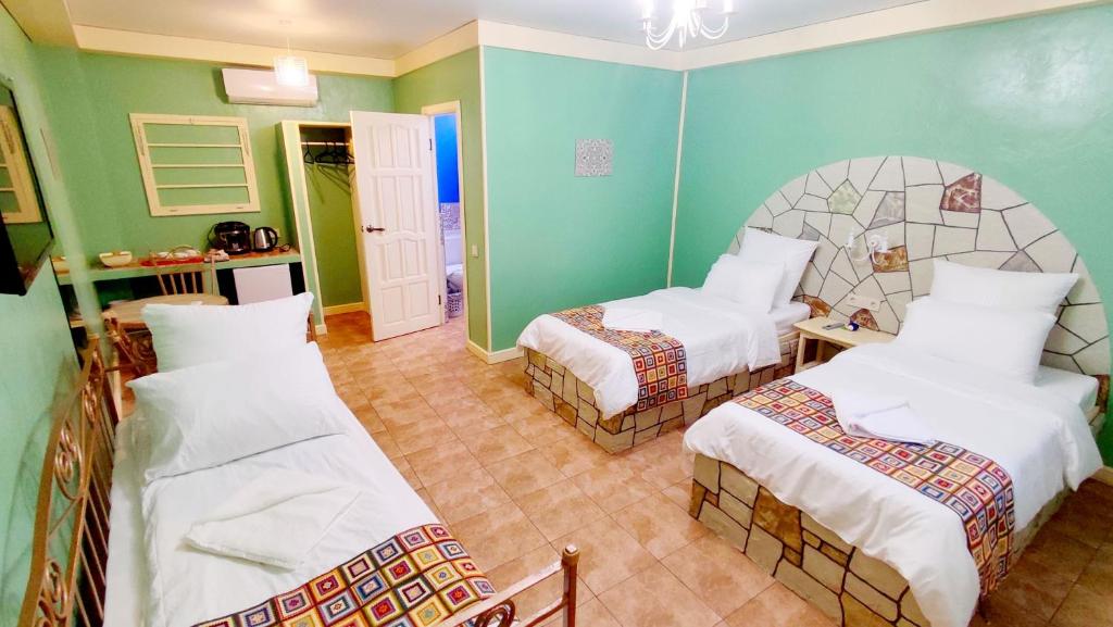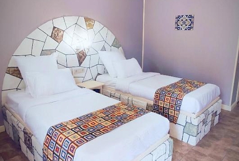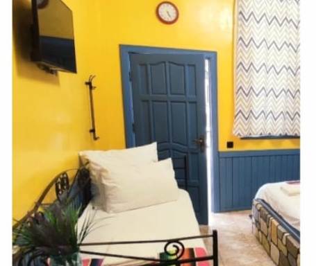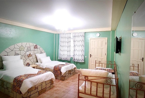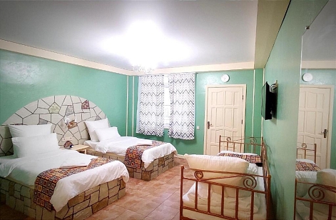 В номере: вешалка, зеркало, кровать двуспальная, кровать двухъярусная, кровать односпальная, прикроватные тумбочки, стол, столик журнальный, стулья, шкаф, кондиционер, мультиварка, набор посуды, телевизор, холодильник, электрочайник