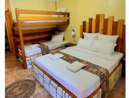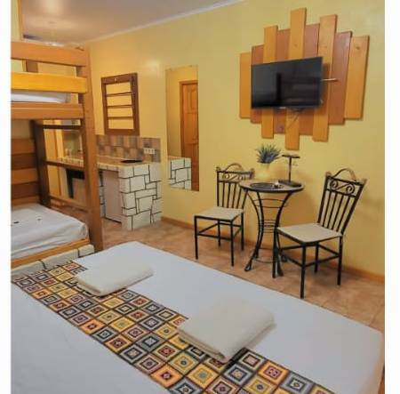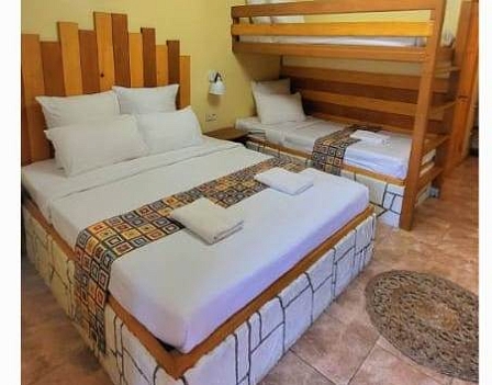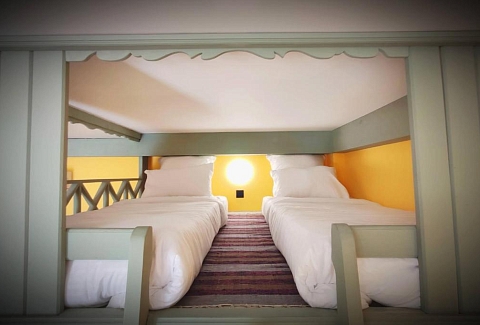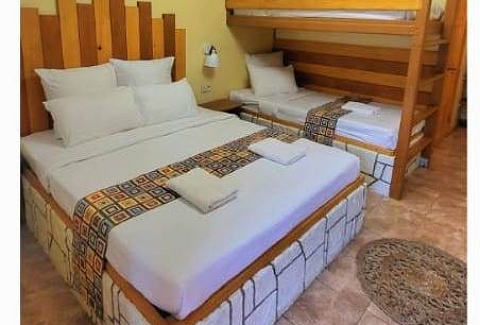 В номере: вешалка, зеркало, кровать двуспальная, кровать двухъярусная, прикроватные тумбочки, стол, столик журнальный, стулья, шкаф, кондиционер, мультиварка, набор посуды, телевизор, холодильник, электрочайник