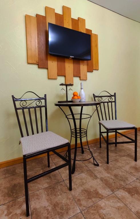 В номере: вешалка, зеркало, кровать двуспальная, кровать односпальная, матрас, прикроватные тумбочки, стол, столик журнальный, стулья, шкаф, кондиционер, мультиварка, набор посуды, телевизор, холодильник, электрочайник