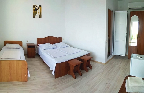 В номере: вешалка, зеркало, кровать двуспальная, кровать односпальная, прикроватные тумбочки, столик журнальный, шкаф, сплит-система, холодильник