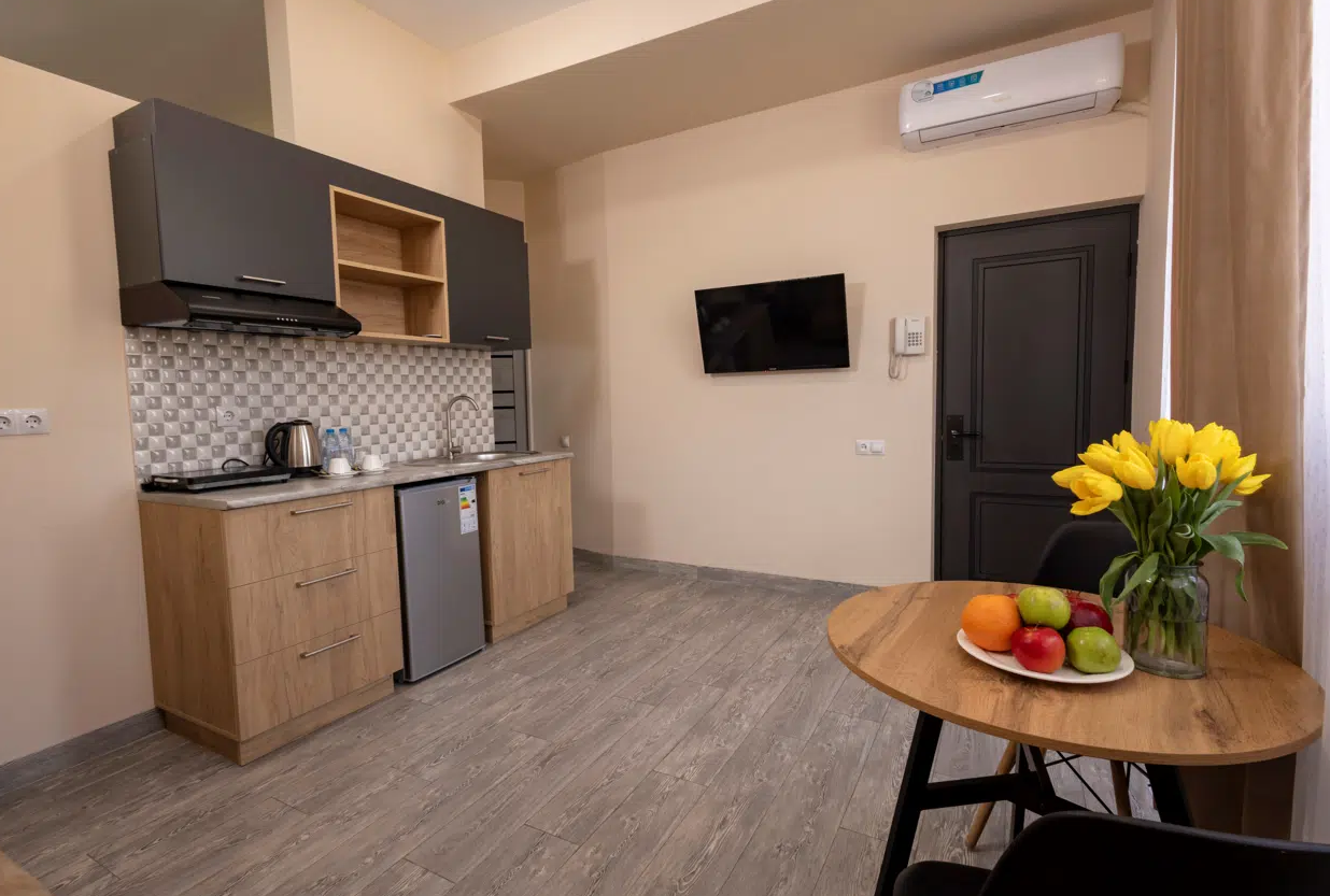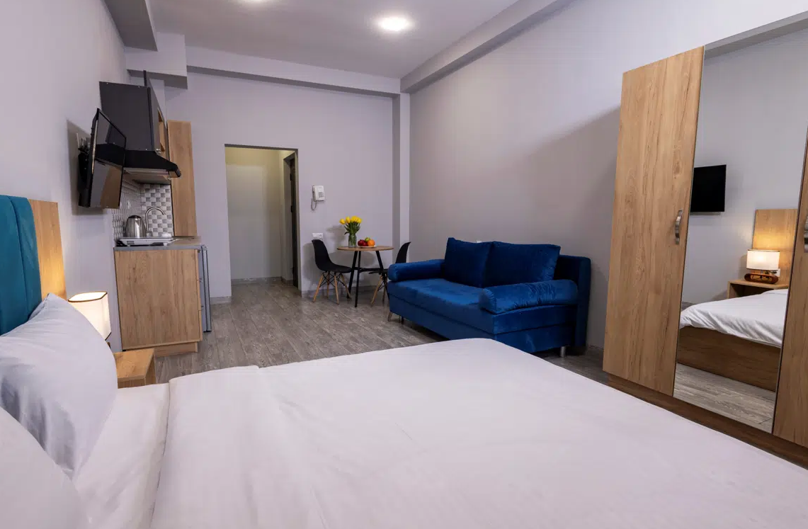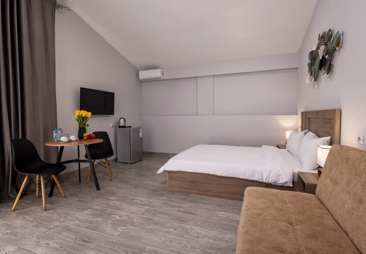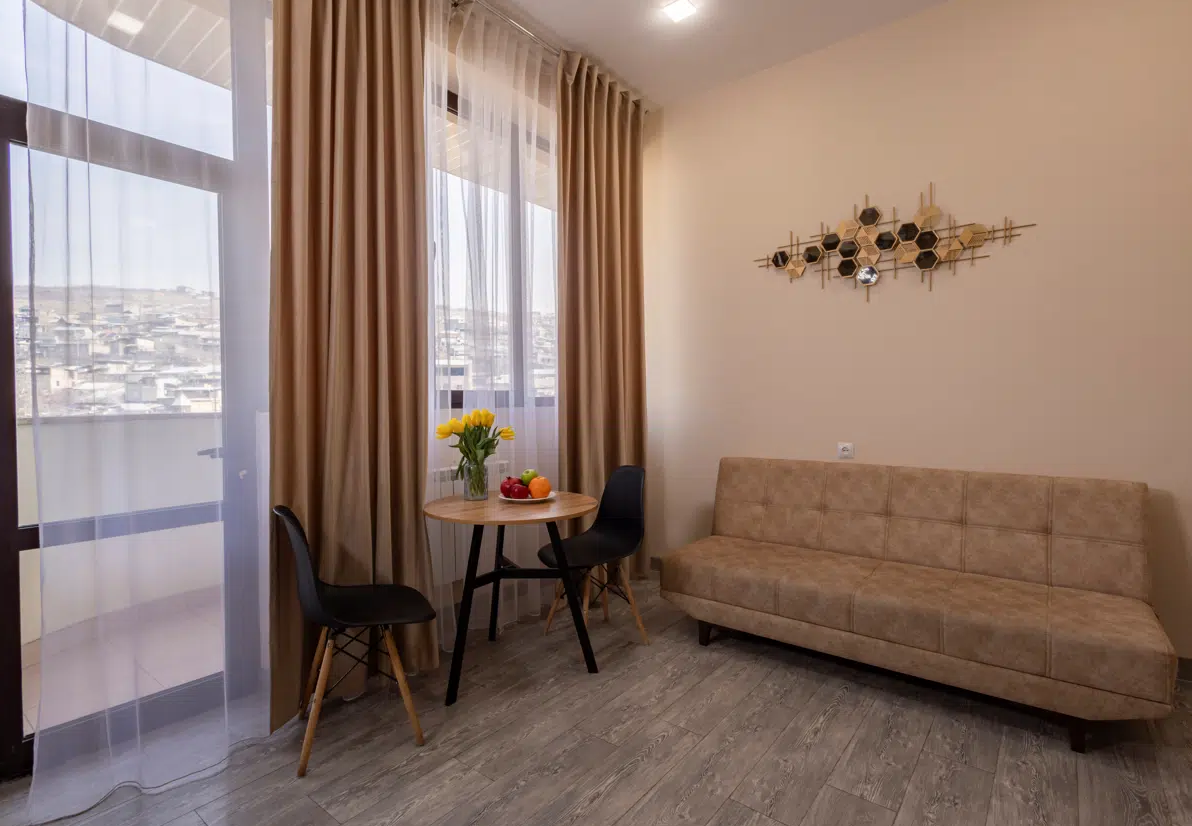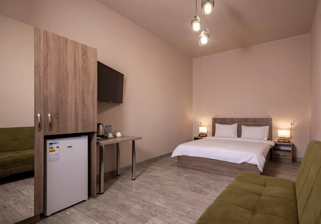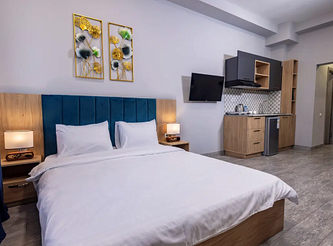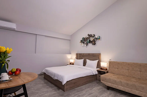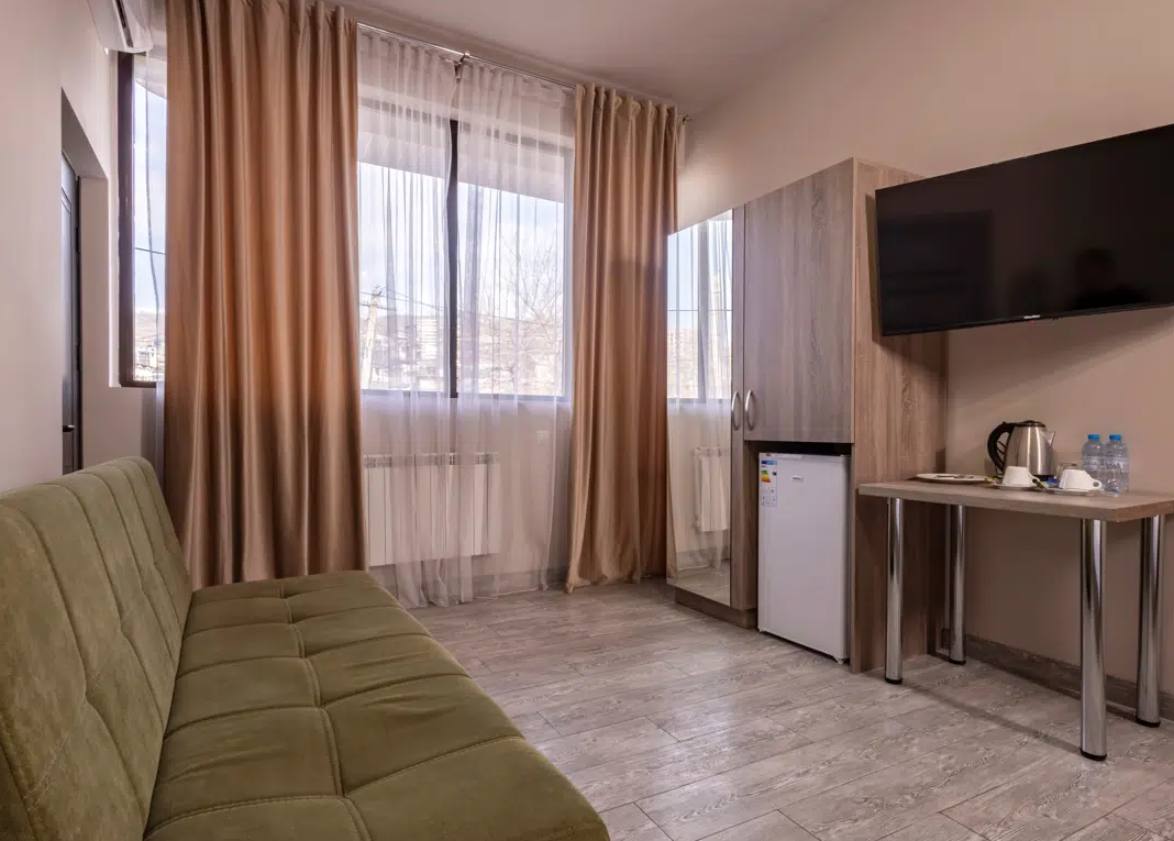 Просторные студии с балконами дарят возможность начинать день за чашечкой кофе с видом на город. Для взыскательных гостей подготовлены делюкс-номера с повышенным уровнем комфорта, а для длительного пребывания — полноценные апартаменты с зоной для отдыха и работы. Все номера оформлены в светлых тонах с использованием натуральных материалов, что создаёт ощущение домашнего тепла.Утро в отеле начинается с ароматного завтрака, где подают как европейские, так и традиционные армянские блюда. Для гостей на автомобиле организована охраняемая парковка, а бесплатный Wi-Fi на всей территории позволяет оставаться на связи. По вечерам в лаунж-зоне можно насладиться атмосферой уюта за бокалом местного вина.