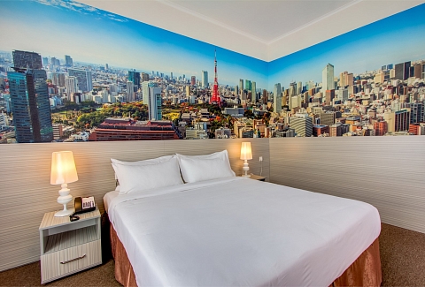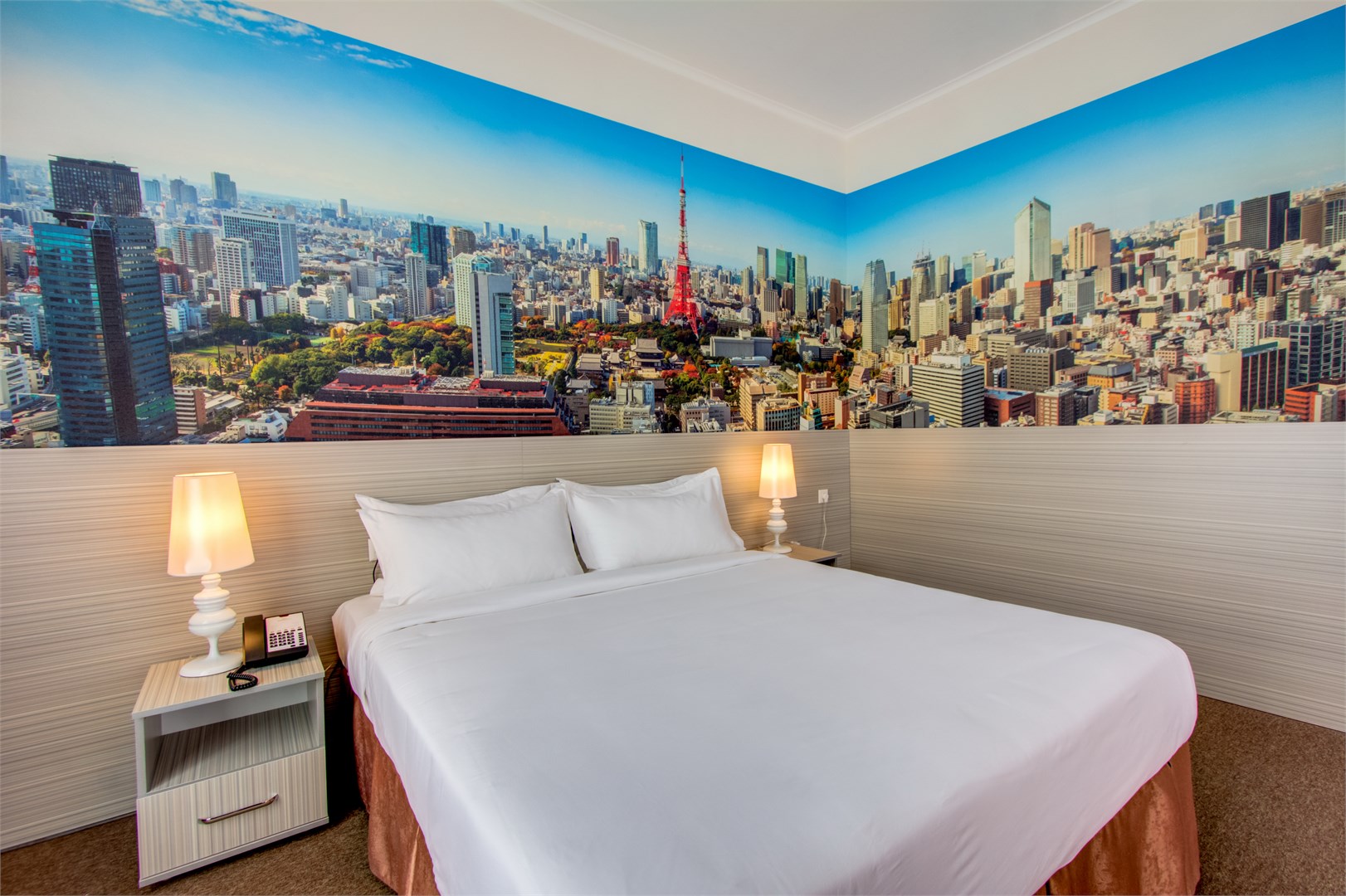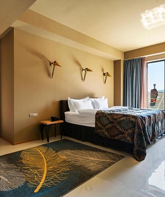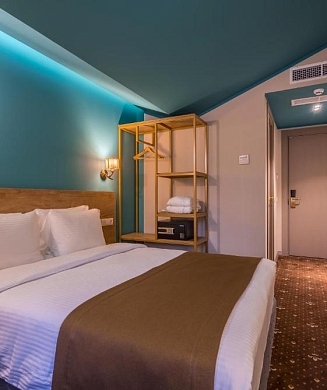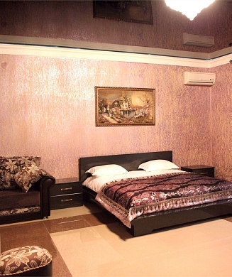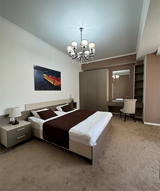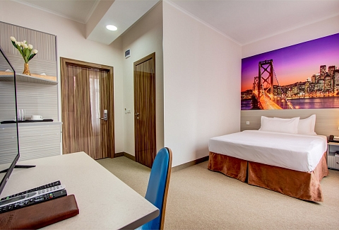 В номере: вешалка, зеркало, кровать двуспальная, прикроватные тумбочки, стол, стулья, шкаф, кондиционер, мини-холодильник, телевизор, телефон, электрочайник
