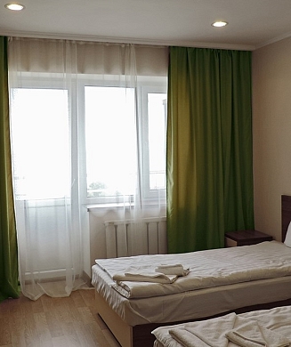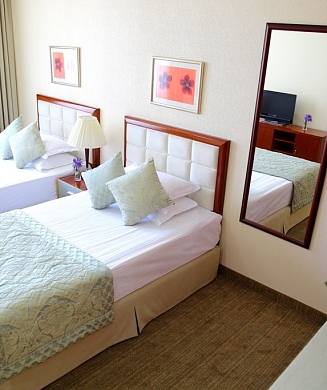 В номере: вешалка, зеркало, кровати односпальные, прикроватные тумбочки, стол, стулья, шкаф, кондиционер, мини-холодильник, телевизор, телефон, электрочайник