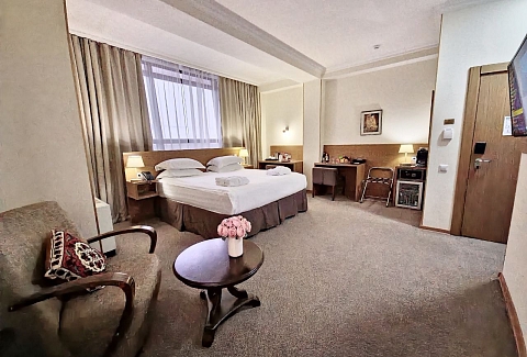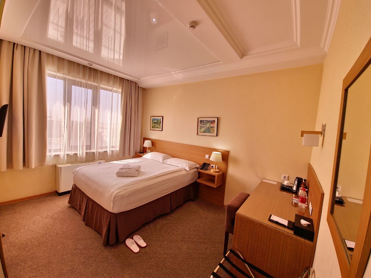 В номере: вешалка, зеркало, кровать двуспальная, прикроватные тумбочки, стол, стул, шкаф, кондиционер, телевизор, телефон, холодильник, чайный набор посуды, электрочайник