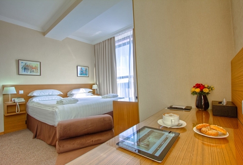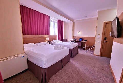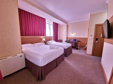 В номере: вешалка, зеркало, кровати односпальные, прикроватные тумбочки, стол, стул, шкаф, кондиционер, телевизор, телефон, холодильник, чайный набор посуды, электрочайник