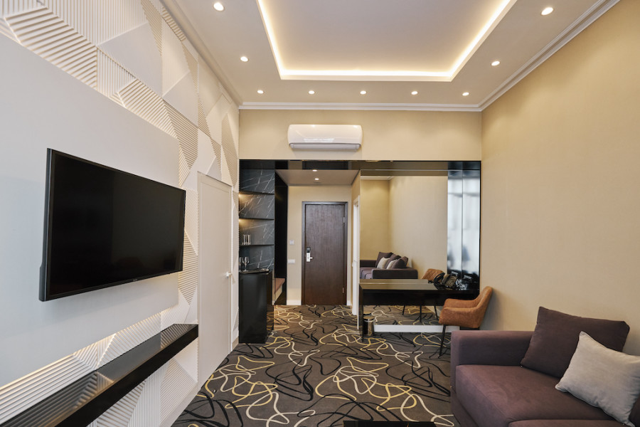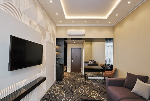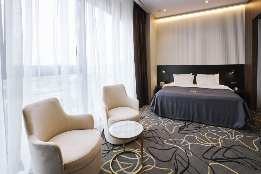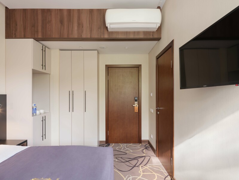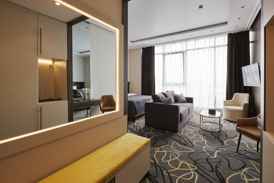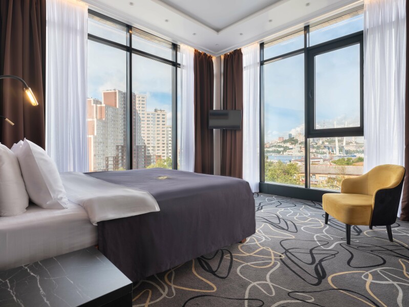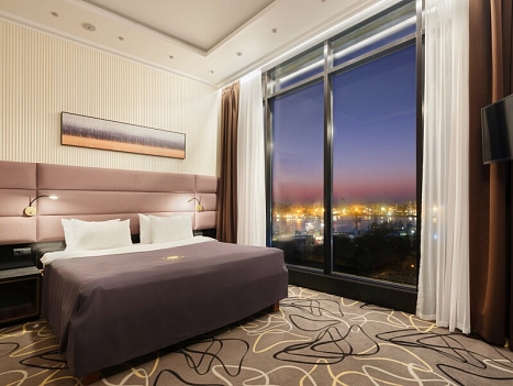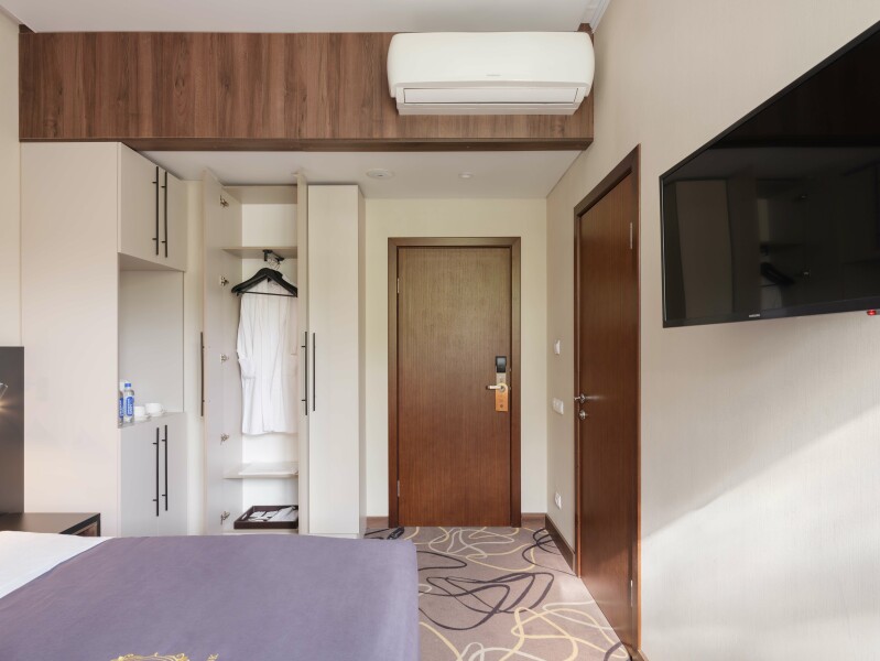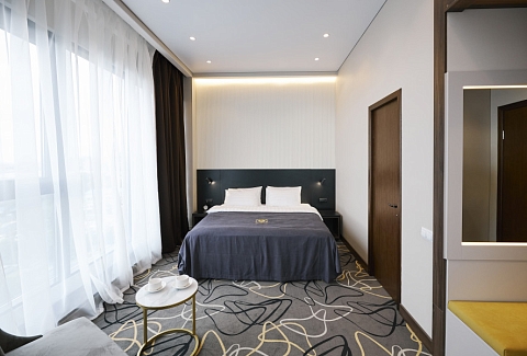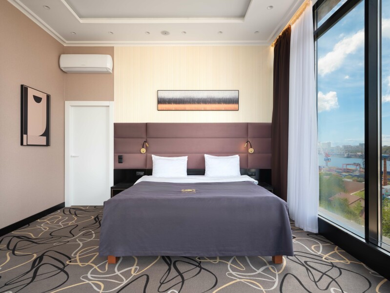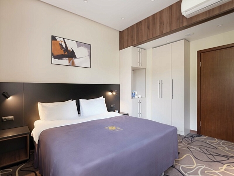 В номере: зеркало, кровать двуспальная, прикроватные тумбочки, стол, стулья, шкаф, кондиционер, сейф, телевизор, телефон