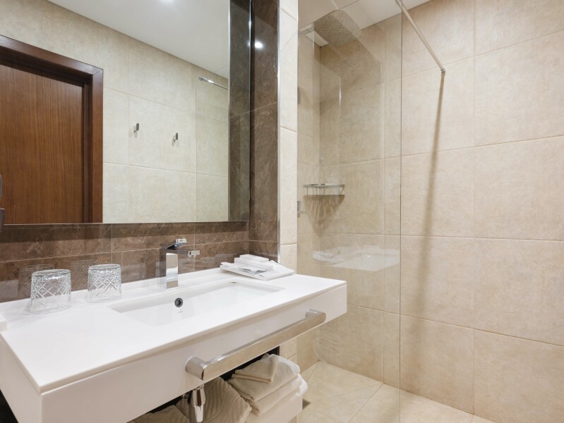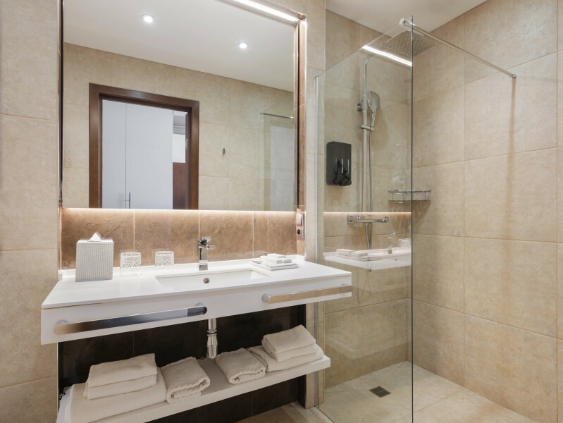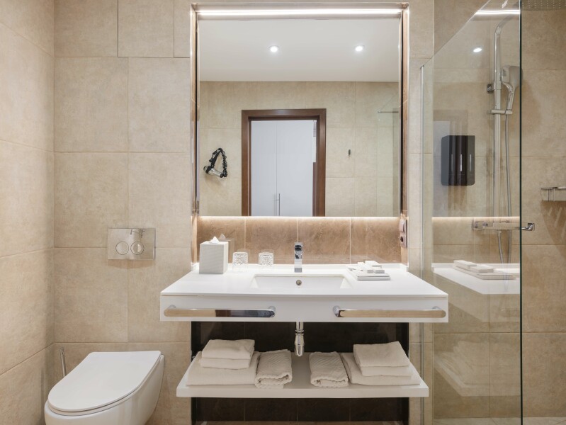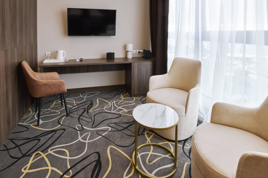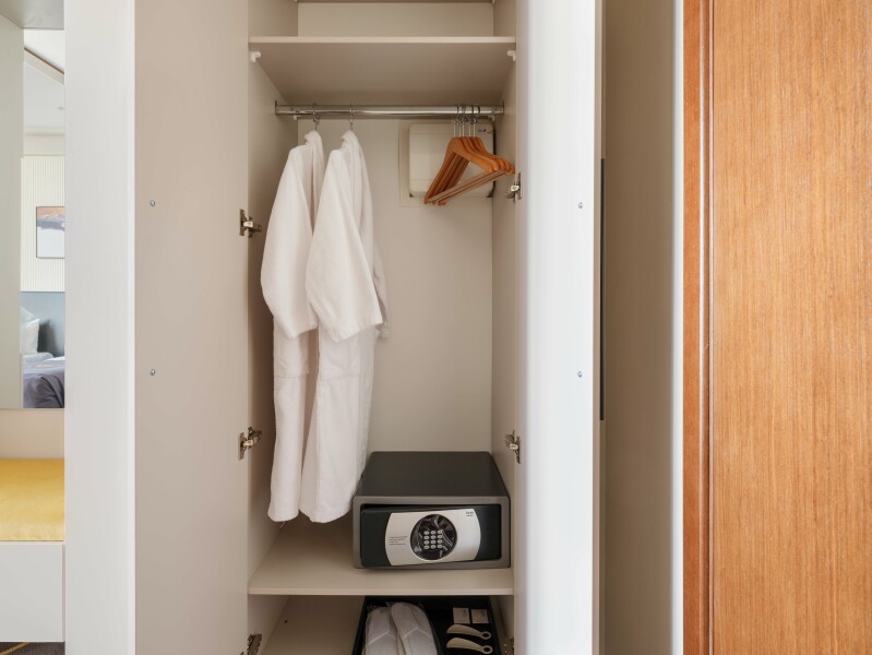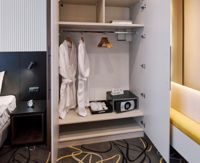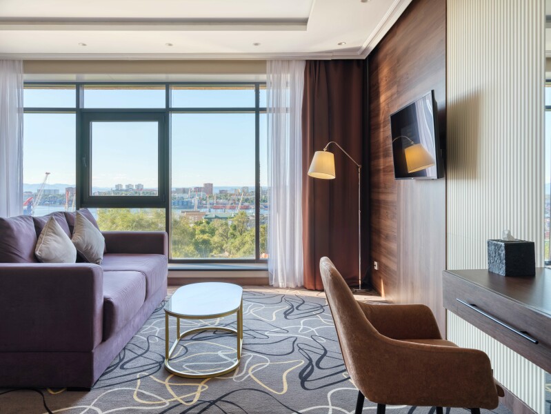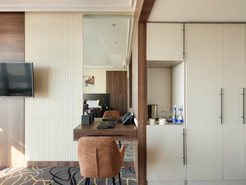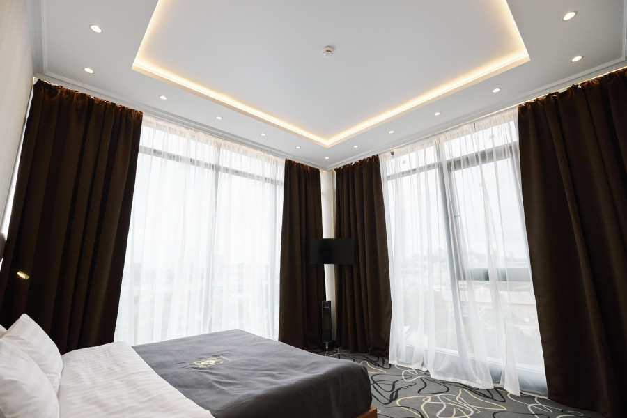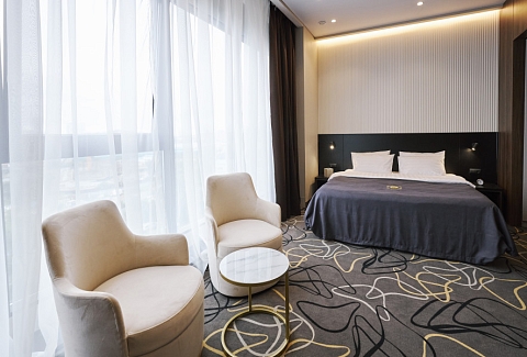 В номере: зеркало, кровать двуспальная, прикроватные тумбочки, стол, стулья, шкаф, кондиционер, сейф, телевизор, телефон