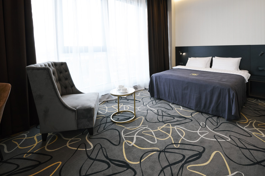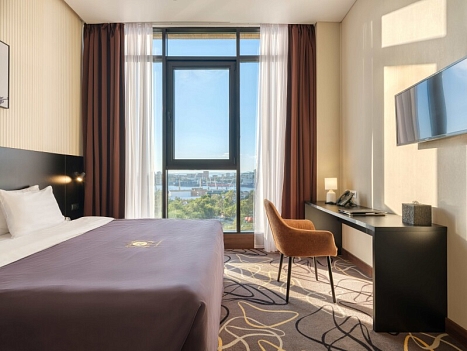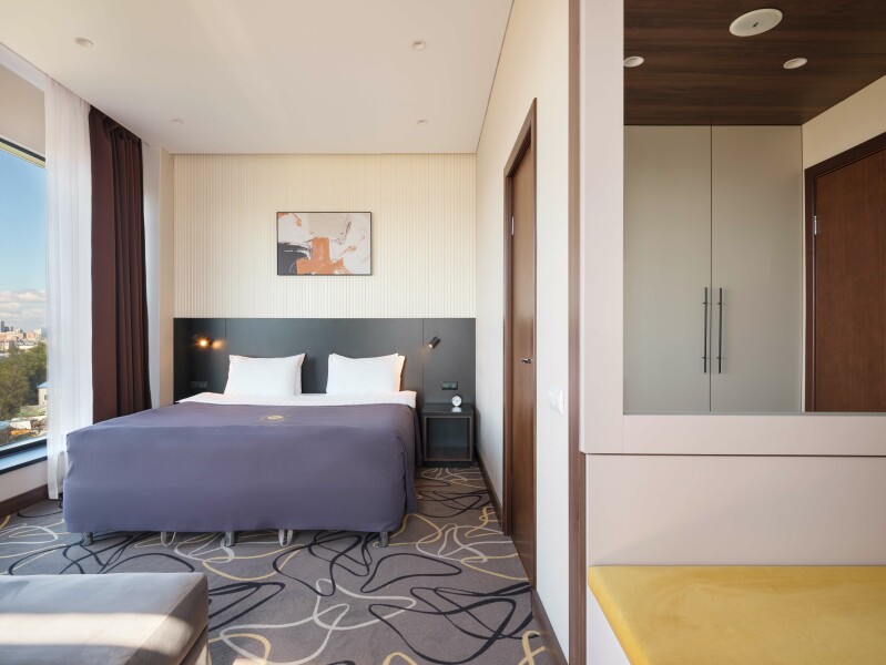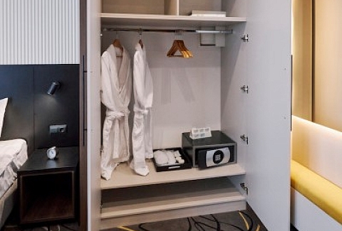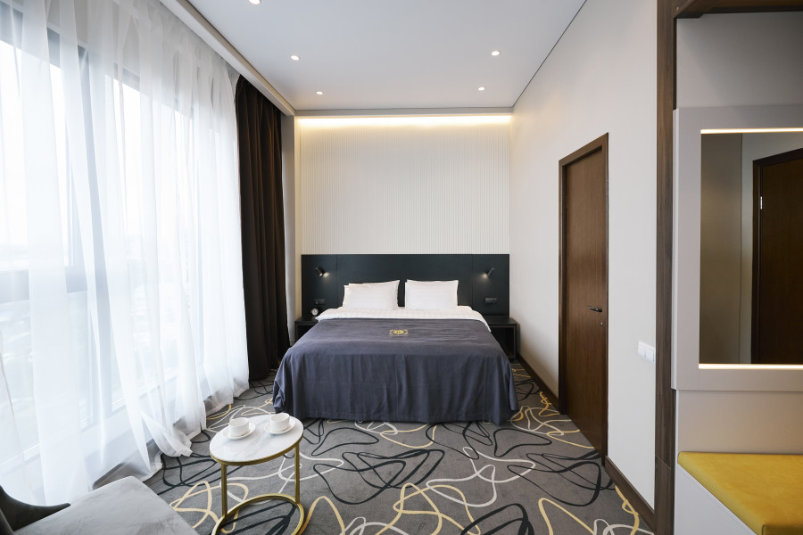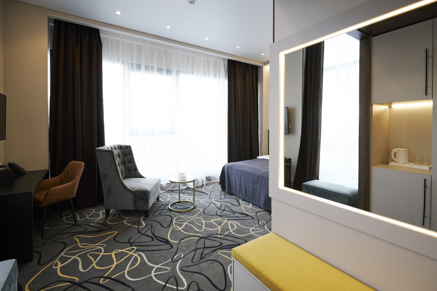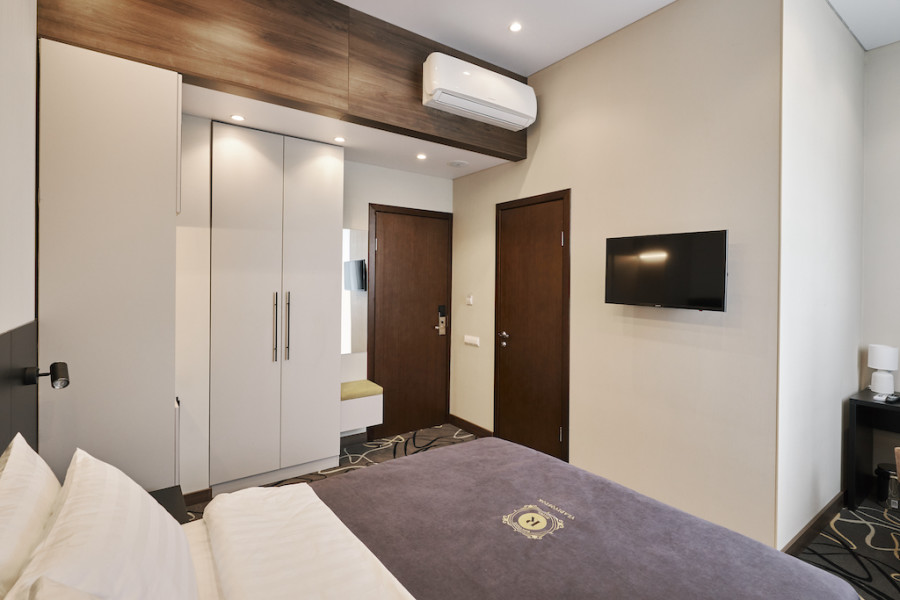 В номере: зеркало, кровать двуспальная, прикроватные тумбочки, стол, стул, шкаф, кондиционер, сейф, телевизор, телефон