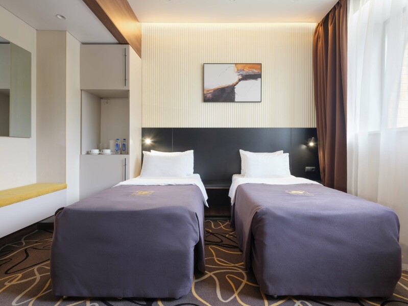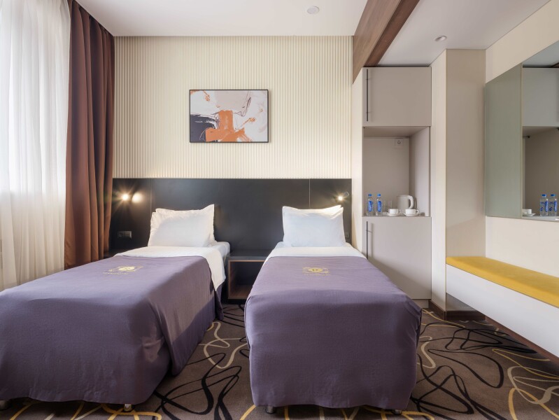 В номере: зеркало, кровати односпальные, прикроватные тумбочки, стол, стул, шкаф, кондиционер, сейф, телевизор, телефон