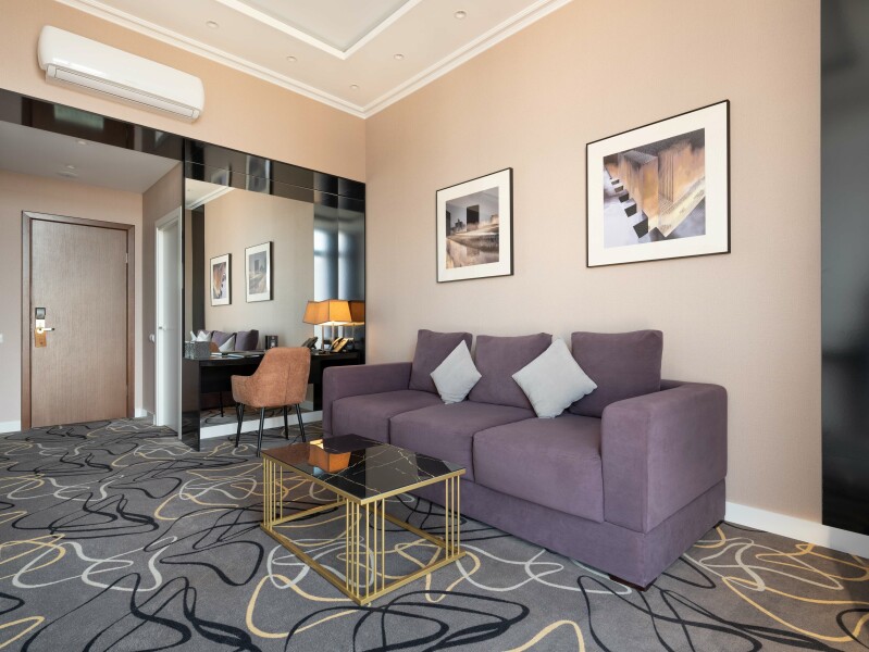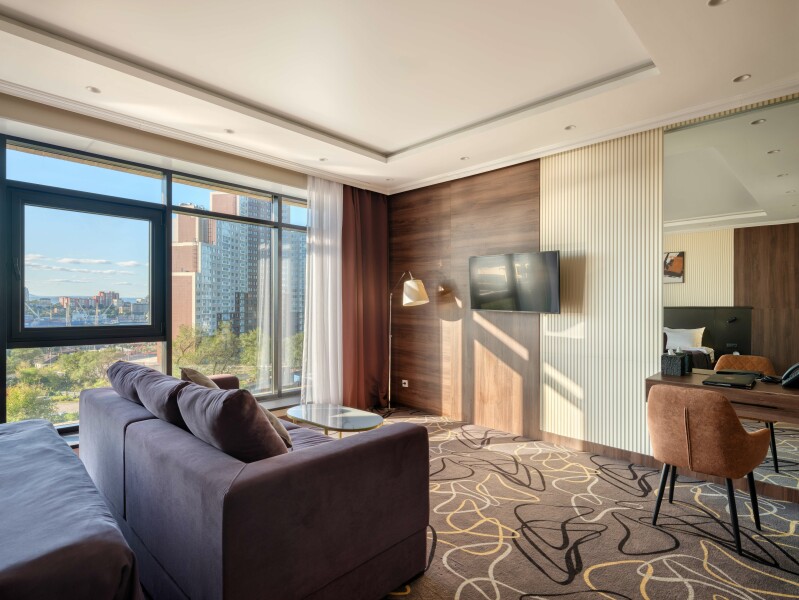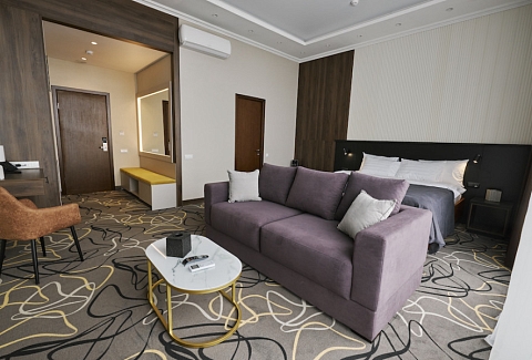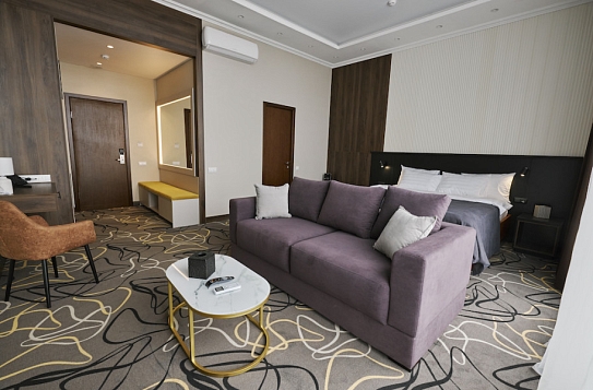 В номере: диван, зеркало, кровать двуспальная, прикроватные тумбочки, стол, стулья, шкаф, кондиционер, сейф, телевизор, телефон