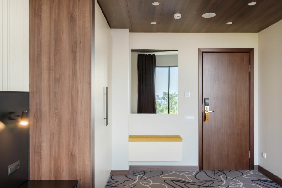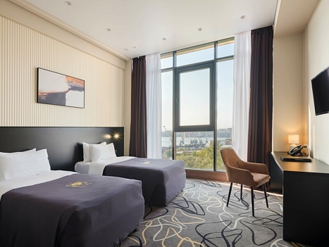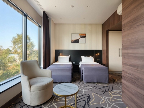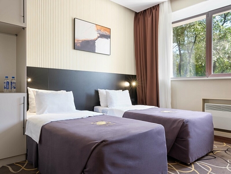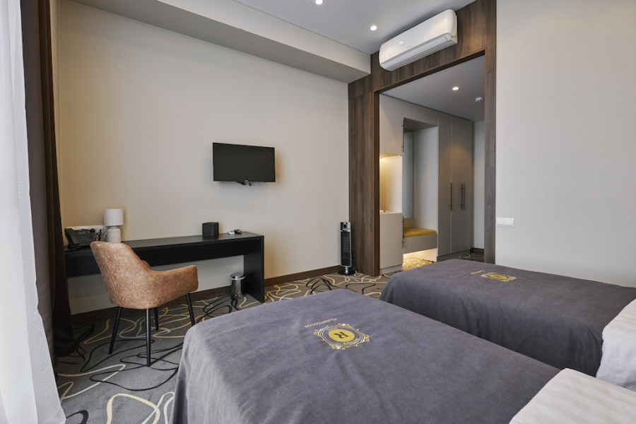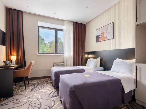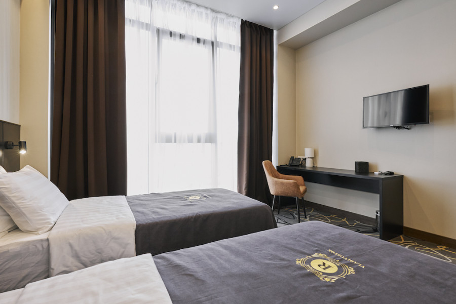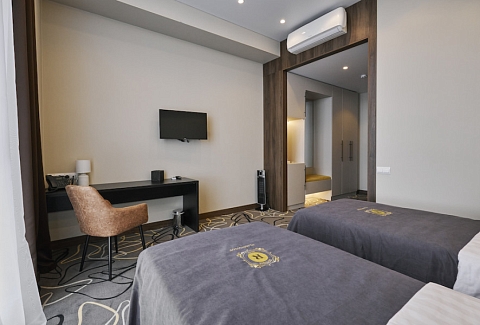 В номере: зеркало, кровати односпальные, прикроватные тумбочки, стол, стулья, шкаф, кондиционер, сейф, телевизор, телефон