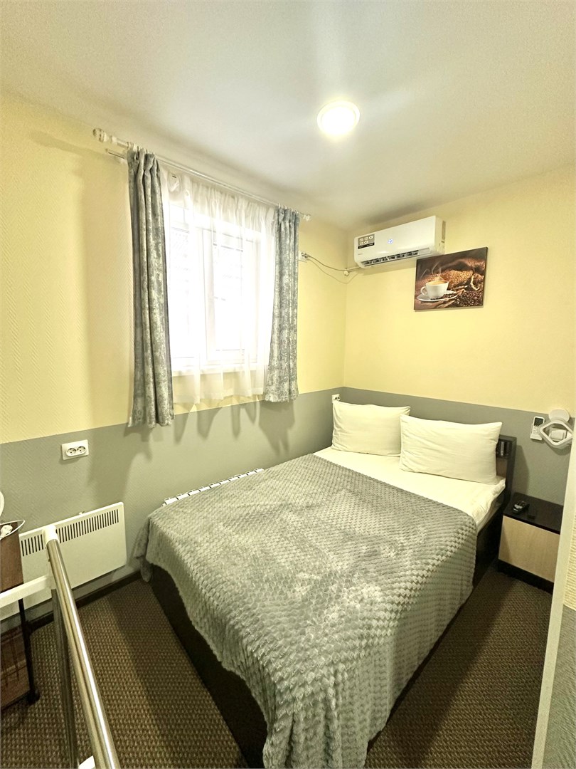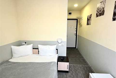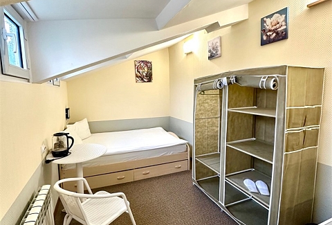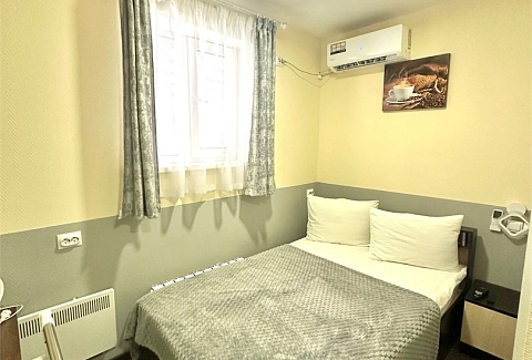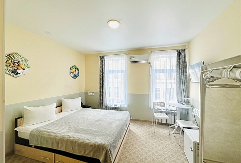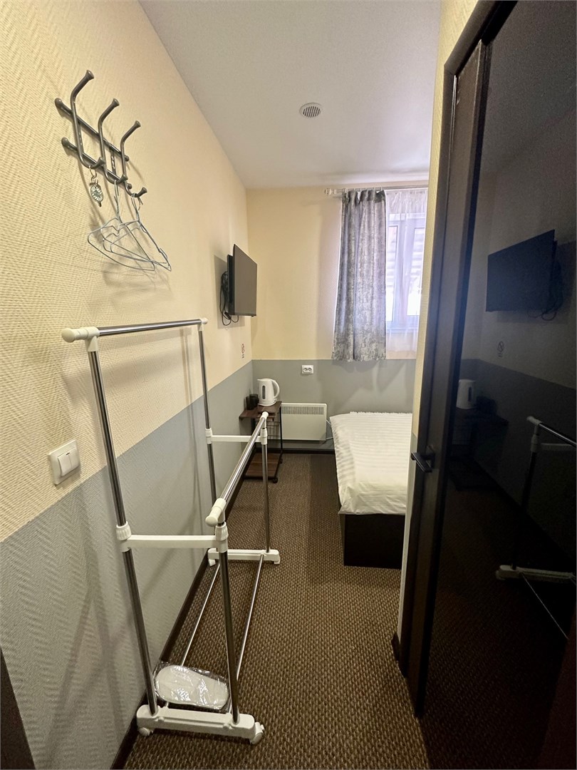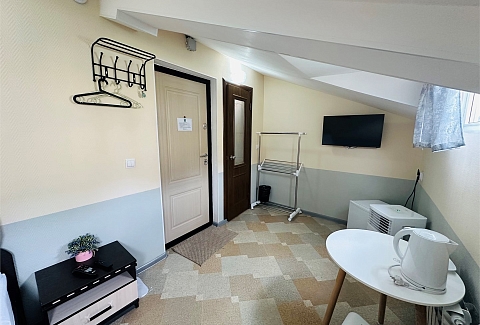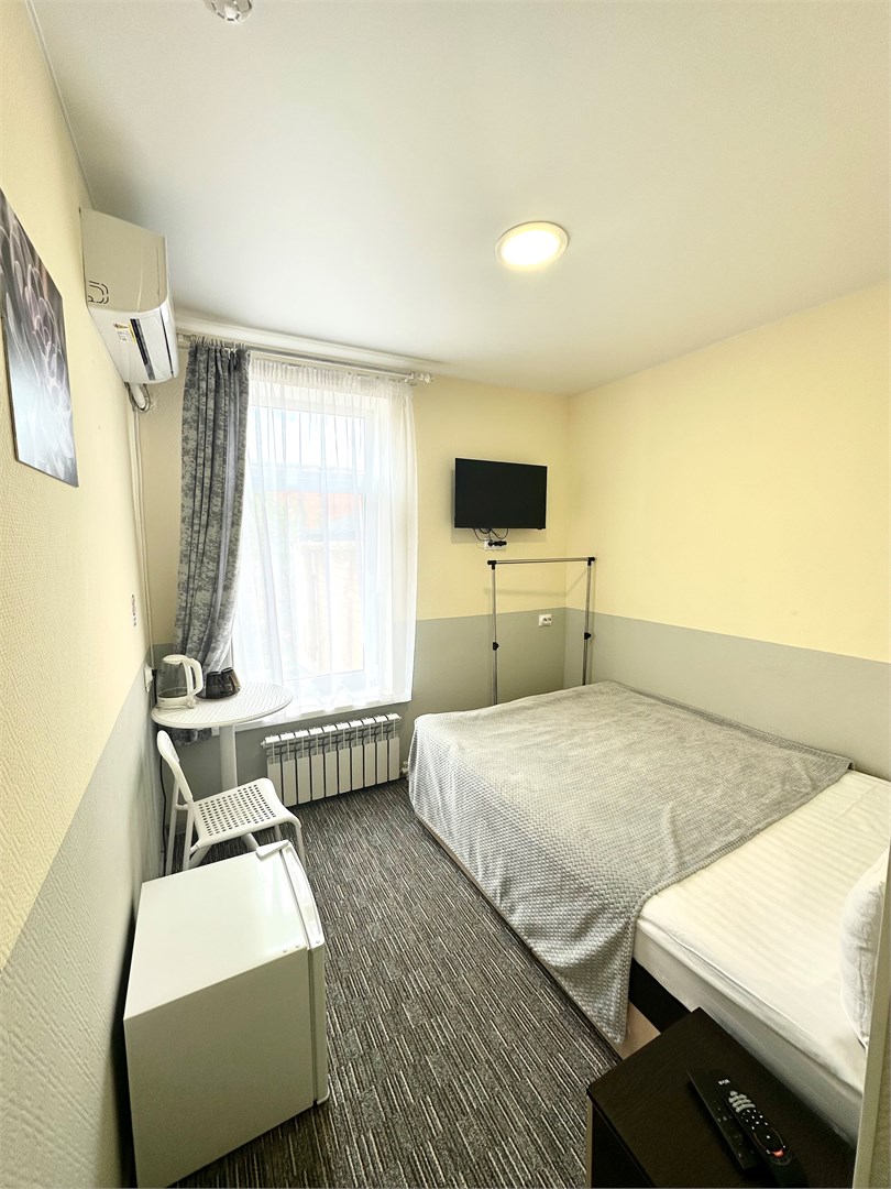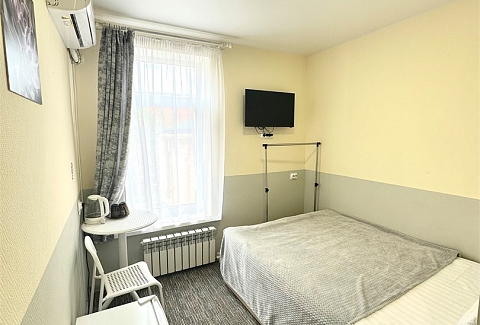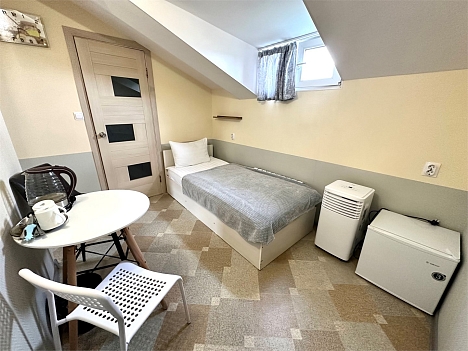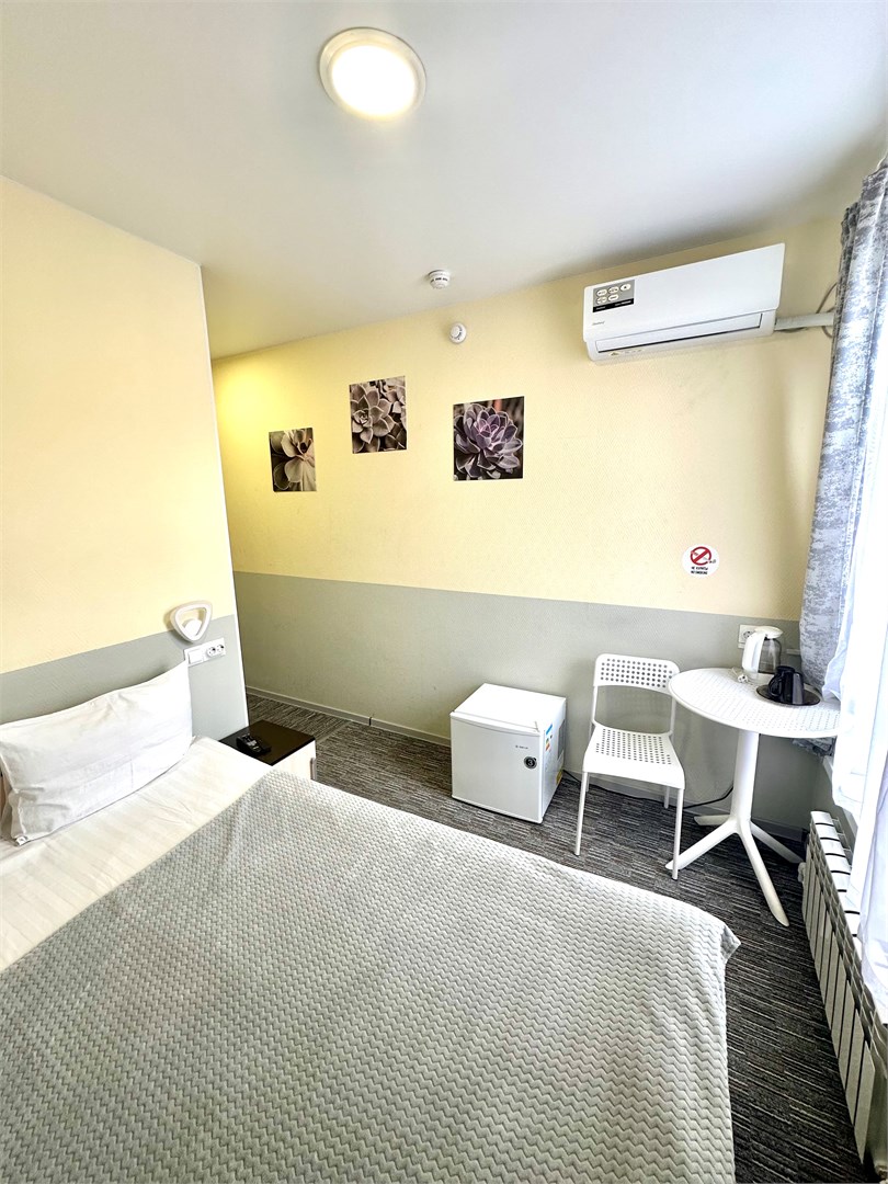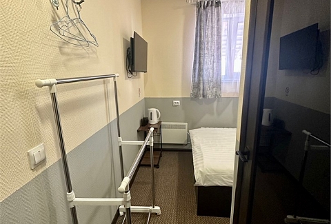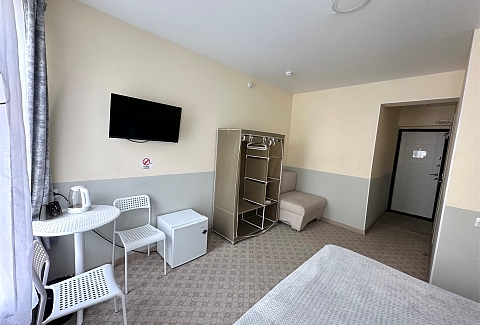 В номере: вешалка, зеркало, кровать односпальная, стол, стулья, тумба, кондиционер, мини-холодильник, телевизор, утюг, чайник