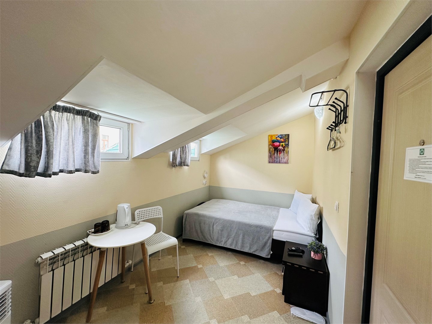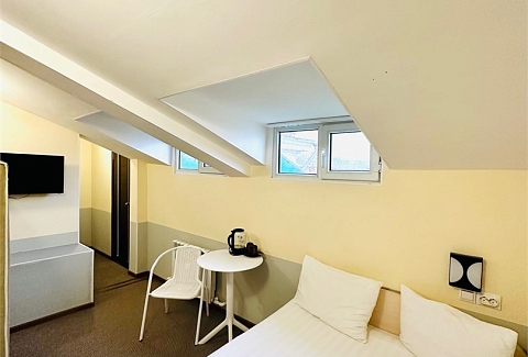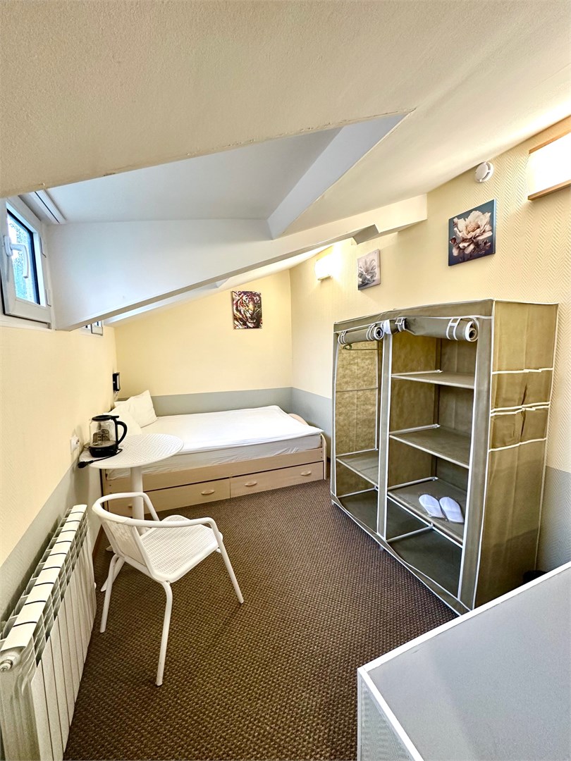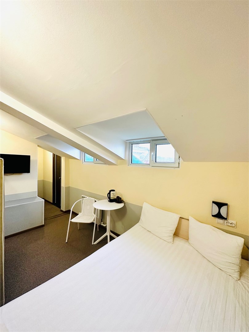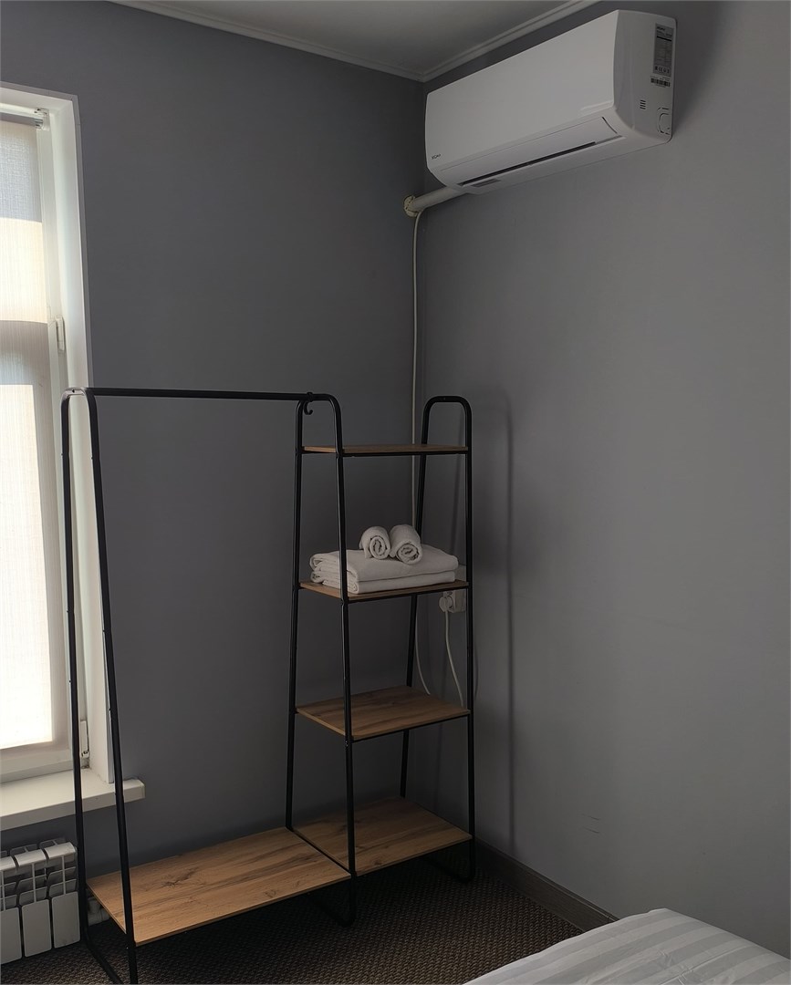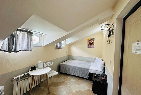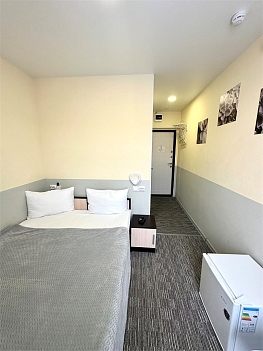 В номере: вешалка, зеркало, кровать односпальная, стол, стулья, тумба, кондиционер, мини-холодильник, телевизор, утюг, чайник