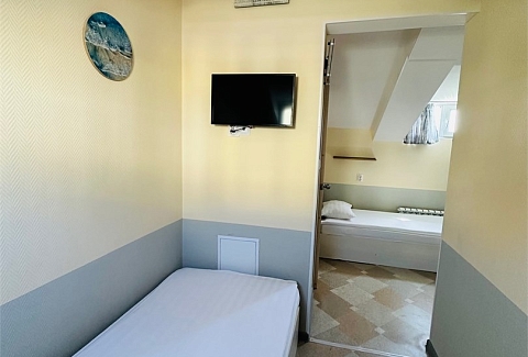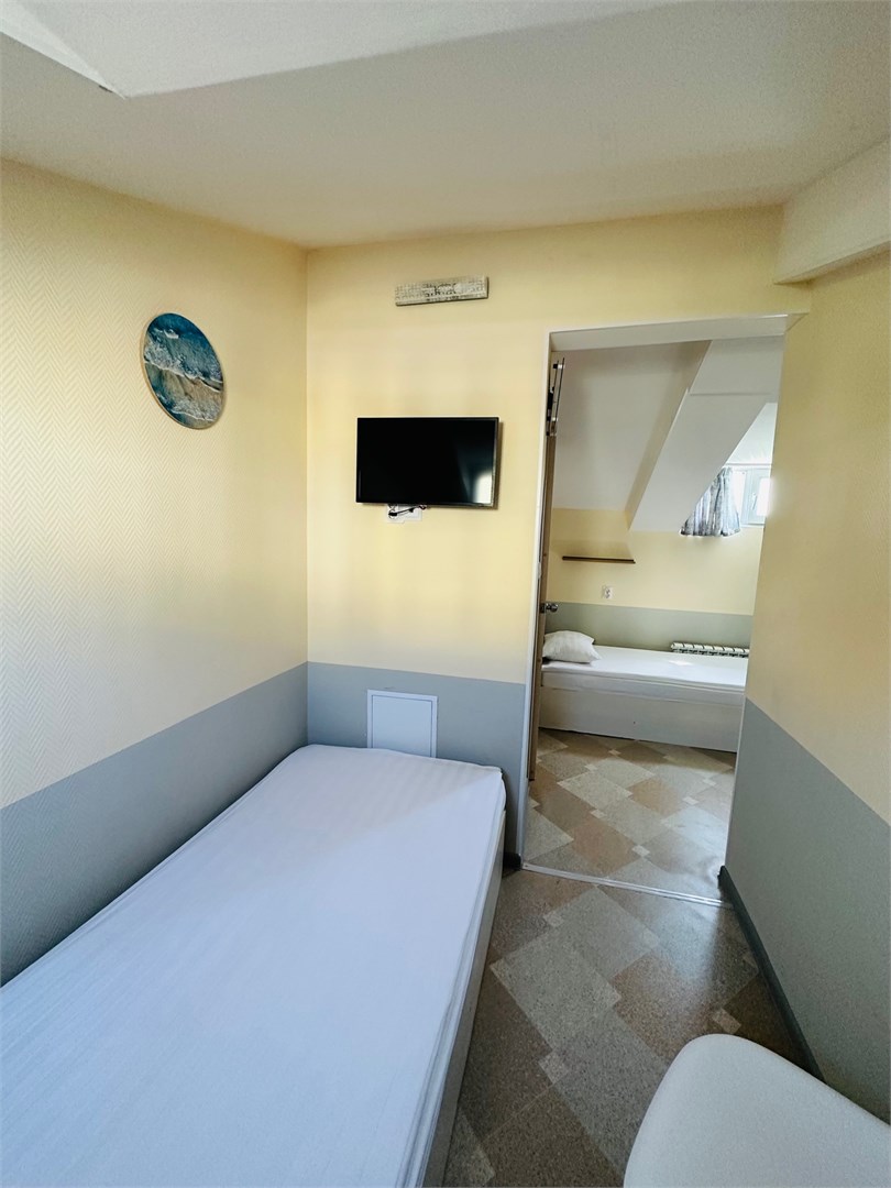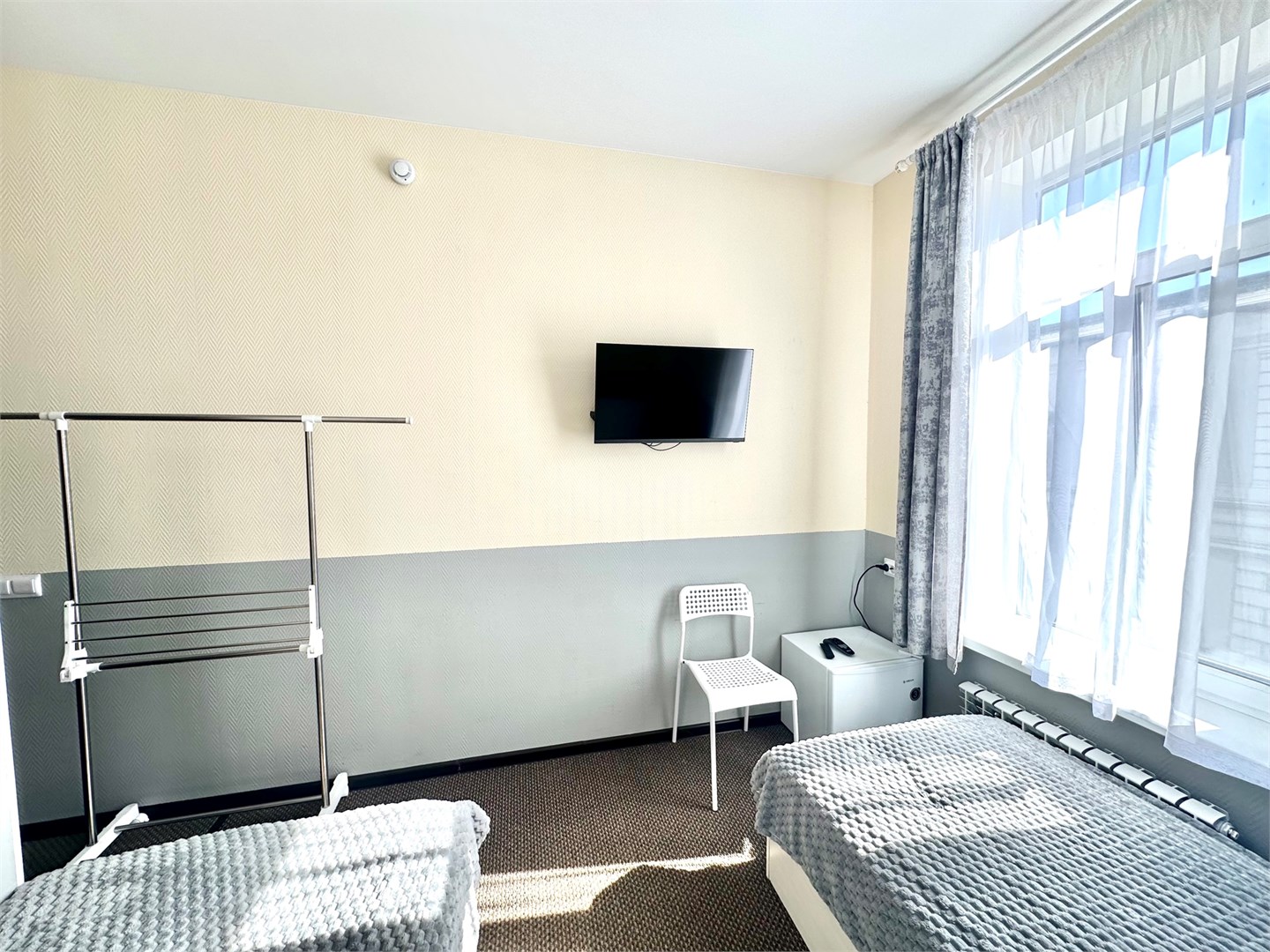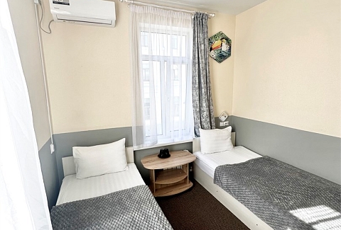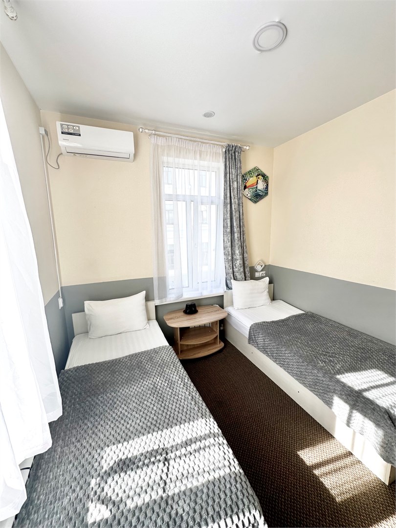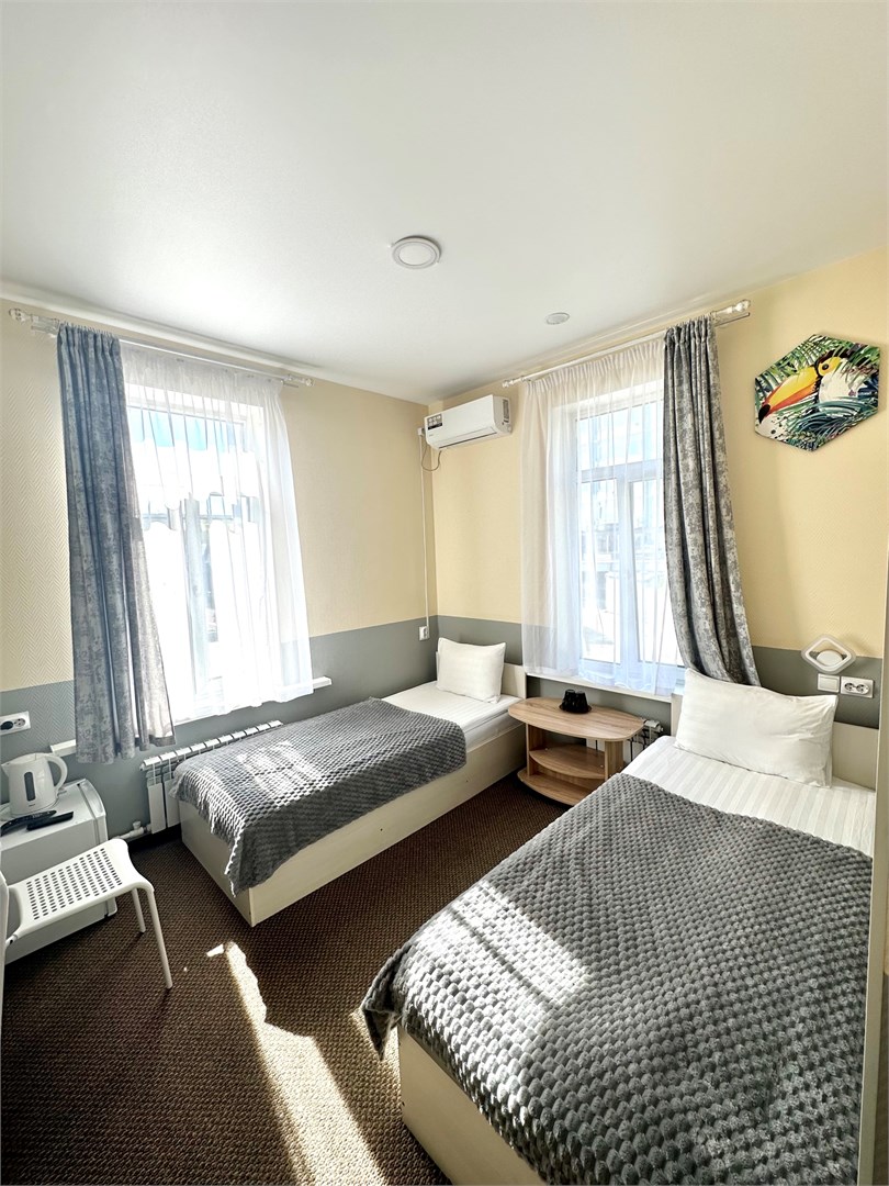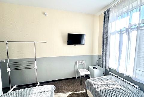 В номере: вешалка, зеркало, кровати односпальные, прикроватная тумбочка, стол, стулья, кондиционер, мини-холодильник, телевизор, утюг