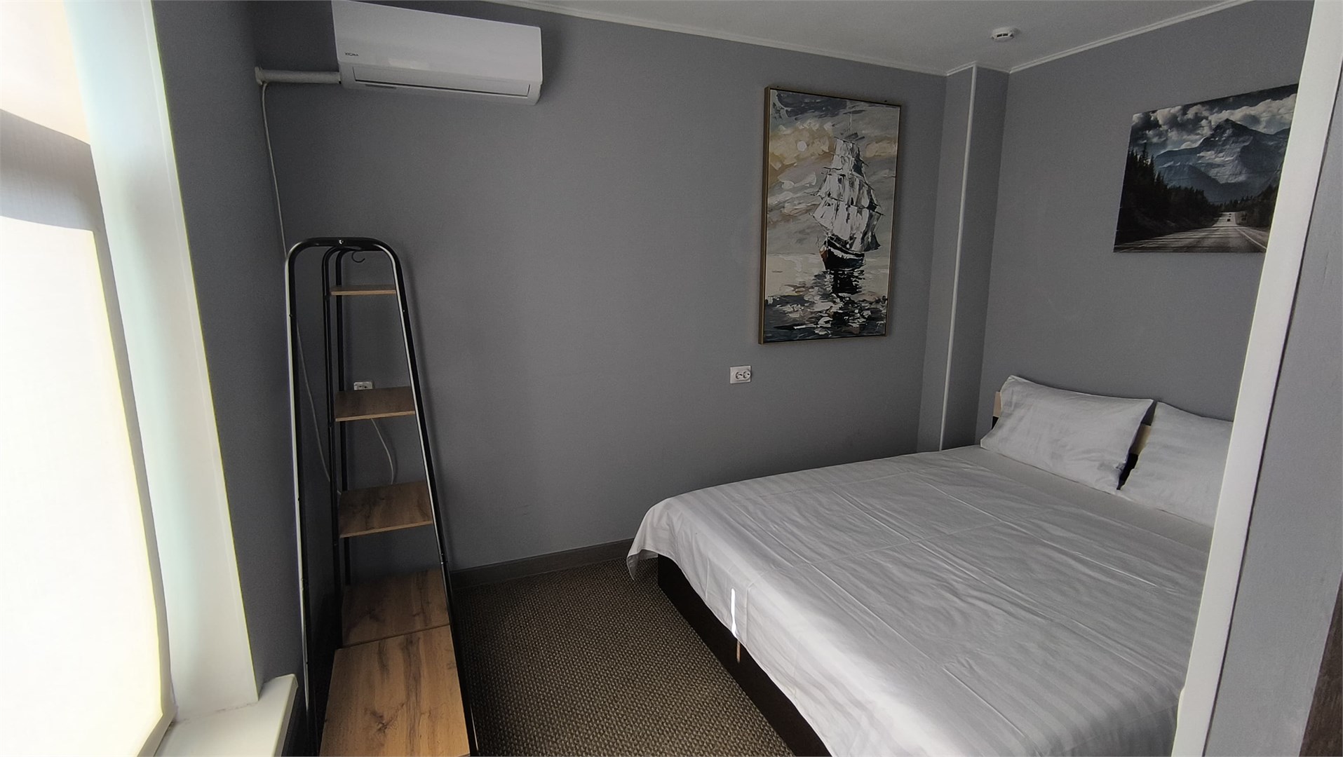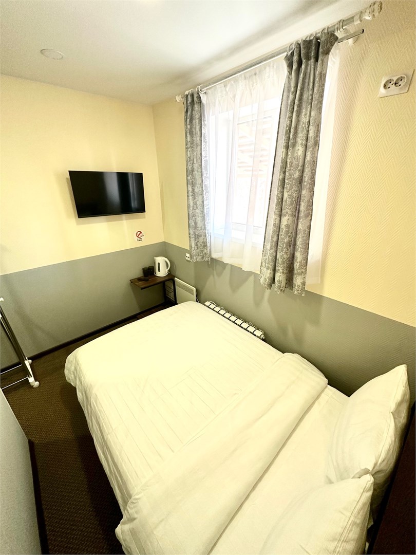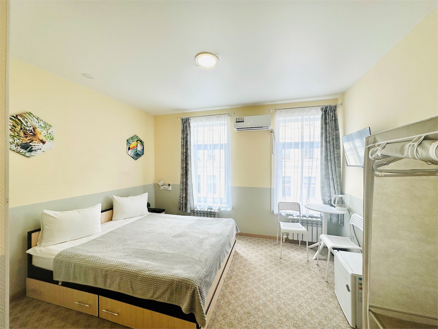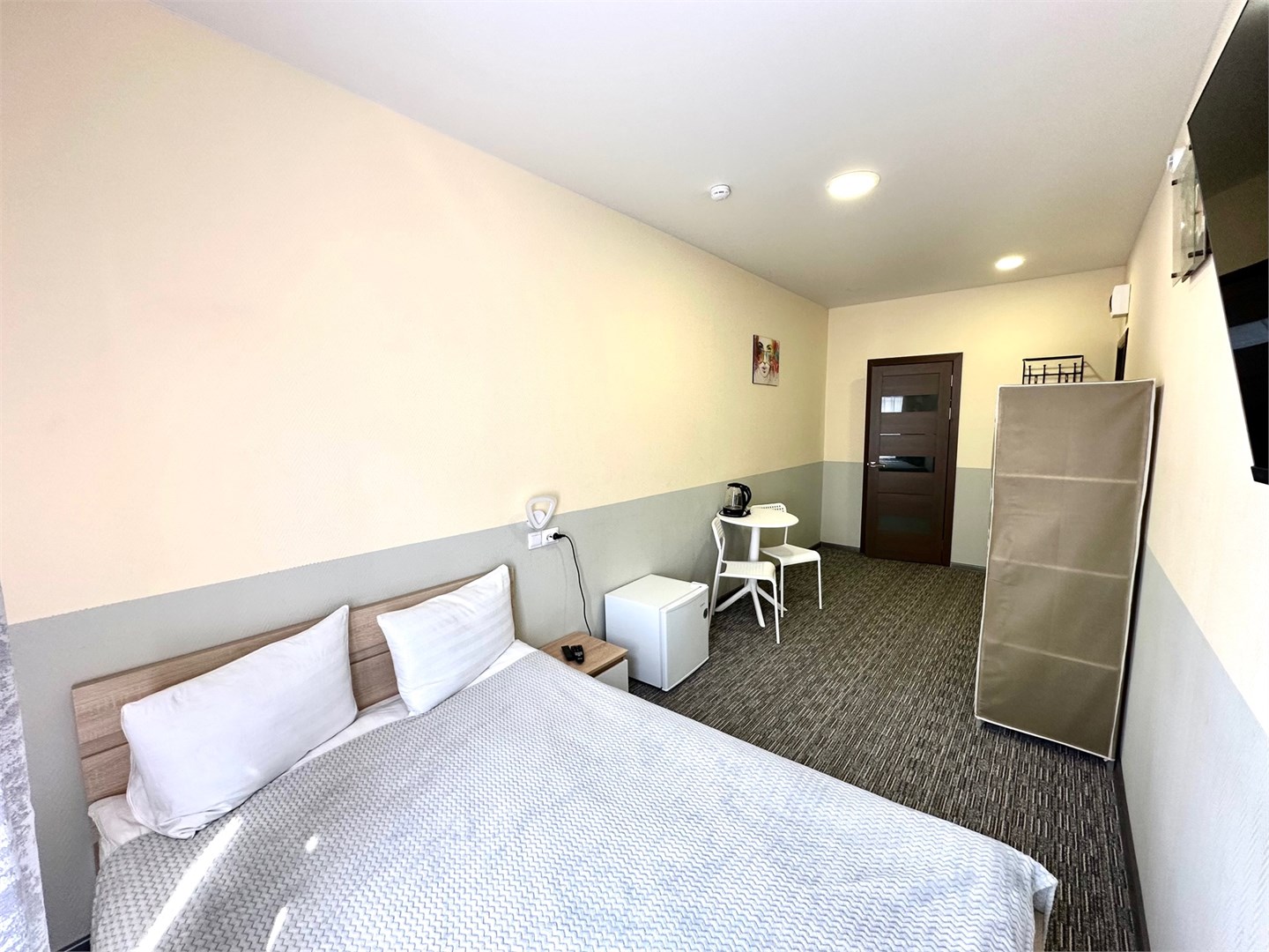 В номере: вешалка, зеркало, кровать двуспальная, стол, стулья, кондиционер, мини-холодильник, телевизор, чайник