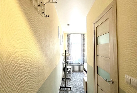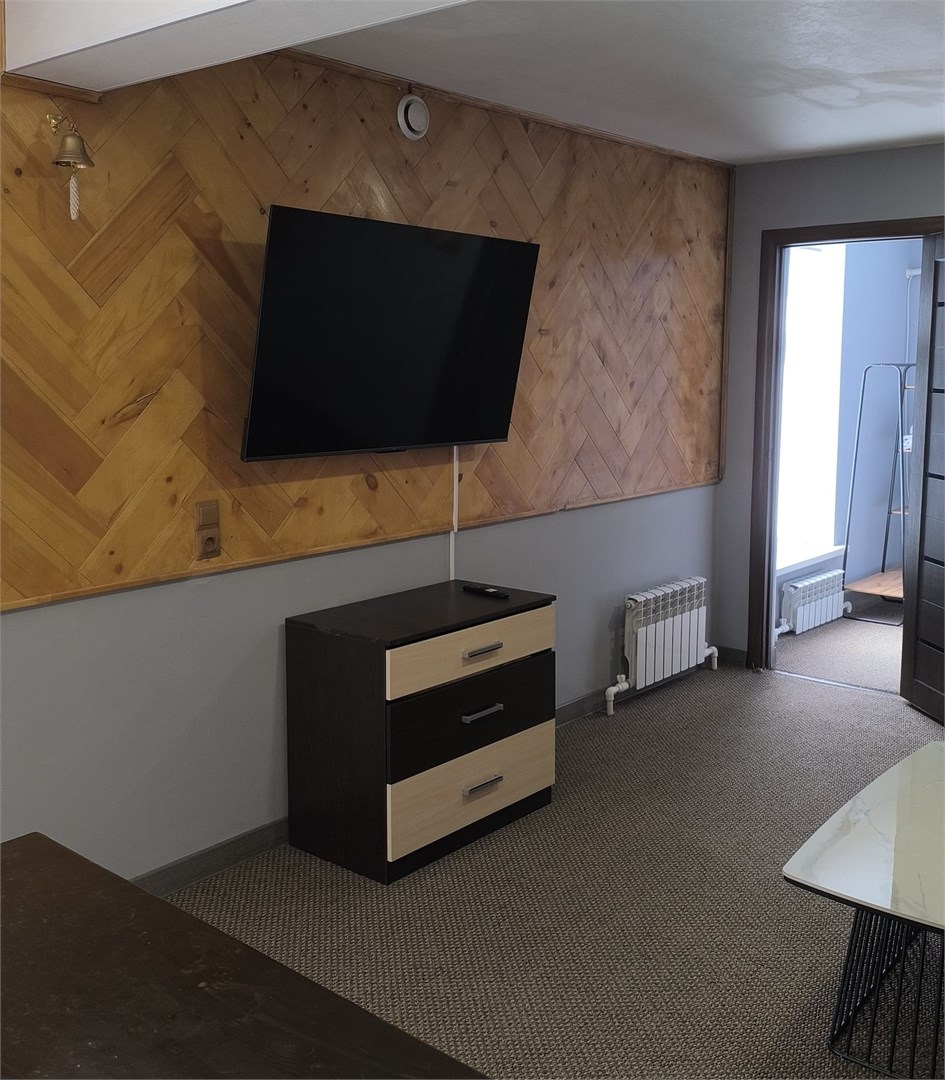 В номере: вешалка, зеркало, кровать полутороспальная, столик журнальный, тумба, микроволновая печь, обогреватель, телевизор, утюг, чайник