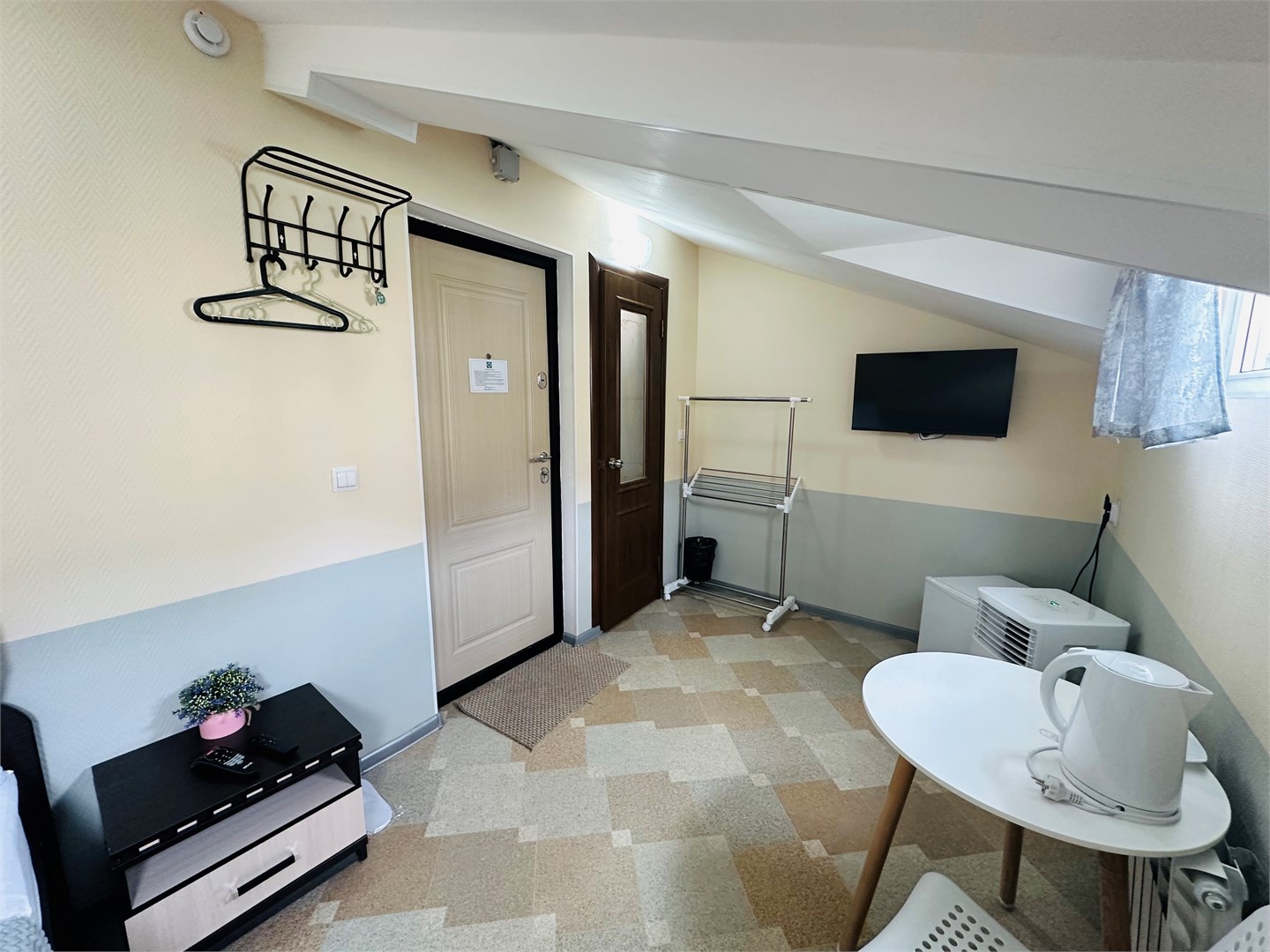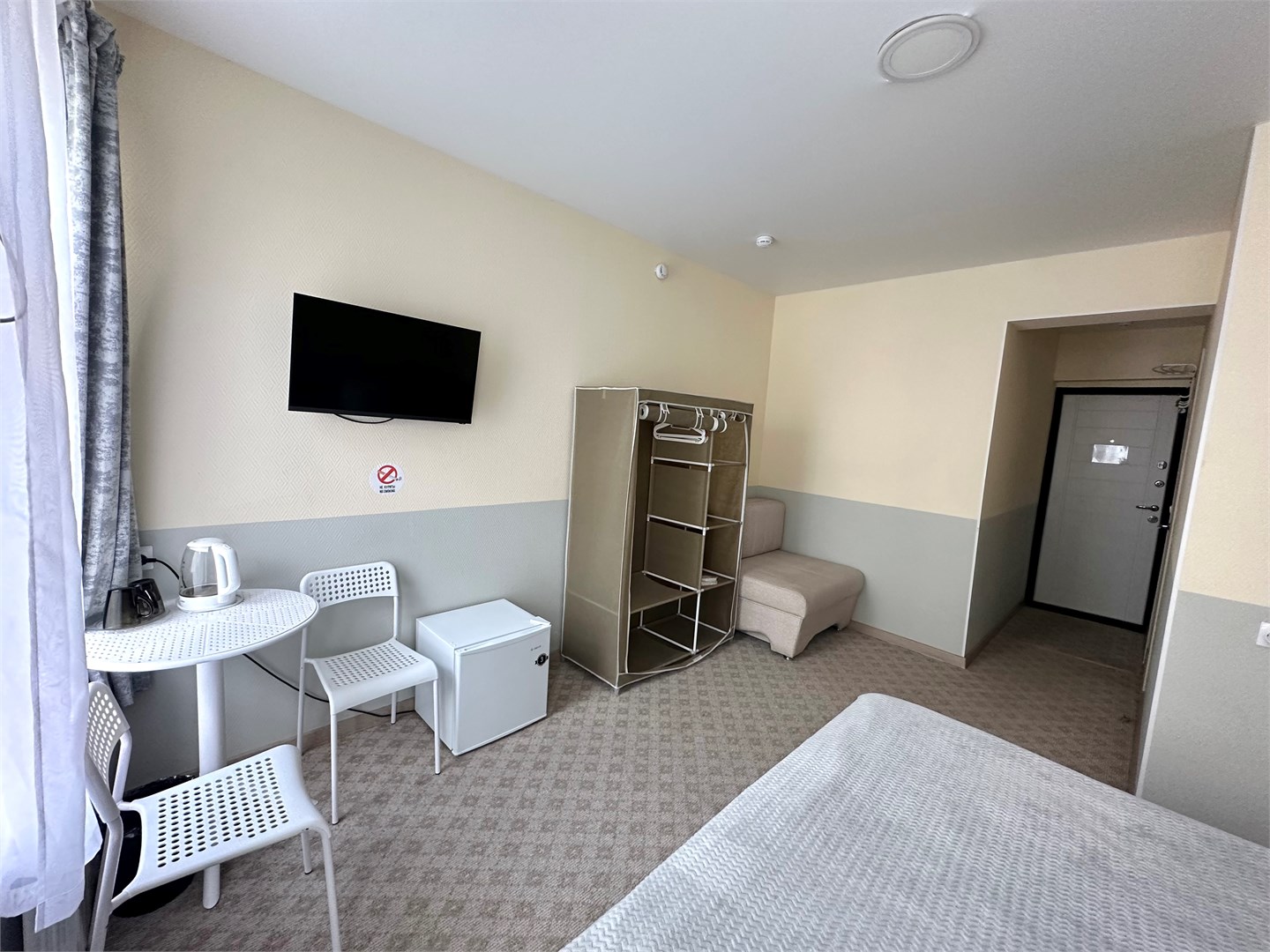 В номере: вешалка, кровать двуспальная, прикроватная тумбочка, стол, стулья, кондиционер, микроволновая печь, мини-холодильник, обогреватель, телевизор, утюг, чайник