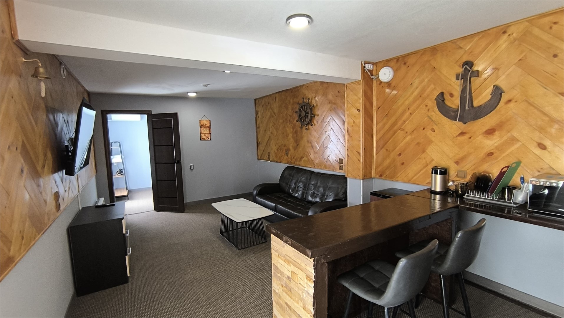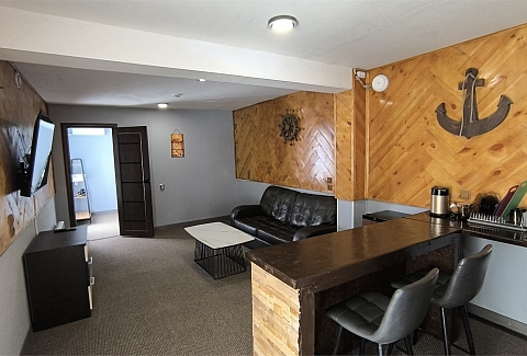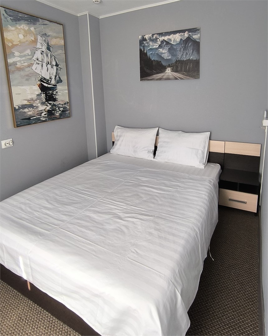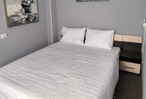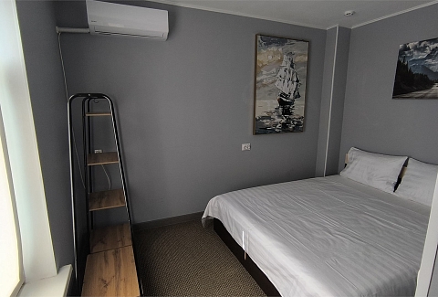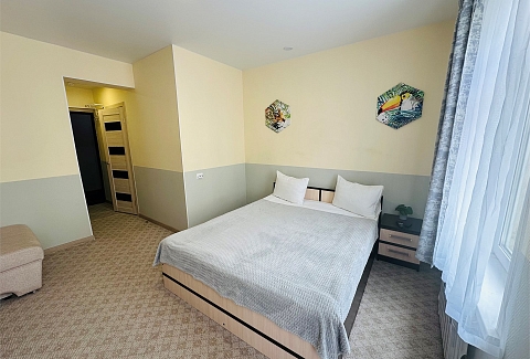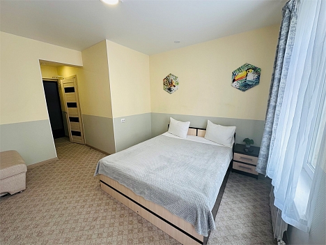 В номере: вешалка, диван раскладной, комод, кровать двуспальная, прикроватные тумбочки, стол, стулья, кондиционер, микроволновая печь, мини-холодильник, набор посуды, телевизор, утюг, чайник
