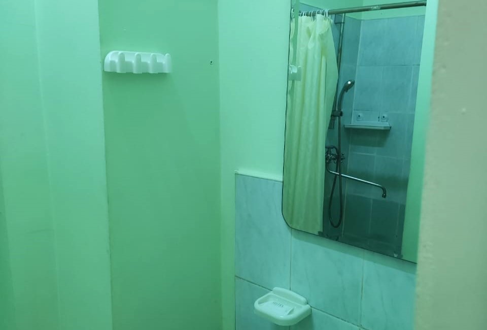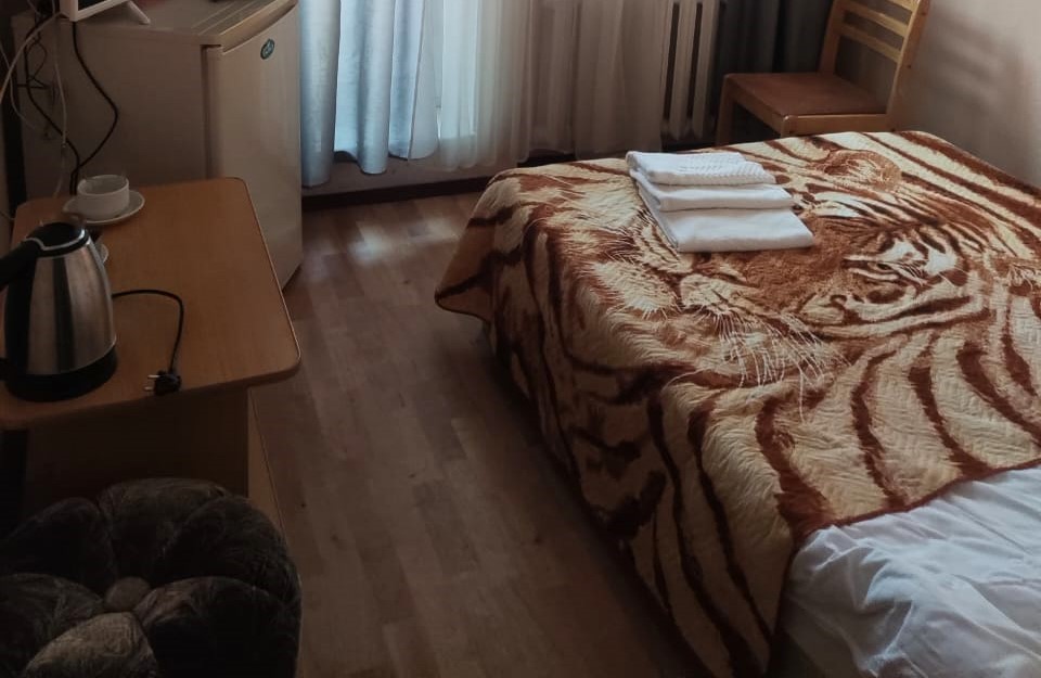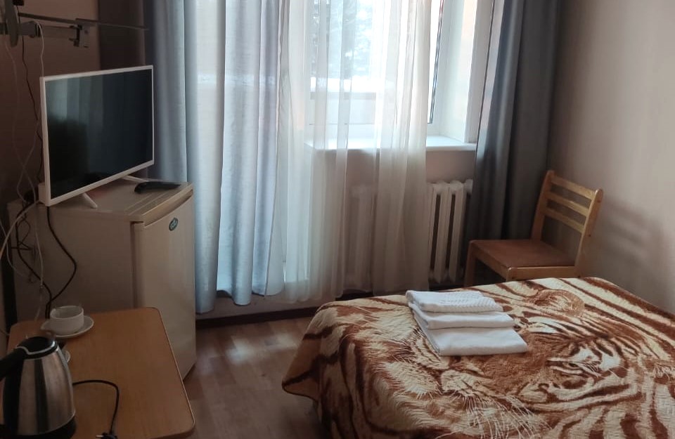 В номере: кровать полутороспальная, стол, стул, тумба, шкаф, кондиционер, телевизор, холодильник, электрочайник