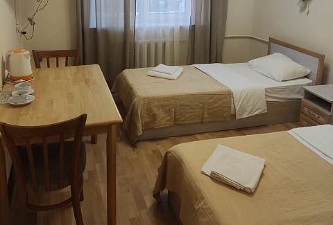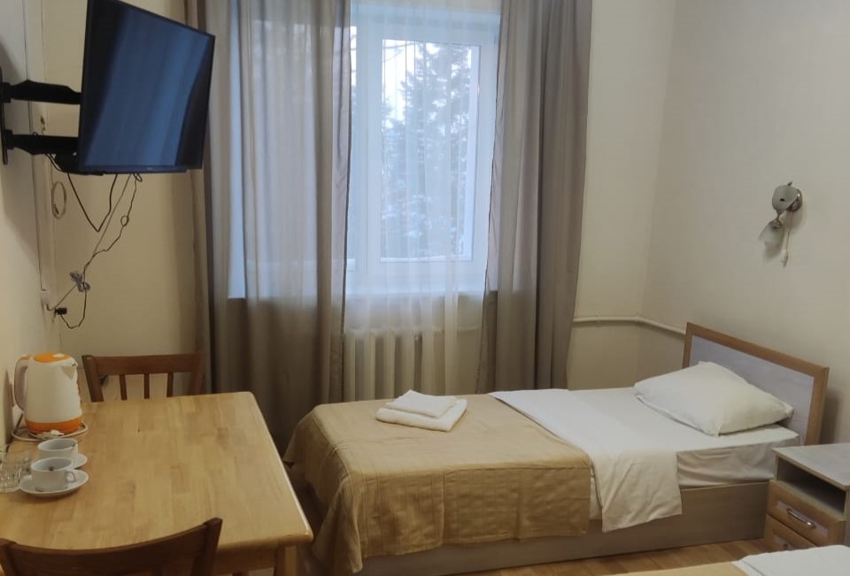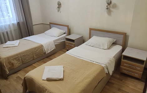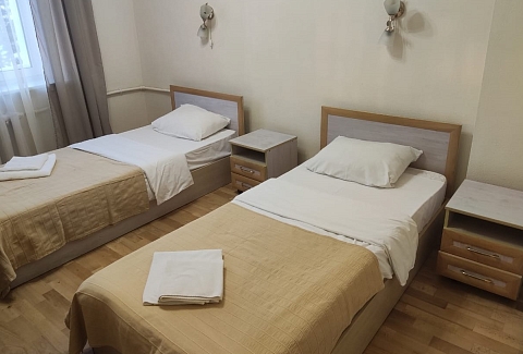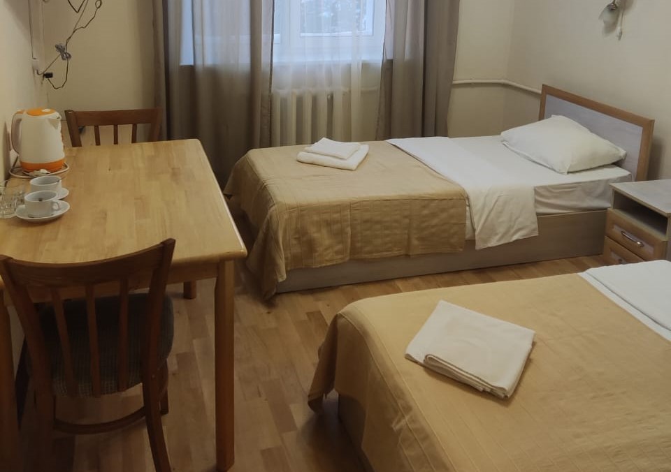 В номере: кровати односпальные, прикроватные тумбочки, стол, стулья, шкаф, кондиционер, телевизор, холодильник, электрочайник