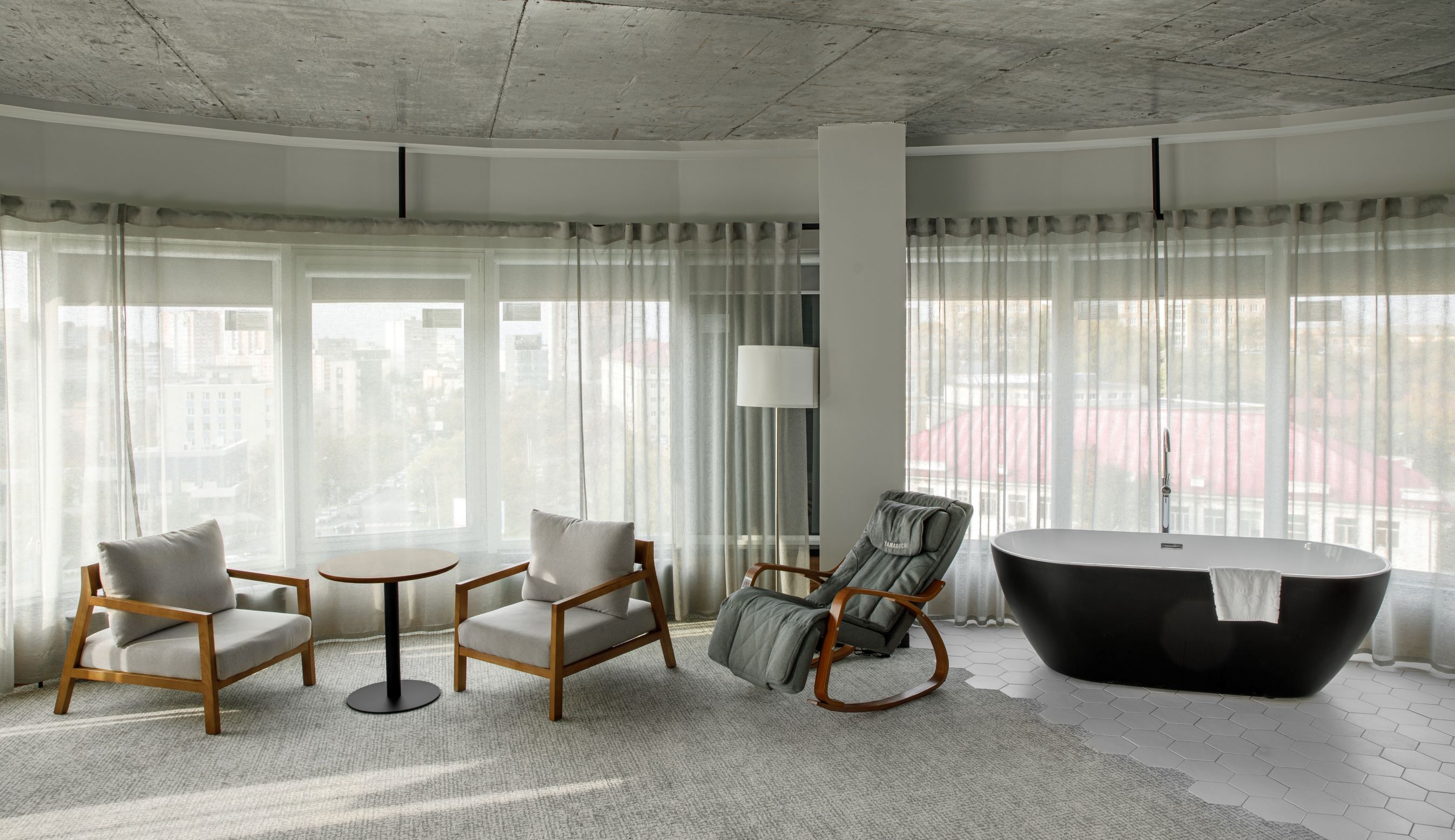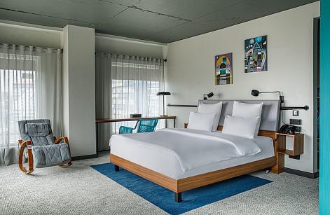 В номере: вешалка, диван, зеркало, кресла, кровать двуспальная, прикроватные тумбочки, стол, стулья, шкаф, индивидуальная система обогрева, кондиционер, кофемашина, мини-холодильник, сейф, телевизор, телефон, чайная станция, чайный набор посуды, электрочайник