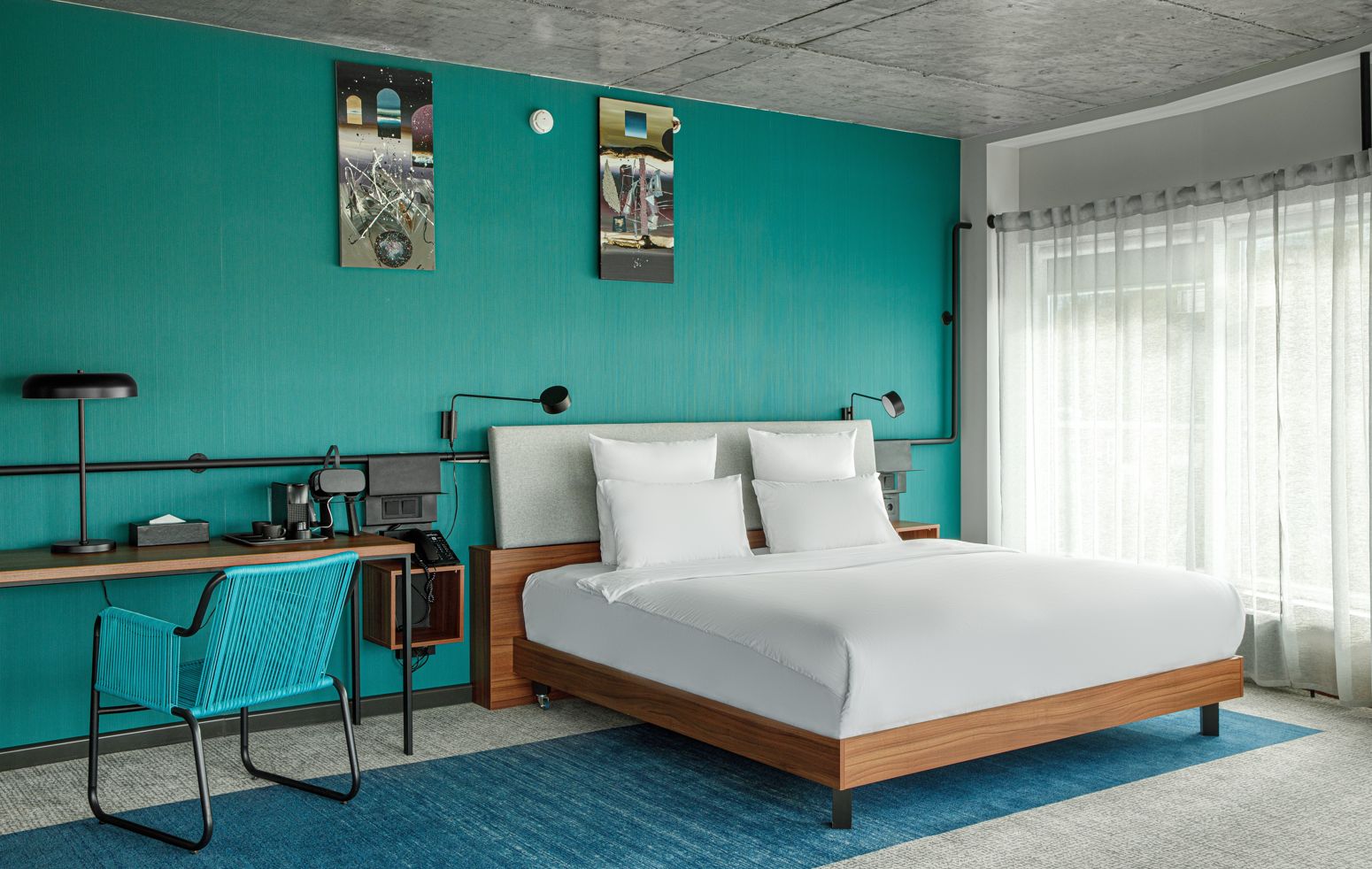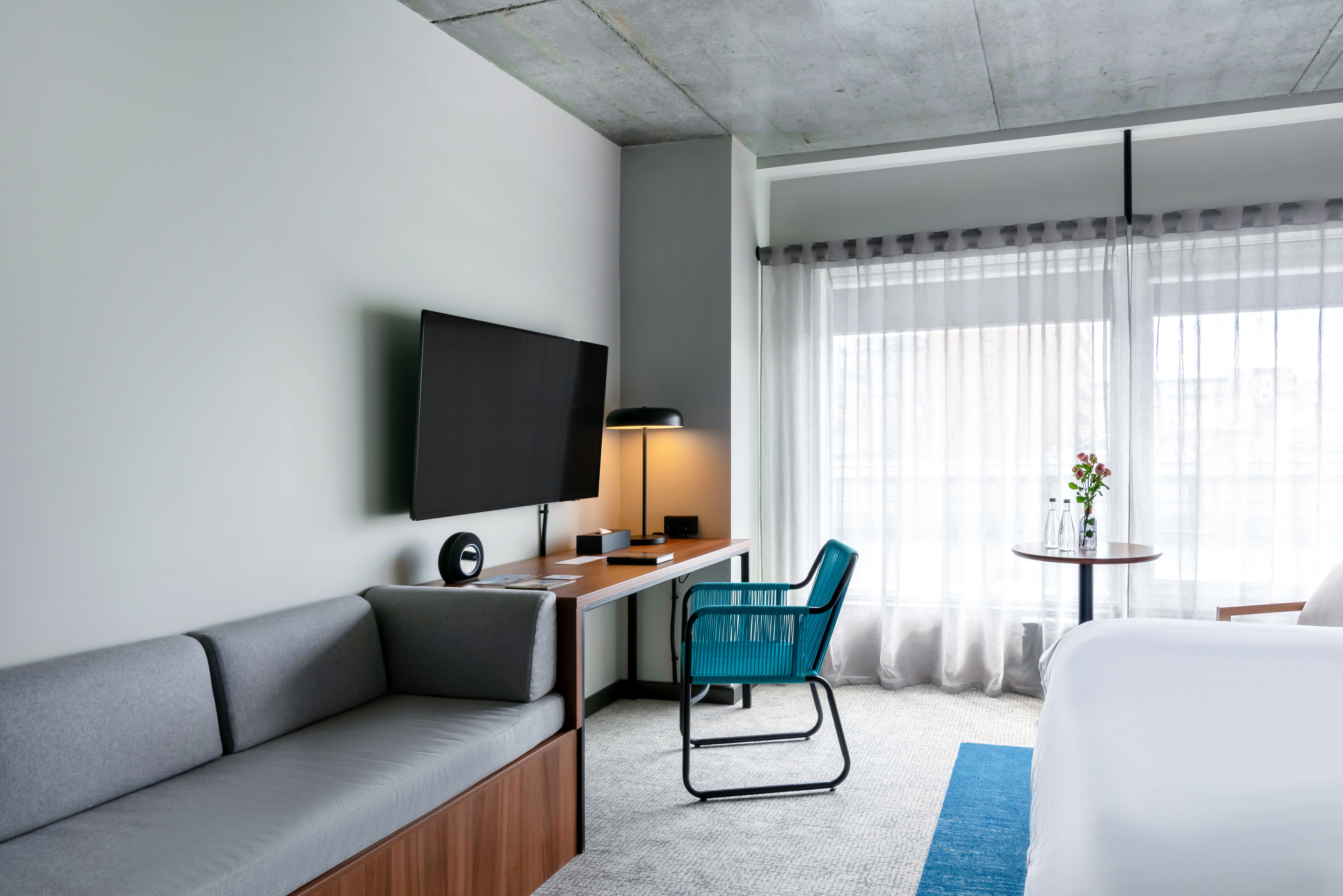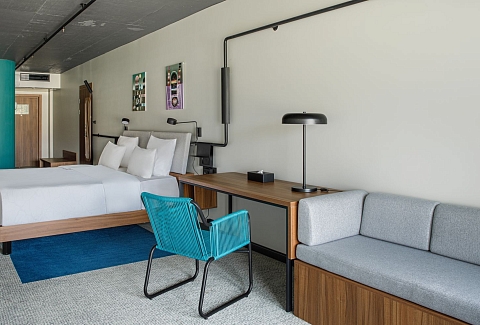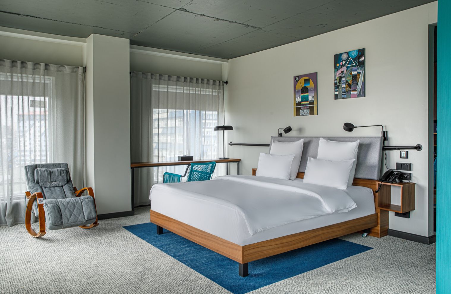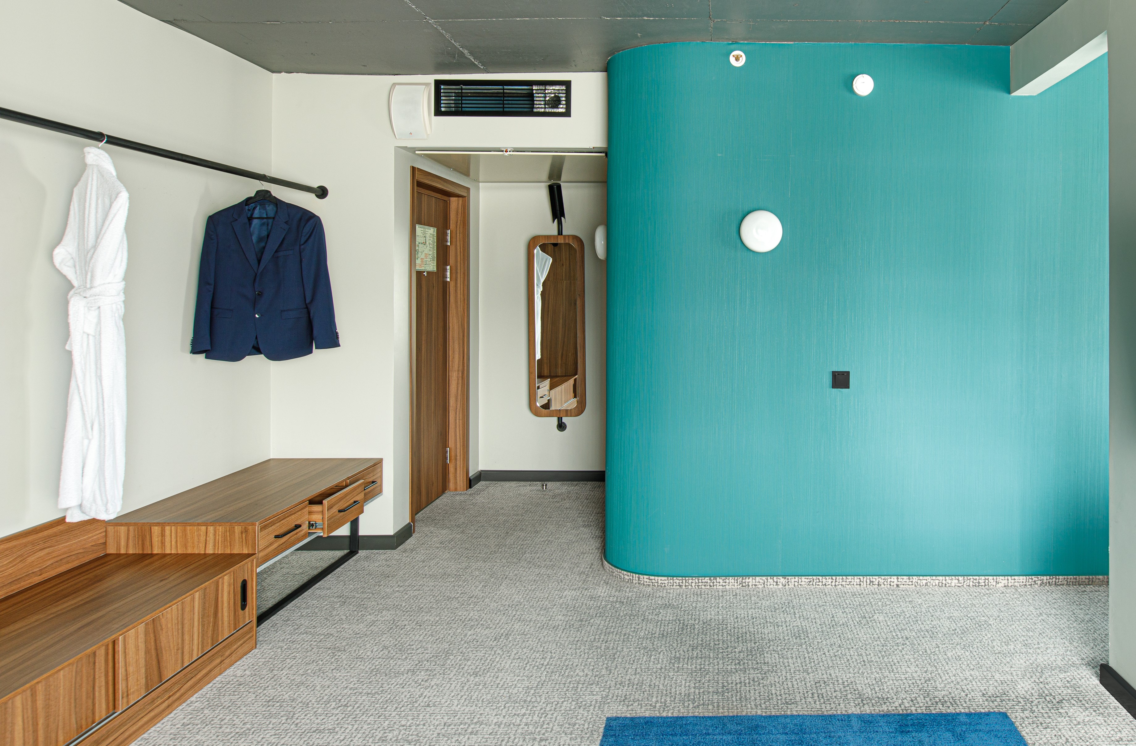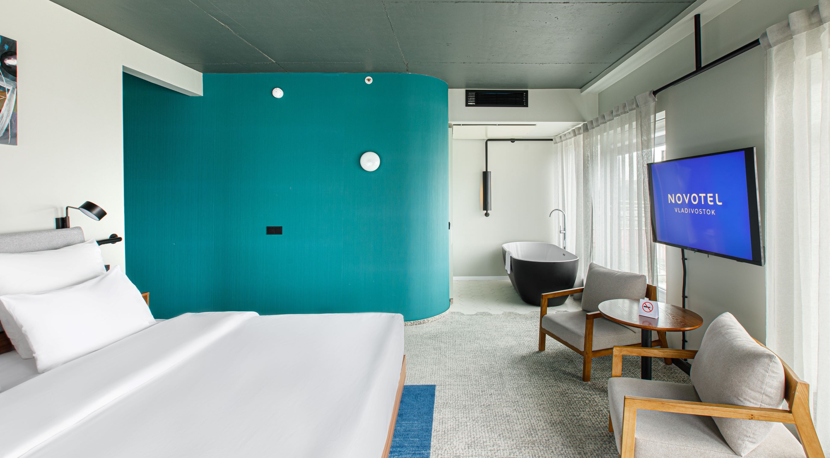 В номере: вешалка, диван, зеркало, кровать двуспальная, прикроватные тумбочки, стол, стулья, шкаф, индивидуальная система обогрева, кондиционер, мини-холодильник, сейф, телевизор, телефон, чайная станция, чайный набор посуды, электрочайник