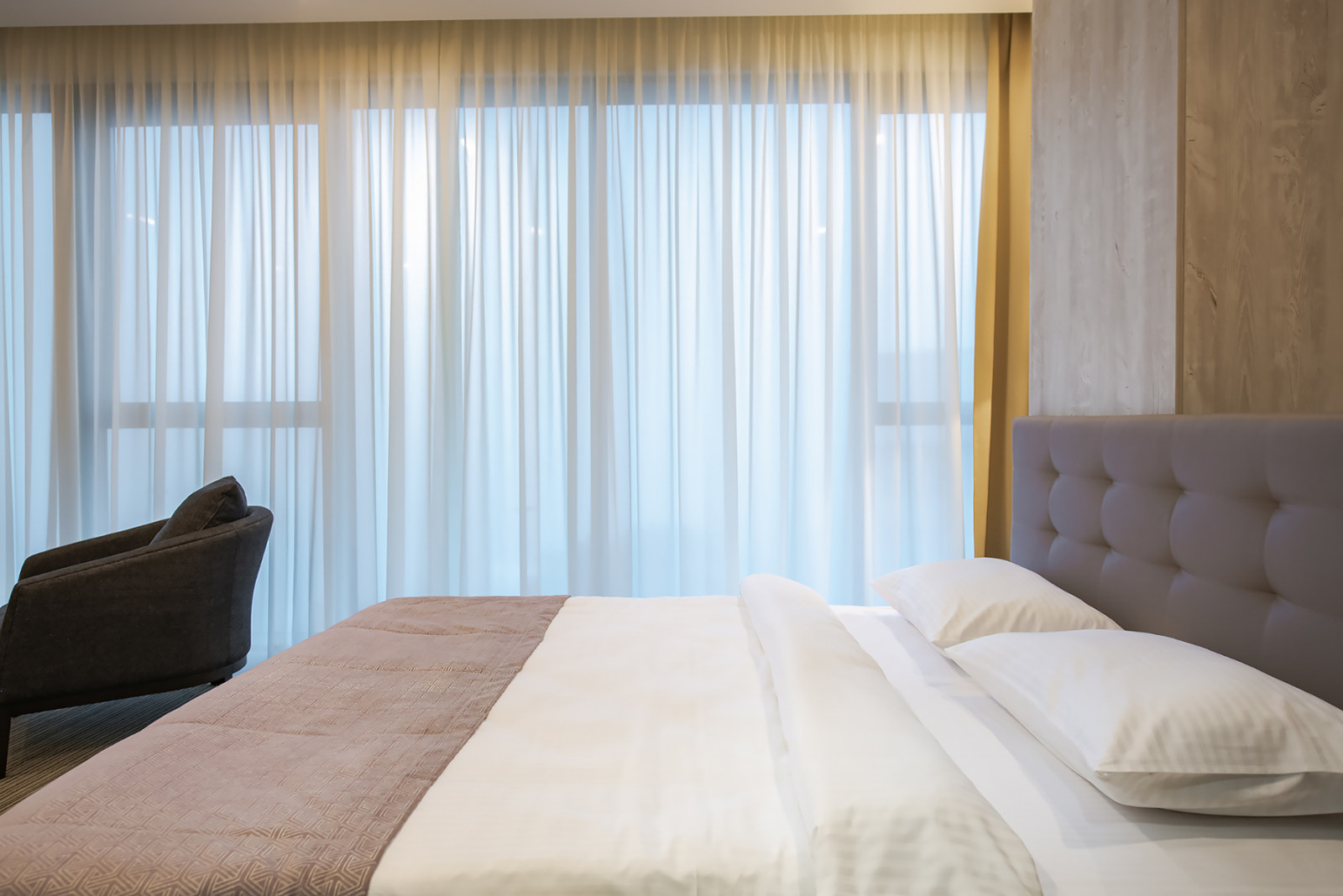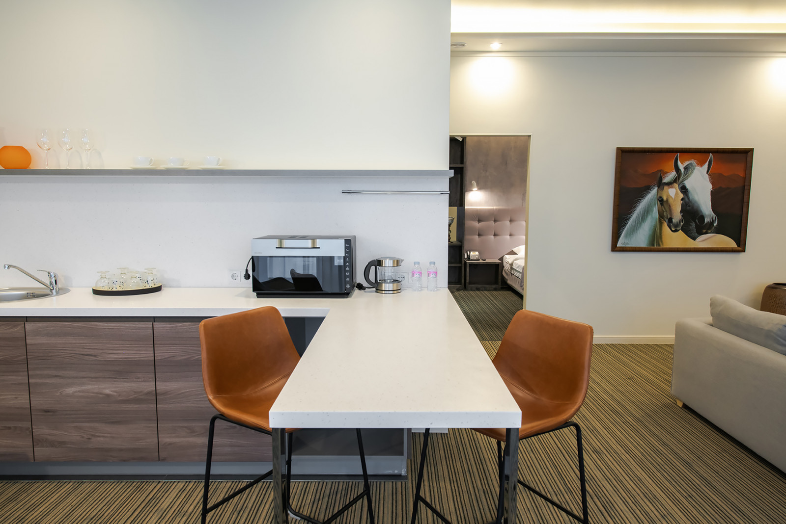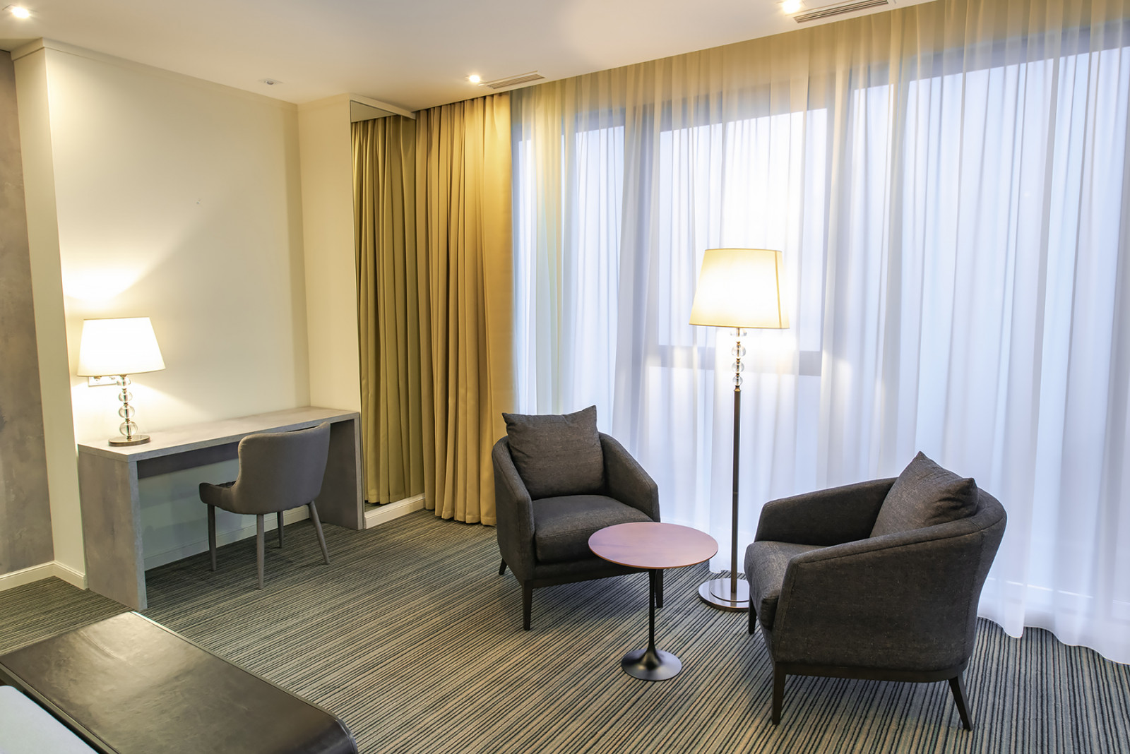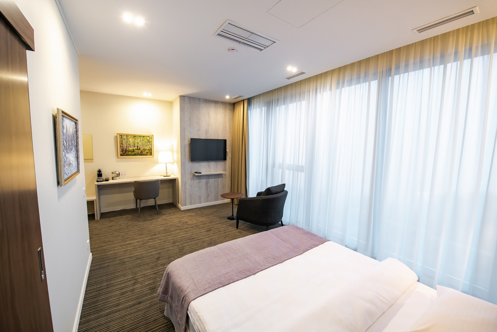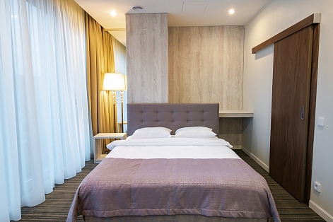 В номере: вешалка, диван раскладной, зеркало, кресла, кровать двуспальная, прикроватные тумбочки, стол, стулья, шкаф-купе, кофемашина, микроволновая печь, мини-холодильник, сейф, сплит-система, телевизор, чайная станция