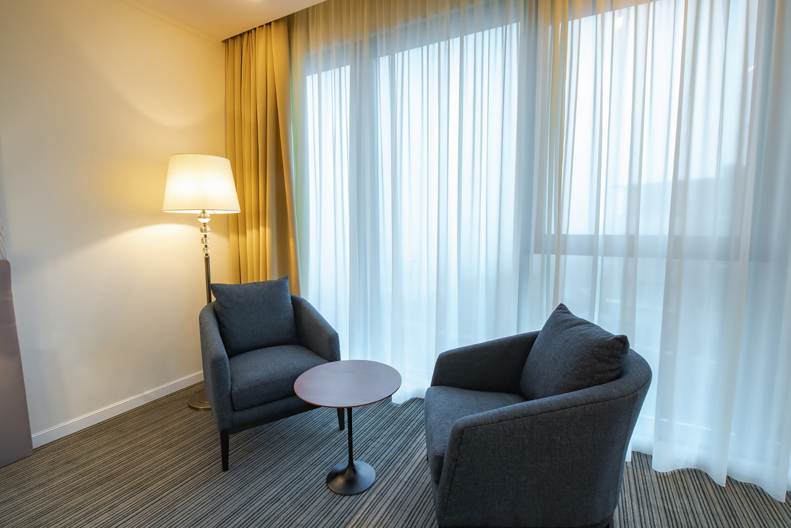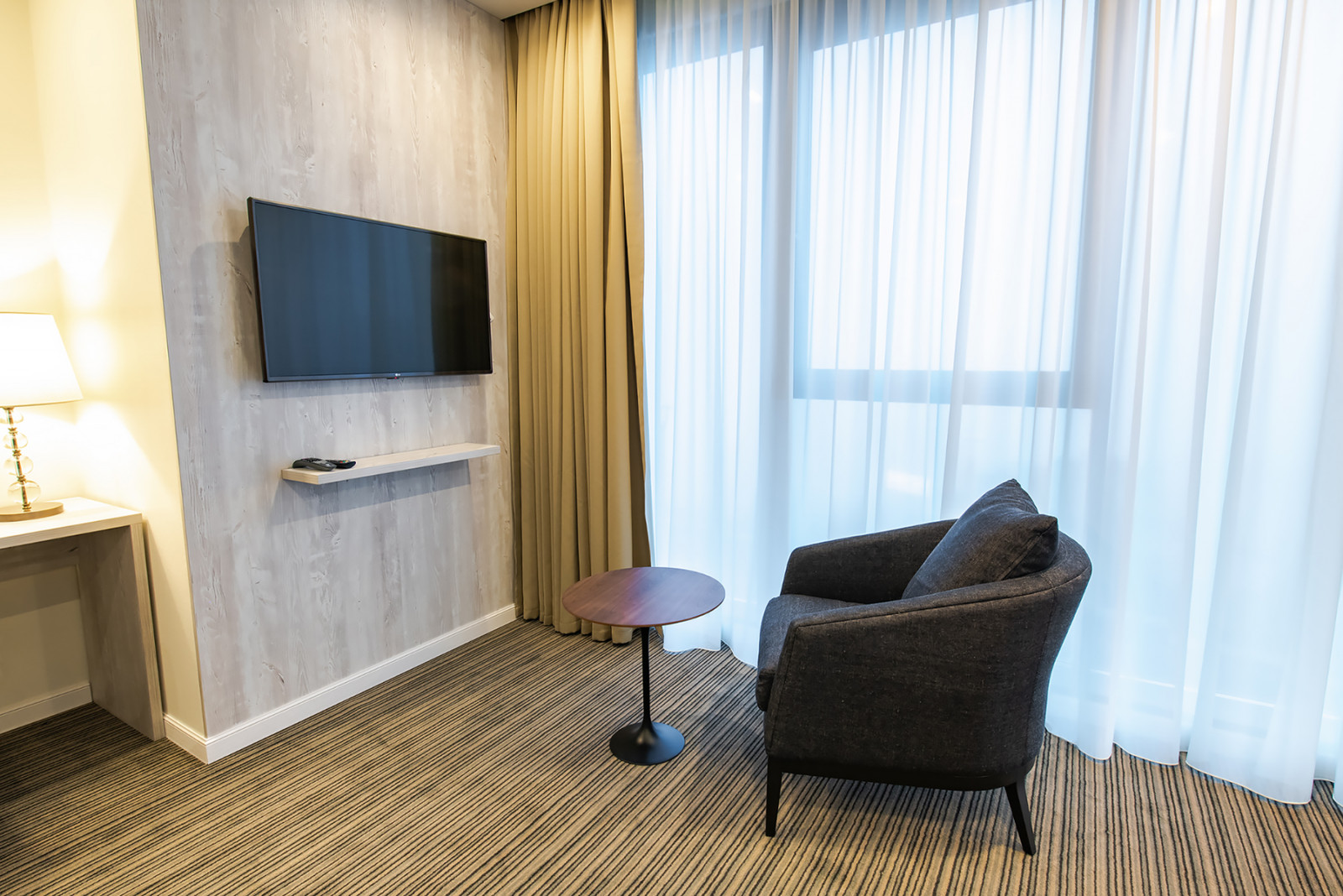 В номере: вешалка, диван раскладной, зеркало, кресла, кровать двуспальная, прикроватная тумбочка, стол, стул, шкаф-купе, кофемашина, микроволновая печь, мини-холодильник, сейф, сплит-система, телевизор, телефон, чайная станция