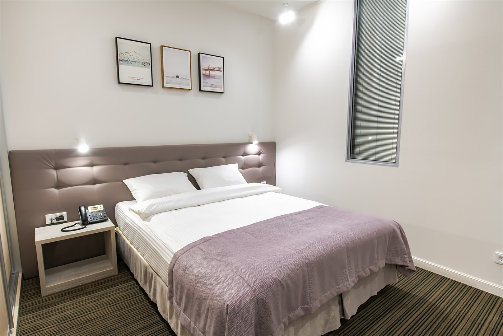 В номере: вешалка, зеркало, кресло, кровать двуспальная, прикроватные тумбочки, стол, стул, шкаф-купе, кофемашина, мини-холодильник, сейф, сплит-система, телевизор, телефон, чайная станция