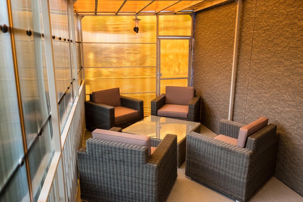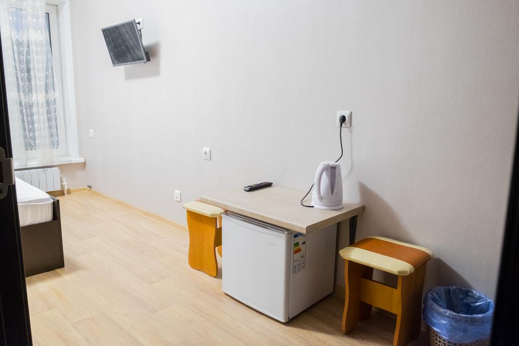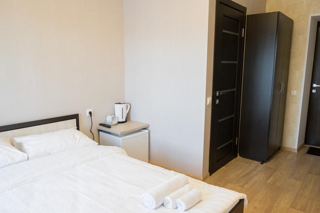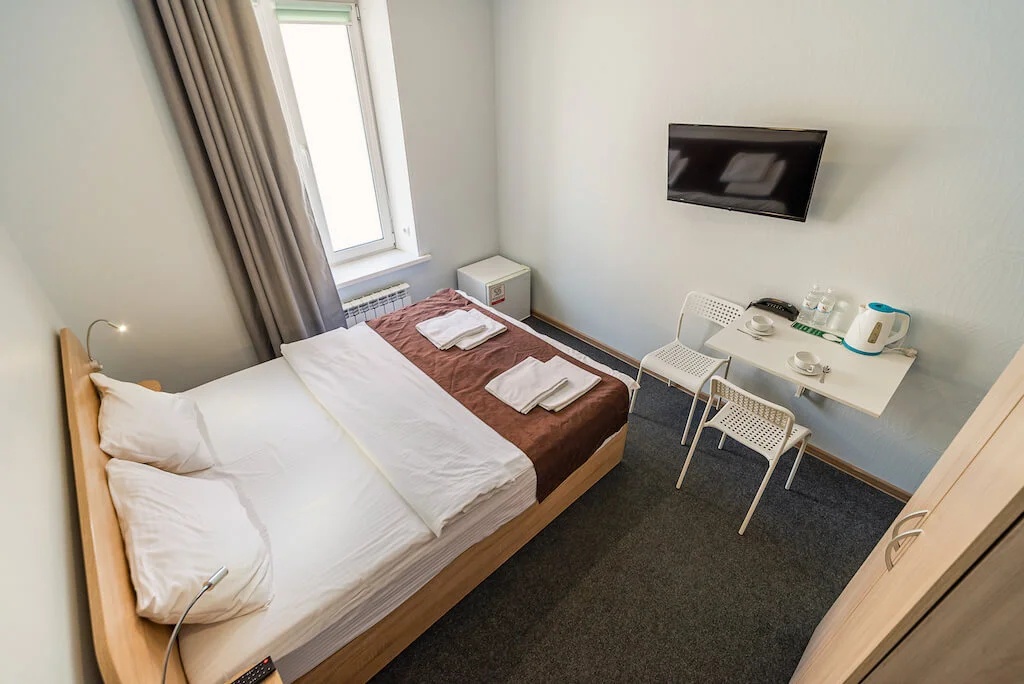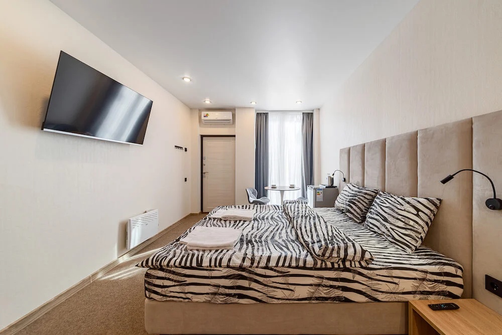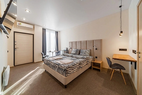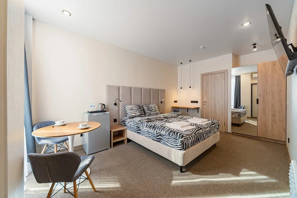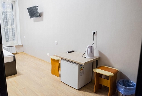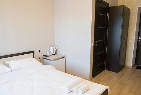 В номере: вешалка, зеркало, кровать двуспальная, прикроватные тумбочки, стол, стулья, кондиционер, мини-холодильник, телевизор, телефон, чайник