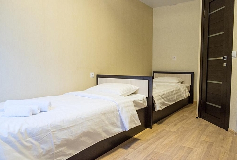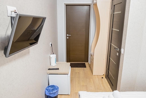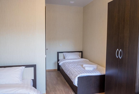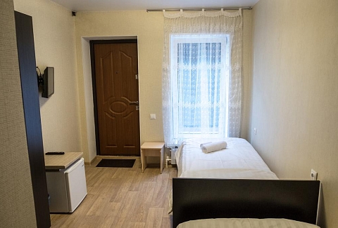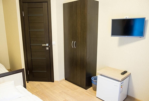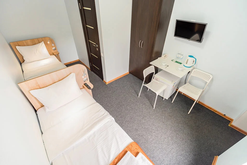 В номере: вешалка, зеркало, кровати односпальные, прикроватные тумбочки, шкаф, гладильная доска, кондиционер, мини-холодильник, телевизор, утюг, чайник