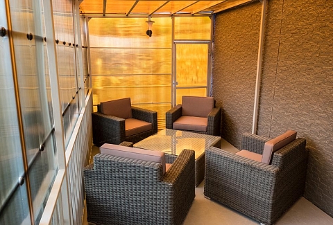 В номере: вешалка, зеркало, кровать двуспальная, прикроватные тумбочки, стол, стол обеденный, стулья, шкаф, кондиционер, мини-холодильник, сейф, телевизор, телефон, чайник