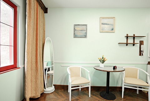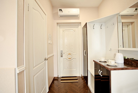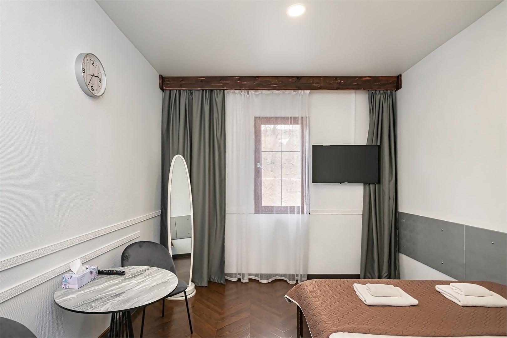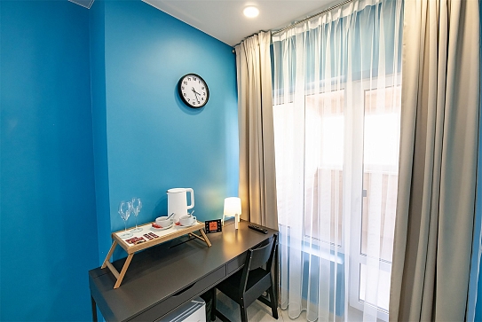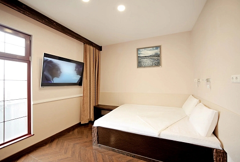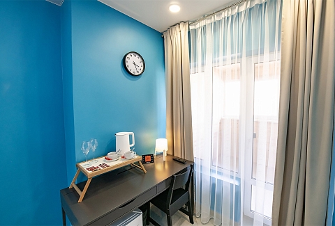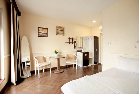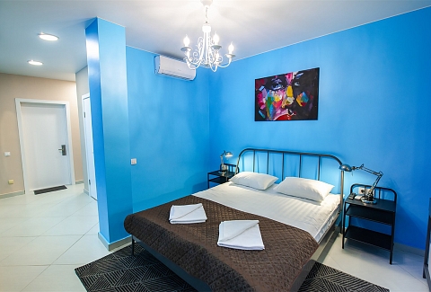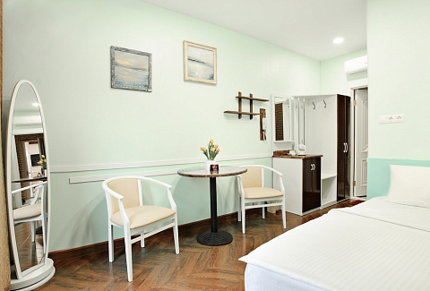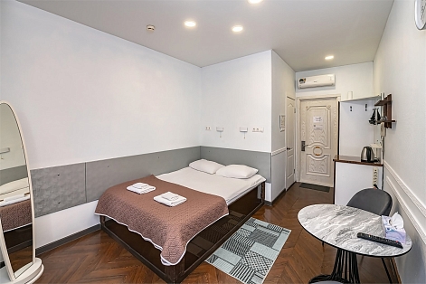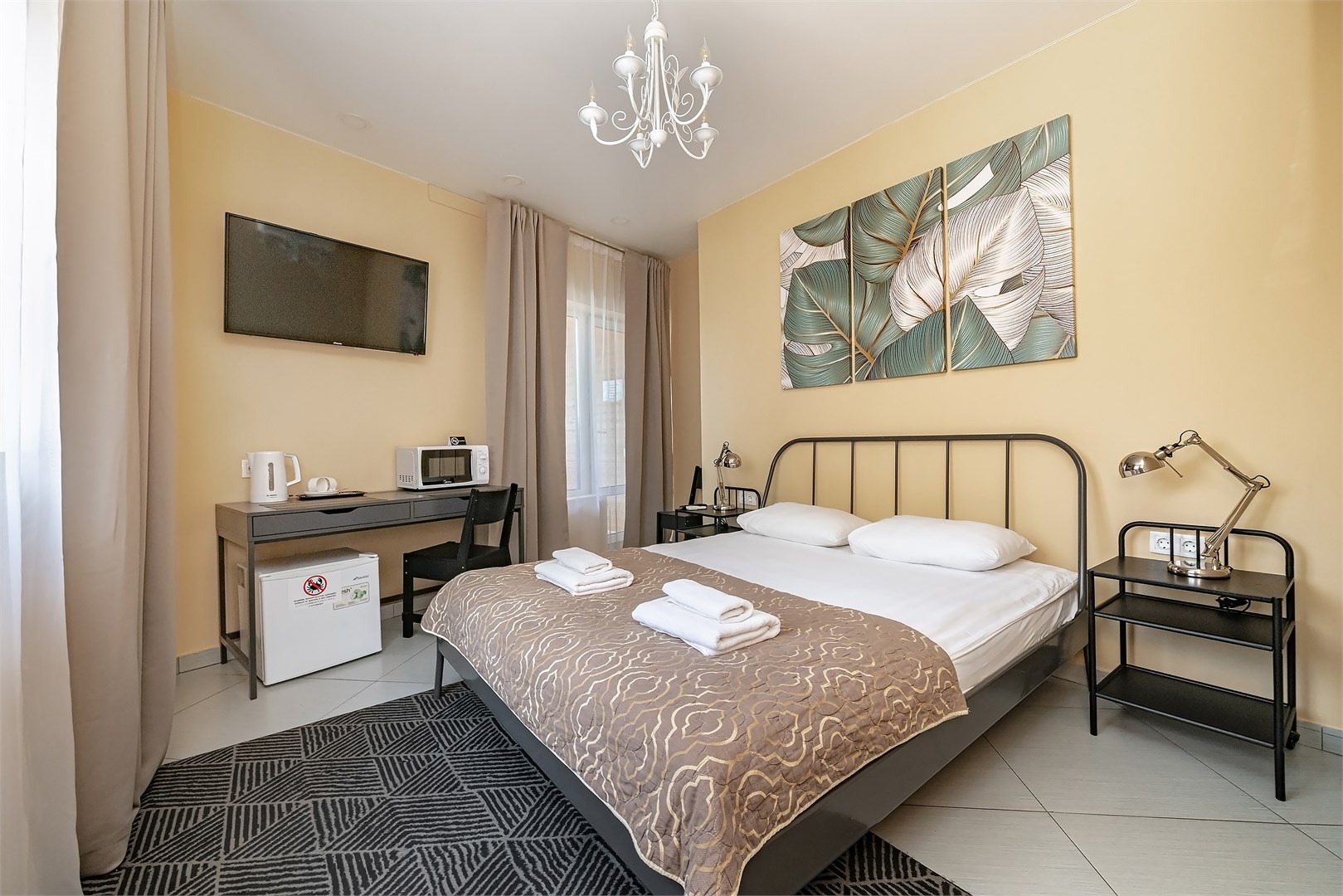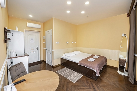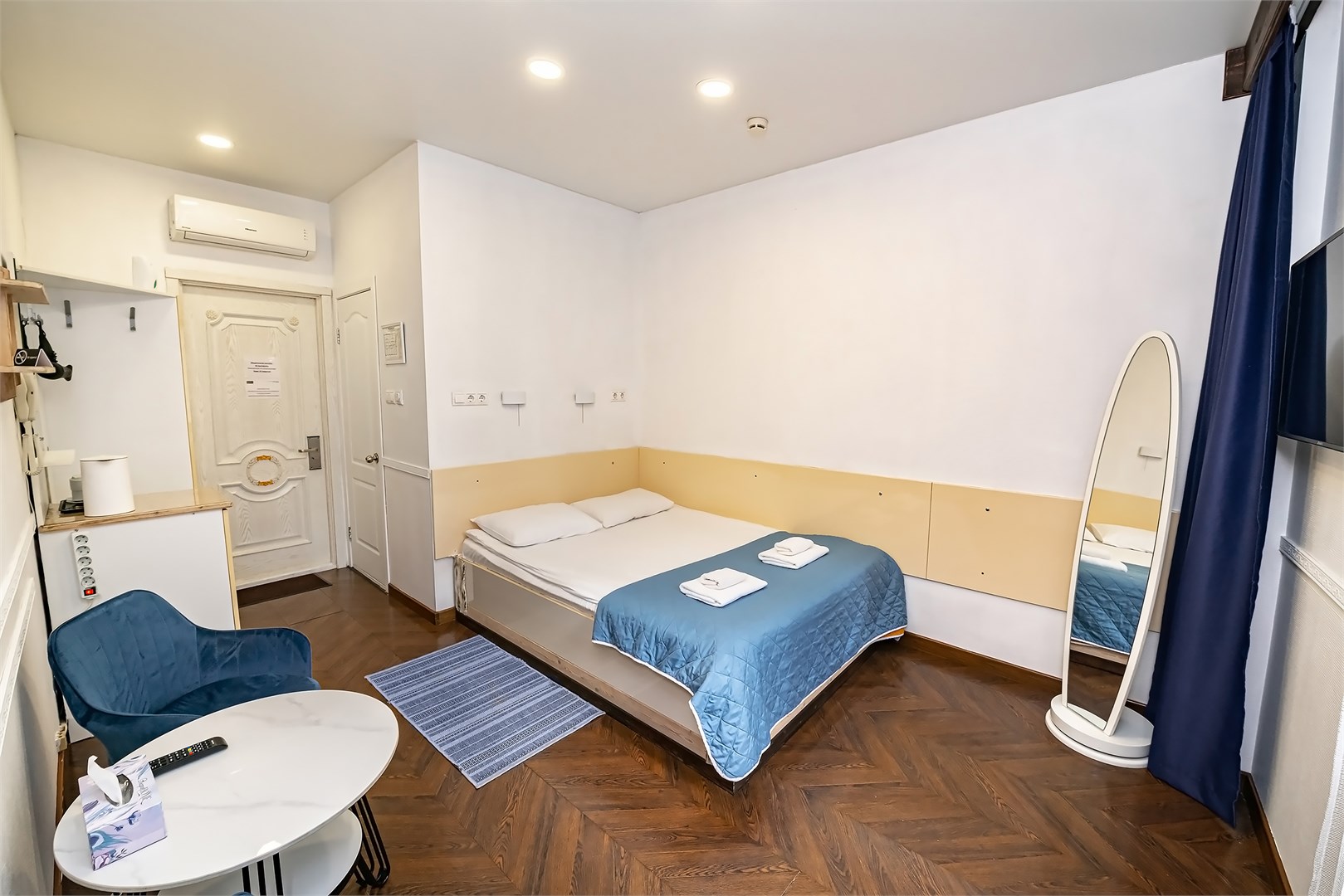 В номере: вешалка, зеркало, кровать двуспальная, стол, стулья, шкаф, кондиционер, мини-холодильник, телевизор, телефон, чайный набор посуды, электрочайник