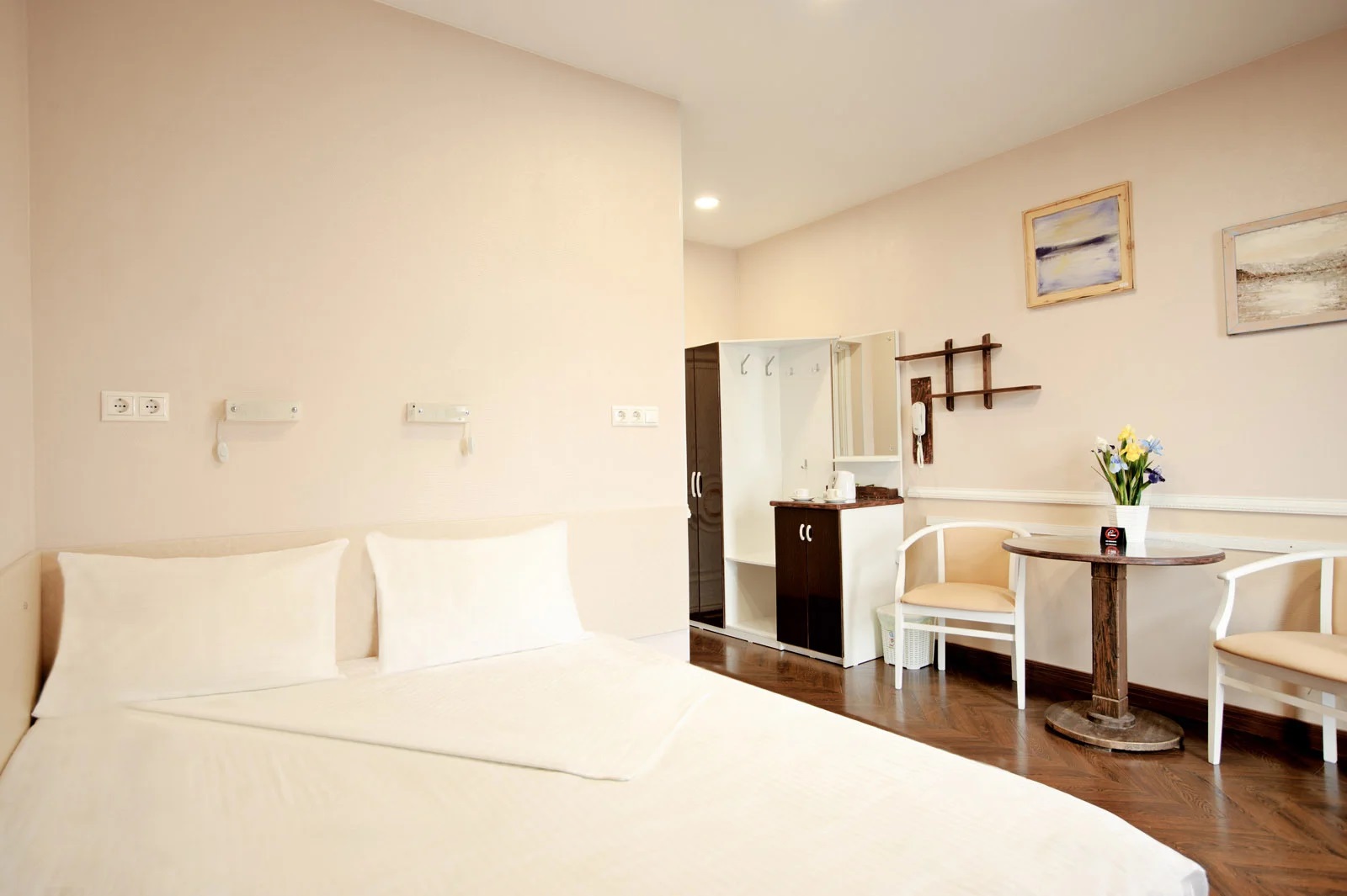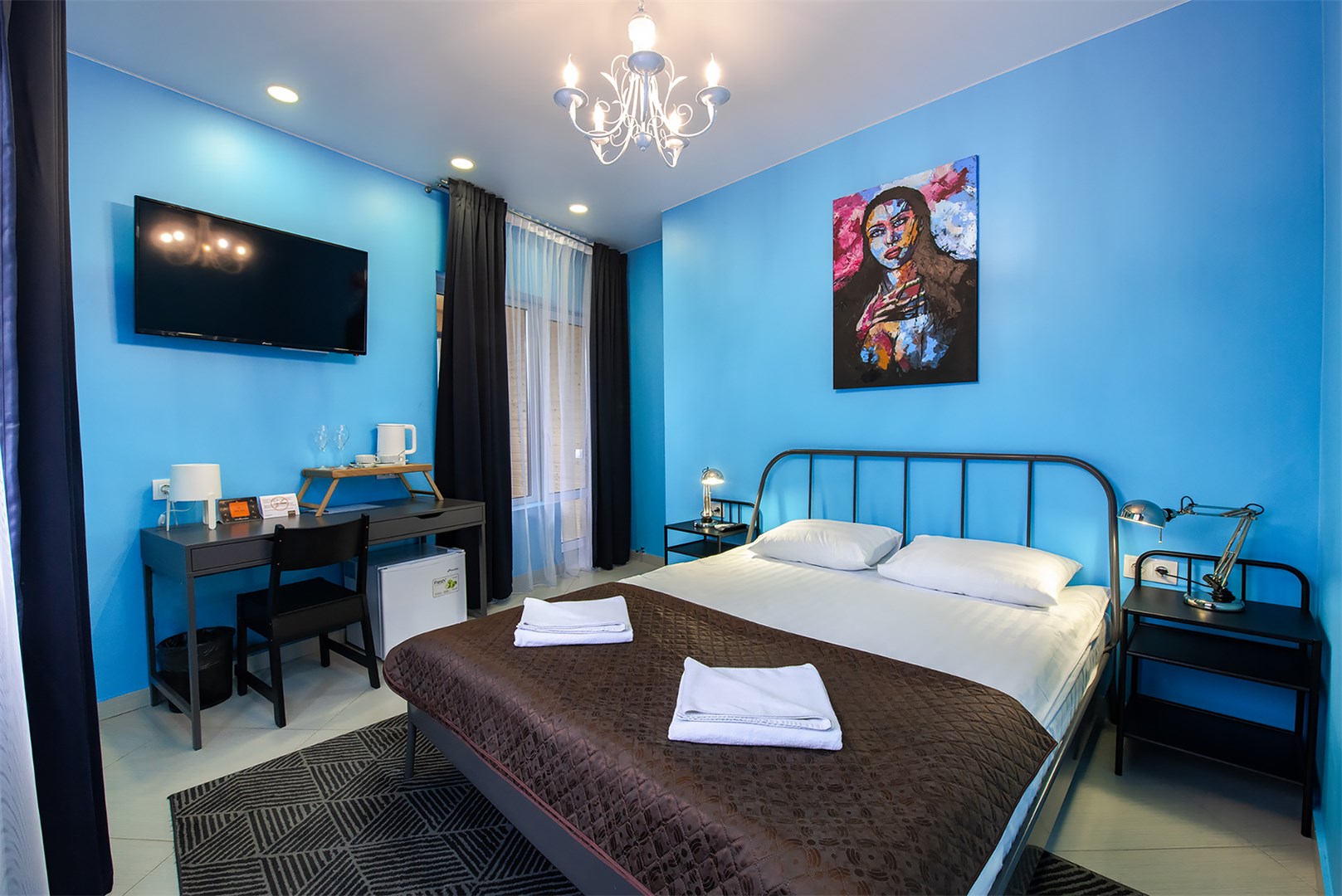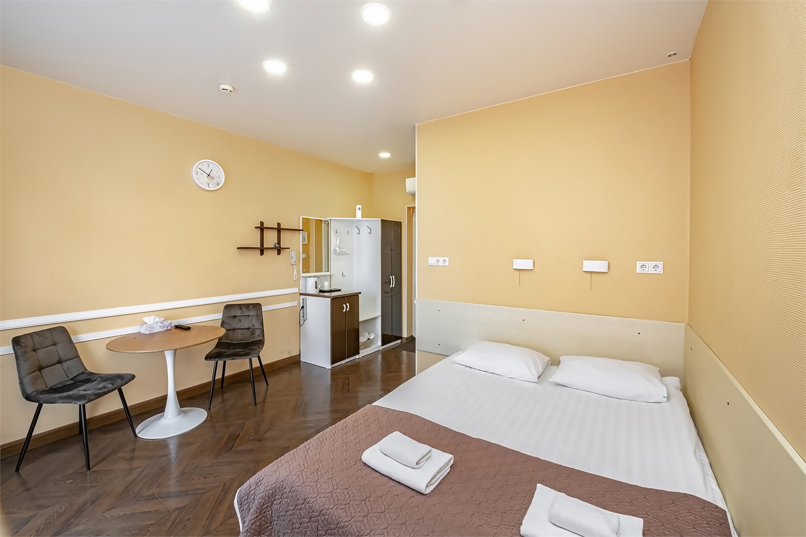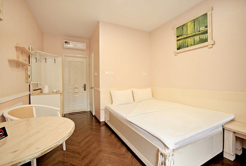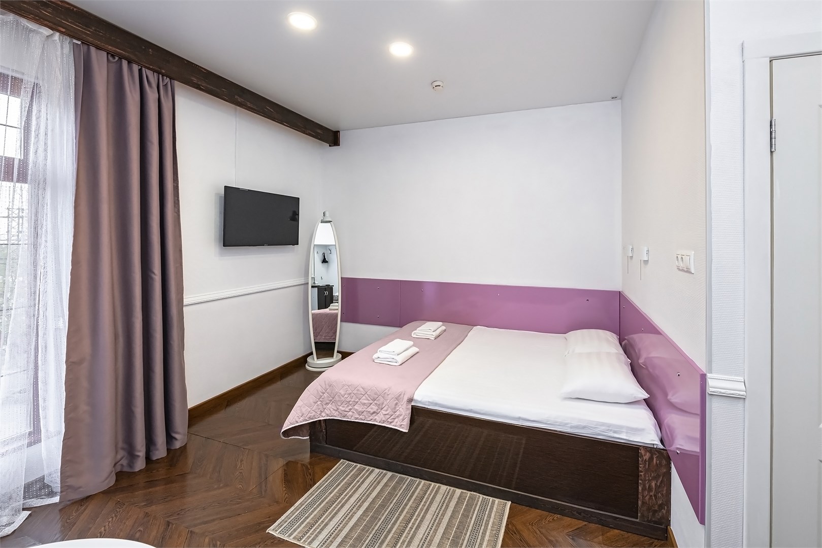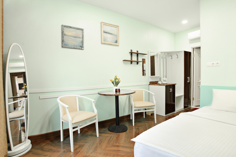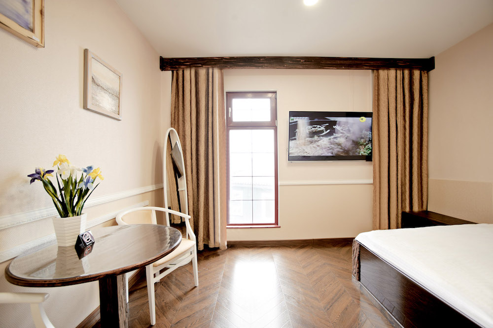 В номере: вешалка, зеркало, кровать двуспальная, стол, стулья, шкаф, кондиционер, мини-холодильник, телевизор, телефон, чайный набор посуды, электрочайник