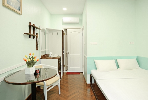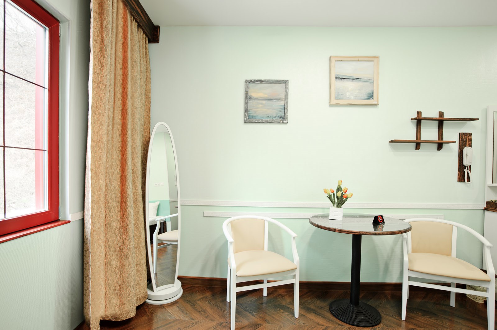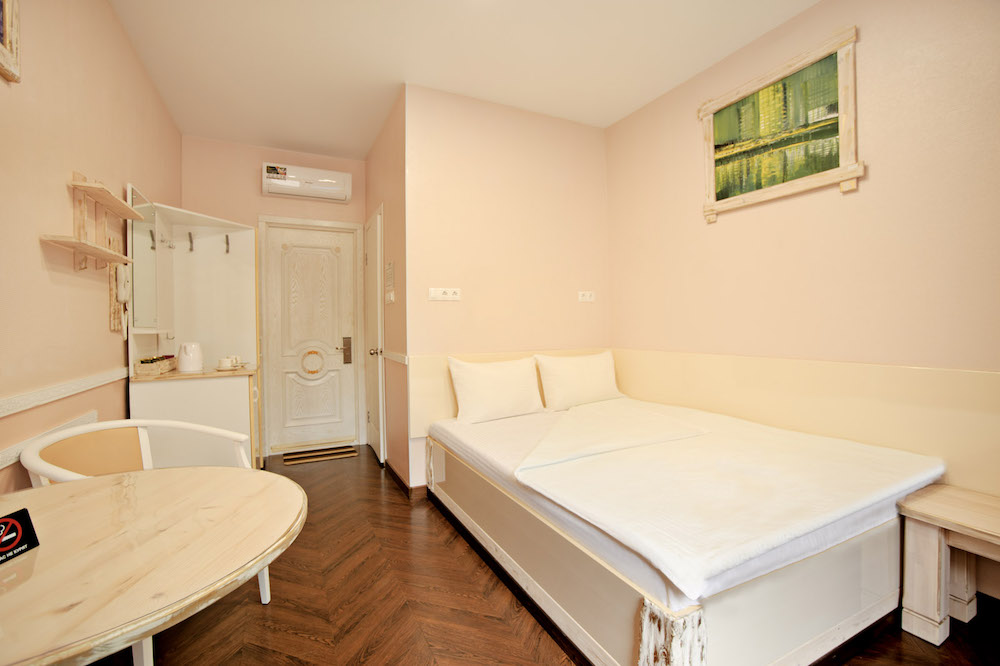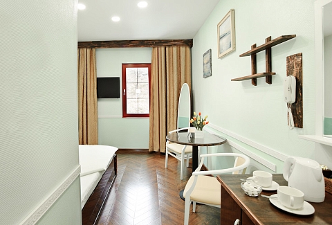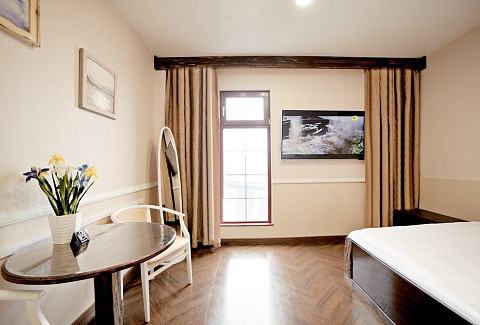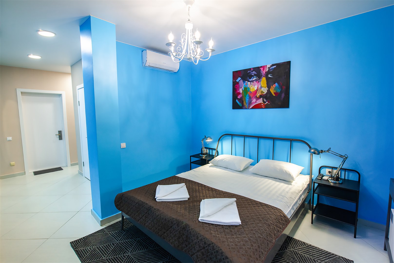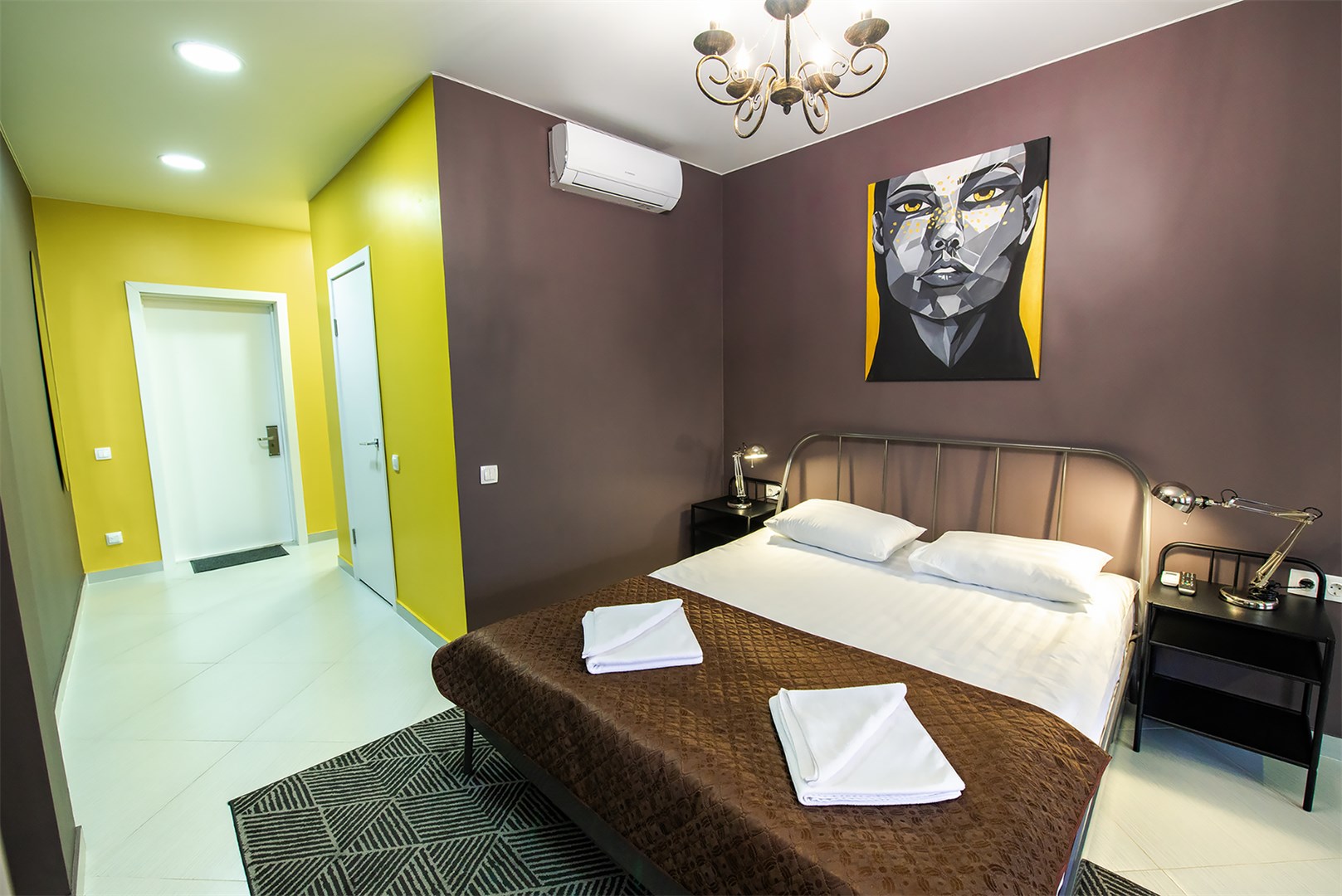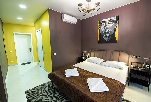 В номере: вешалка, зеркало, кровать двуспальная, стол, стулья, шкаф, кондиционер, мини-холодильник, телевизор, телефон, чайный набор посуды, электрочайник