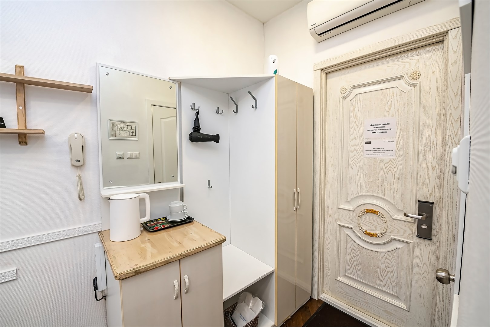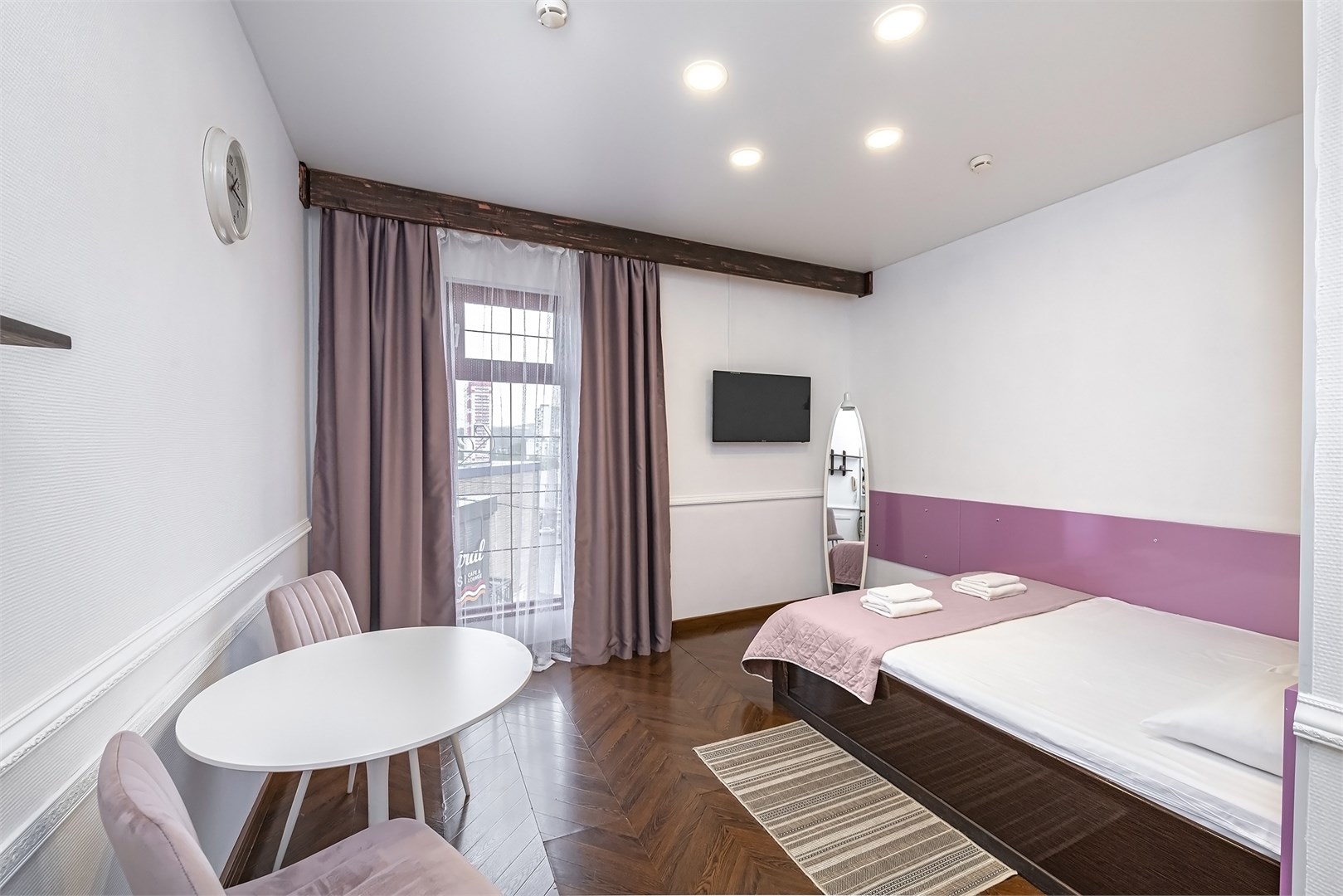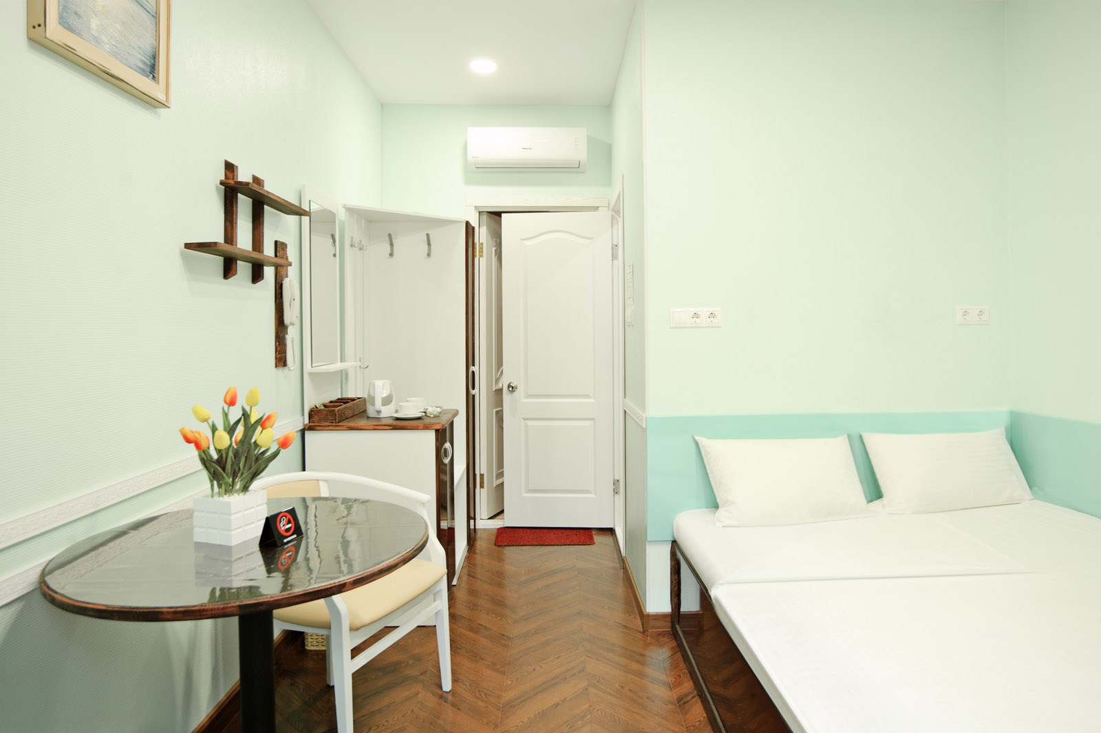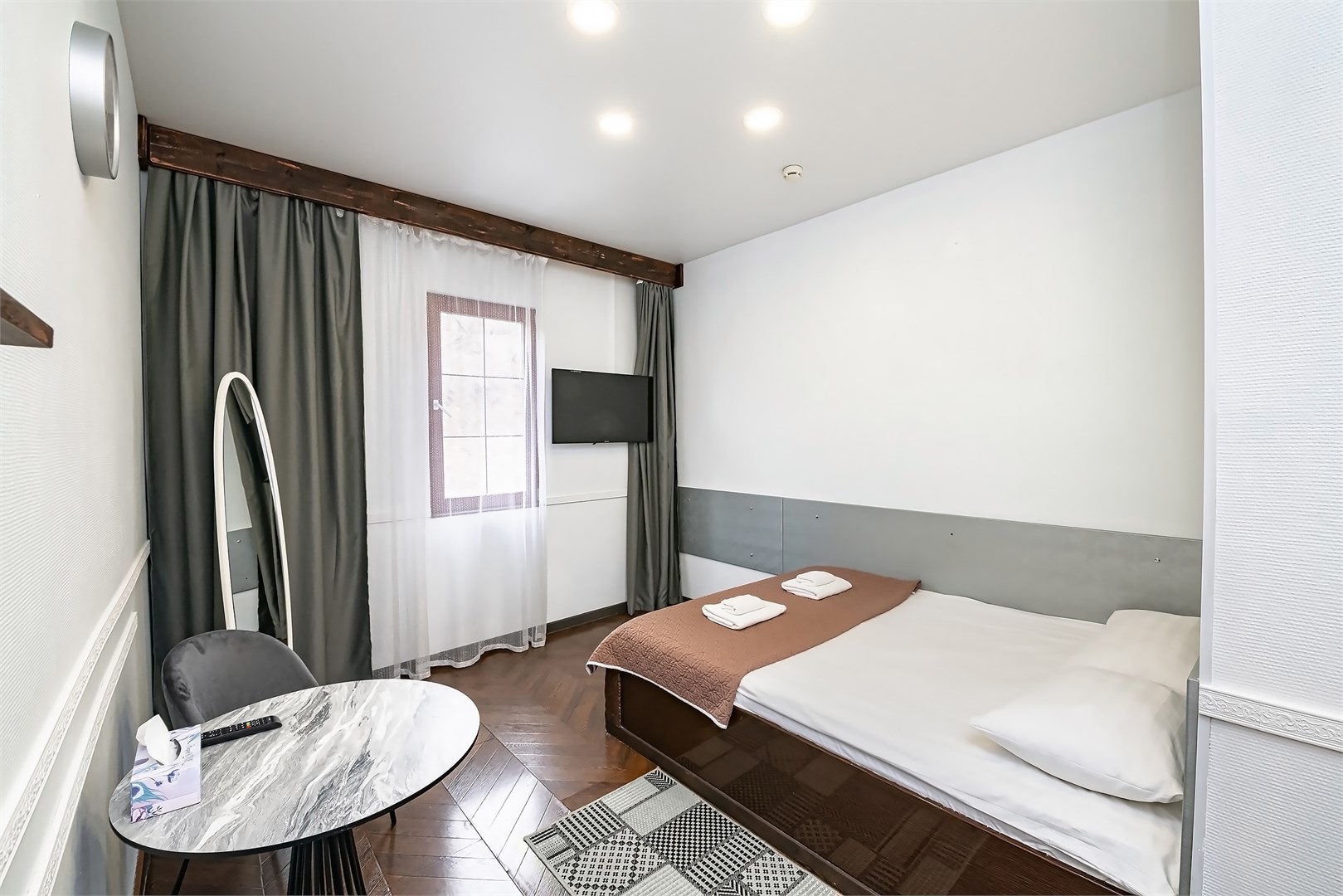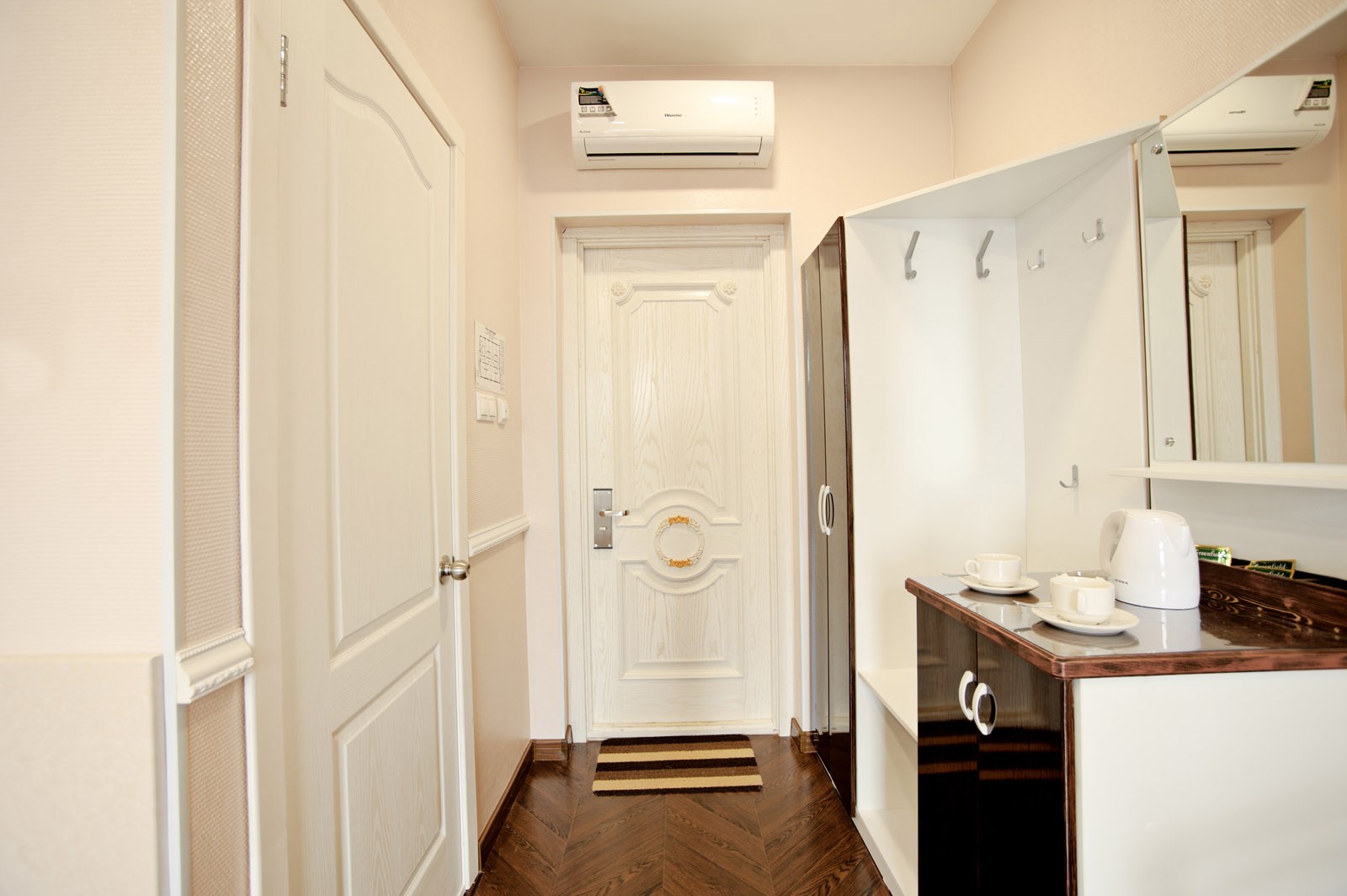 В номере: вешалка, зеркало, кровать двуспальная, стол, стулья, шкаф, кондиционер, мини-холодильник, телевизор, телефон, чайный набор посуды, электрочайник